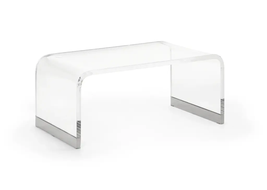 Anchor your room living room with this contemporary Acrylic Waterfall coffee table by Chelsea House! Its clean lines and acrylic material offer versatility to match a variety of styles while offering a bold statement. Featuring Antique Brass or Nickel Feet, this coffee table will elevate any room and is sure to be the envy of all your friends! Dimensions: 41.5in W x 22.5in D x 18in H Finish: Clear, Antique Brass Material: Acrylic, Metal Weight: 32lbs Free shipping in the U.S.