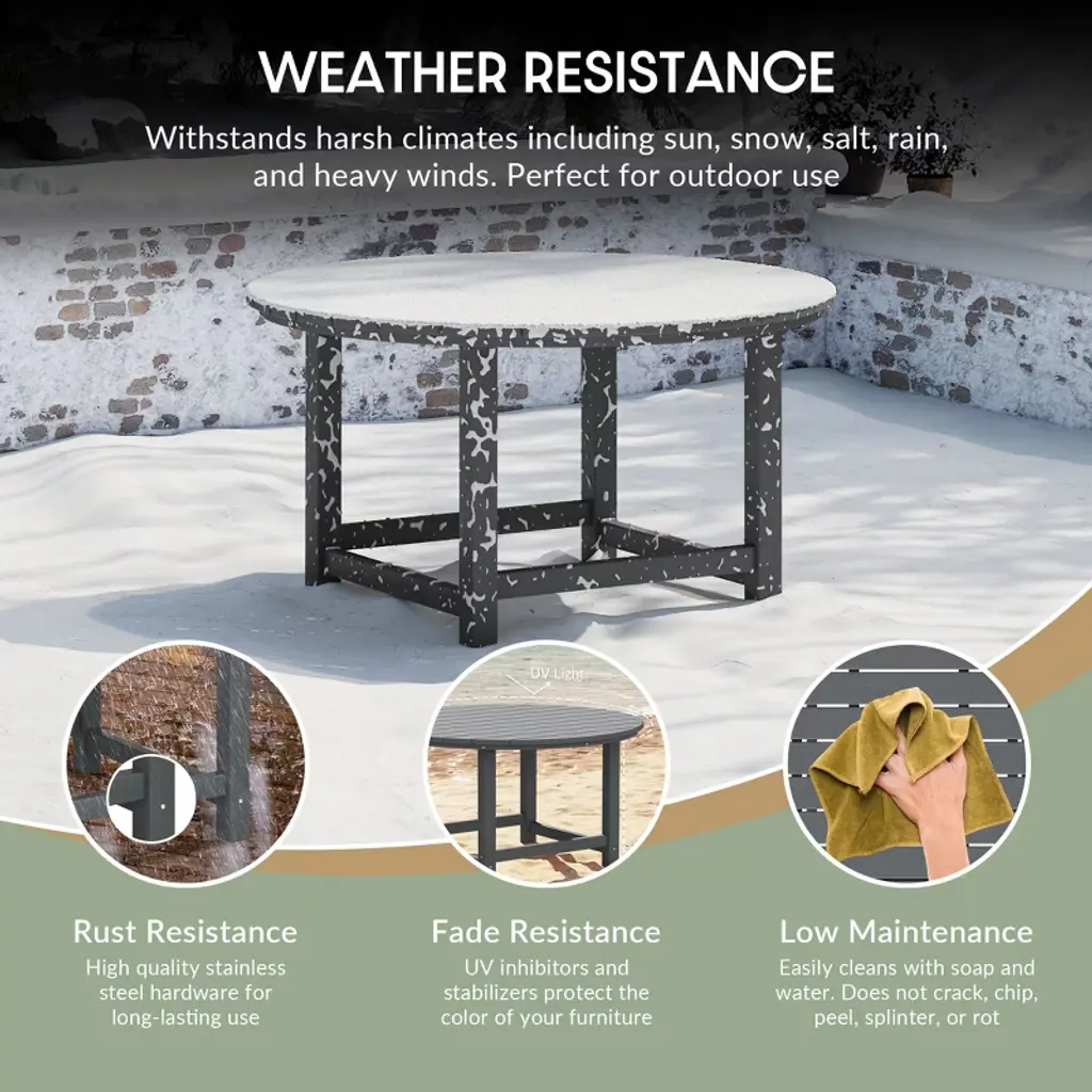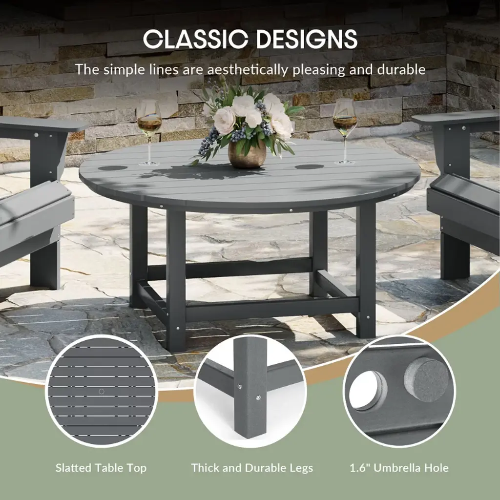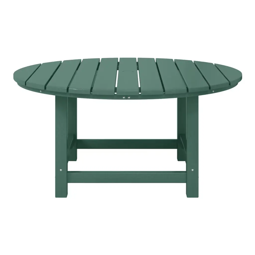 Gather with friends or loved ones around our endearing round outdoor coffee table. Made with a durable HDPE material that is durable and all-weather resistant, UV and fade-resistant to ensure that charming color stays season long. Designed for stability and durability with thick legs and a reinforced table top to reduce wobbling. Fitted with a 1.5-inch umbrella hole to add extra shade and can fit most standard umbrellas and tied with the 38" inch wide table top ensures plenty of space for snacks and drinks.While we strive to accurately represent product colors, please be aware that actual colors may vary slightly due to individual screen settings and lighting conditions. FeaturesConstructed from Durable HDPE Material and Designed to be Stable and SturdyWeather Resistant to Protect Against the Harsh Outdoor ElementsFade and UV Resistant to Protect Against the Sun38" Inch Wide Table Top Fitted with a 1.5" Center Umbrella Hole to that Fits Most Standard Umbrellas (Umbrella Sold Seperately;Hole Cover Included)Reinforced Table Top Design for Added Durability and Thick Legs with Beam Connection for Added StabilitySmooth and Rounded Edges for Added Protection Against Scratches or BruisesDurable and Tough with the All-Weather Material that is Resistant to Splinters, Cracking, or Peeling and Simple to Clean with Lukewarm Water, Mild Soap, and a Soft Bristle BrushDetails:Product Type: Patio Coffee TablesWhat's Included: (1) Coffee TableCoffee TableDimensions: 37.75" W x 37.75" D x 17.5" HWeight: 40.5 lbs.Coffee TableDimensions: 37.75" W x 37.75" D x 17.5" HWeight: 40.5 lbs.