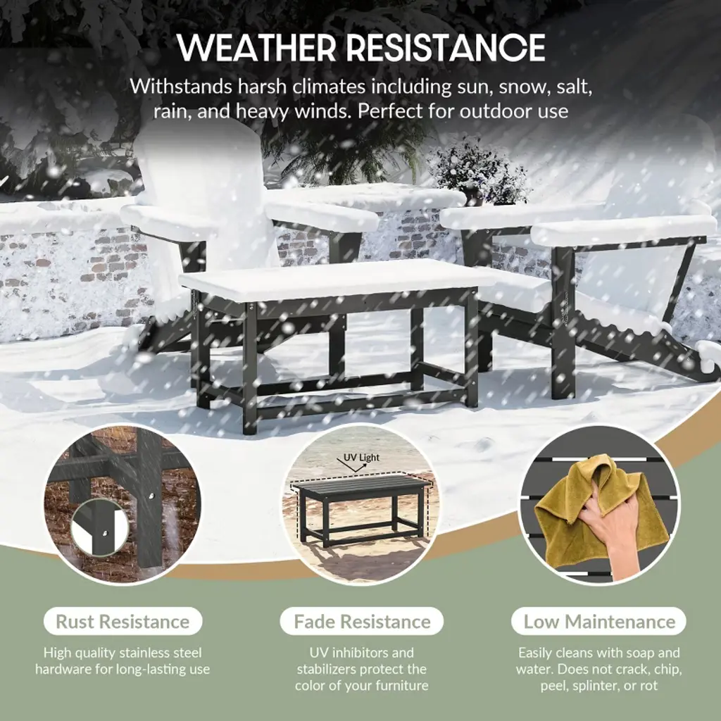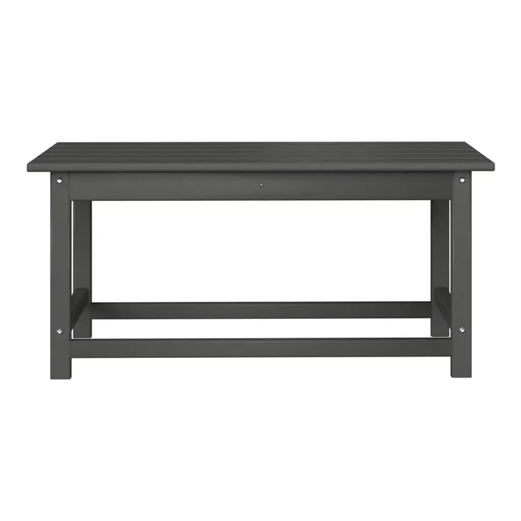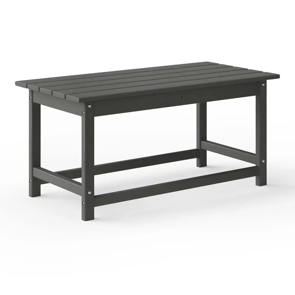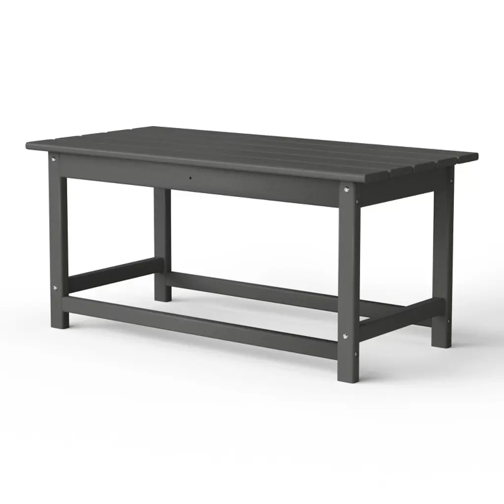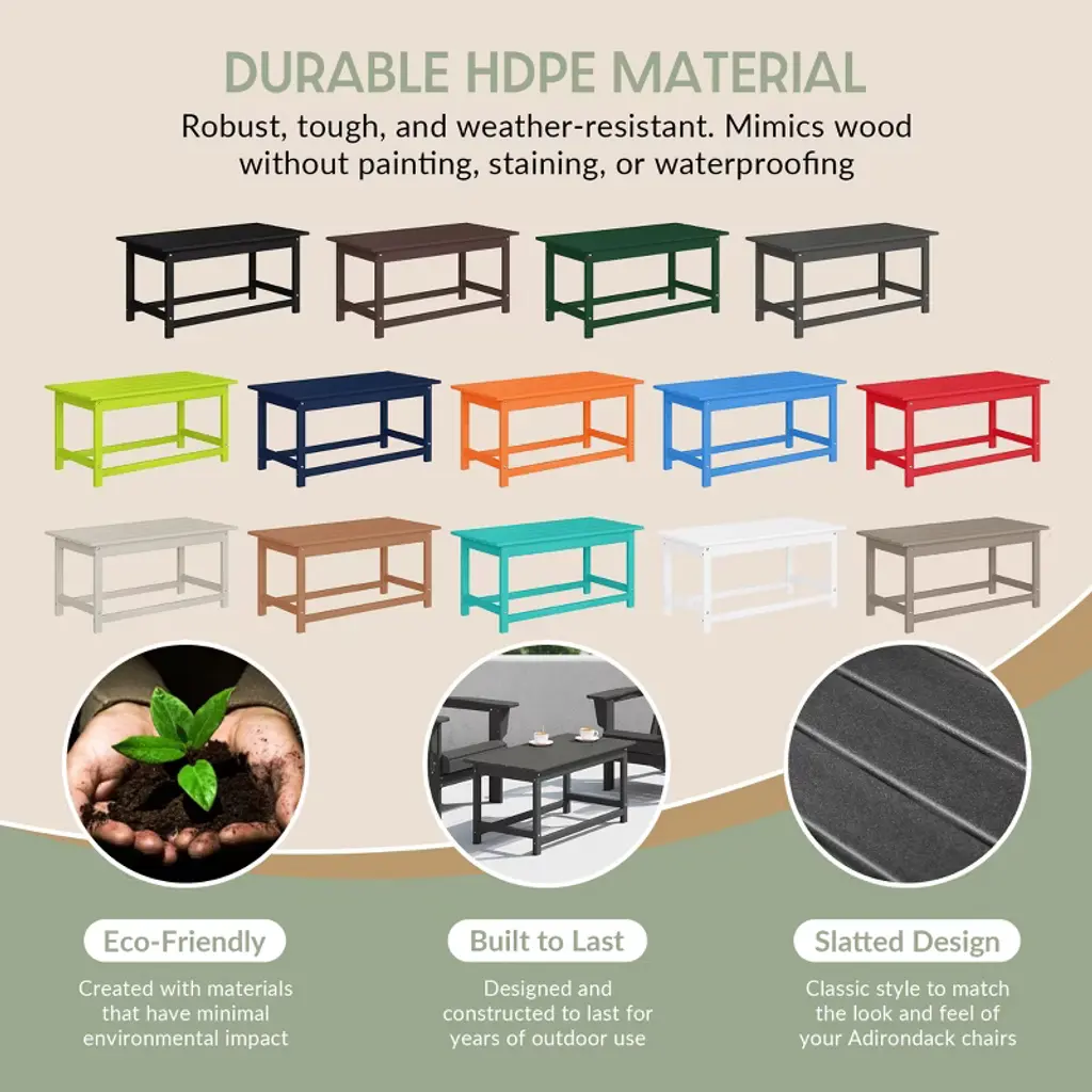 Having a place to sit is always the first thing on your mind when furnishing, but don't forget about the accessories that make it shine! This 35" inch coffee table is sure to complete your patio or living room and match with your Adirondack chairs. Created with eco-friendly HDPE material adds durability and can withstand the outdoor elements thanks to the HDPE's natural UV and weather resistant. The table is made to look like natural wood without any of the disadvantages of natural wood, meaning that this table isn't prone to splinters, cracks, or peeling. This table is perfect for the outdoors and will have your home looking great with the semi-gloss finish that is sure to shine.While we strive to accurately represent product colors, please be aware that actual colors may vary slightly due to individual screen settings and lighting conditions. FeaturesDurable Eco-friendly HDPE lumberWeather and UV resistant treated materialFade resistant colorsStainless steel hardwareSimple to cleanDetails:Product Type: Patio Coffee TablesWhat's Included: (1) Coffee TableCoffee TableDimensions: 35.25" W x 17.5" D x 16" HWeight: 21 lbs.Weight Capacity: 220 lbs.Coffee TableDimensions: 35.25" W x 17.5" D x 16" HWeight: 21 lbs.Weight Capacity: 220 lbs.