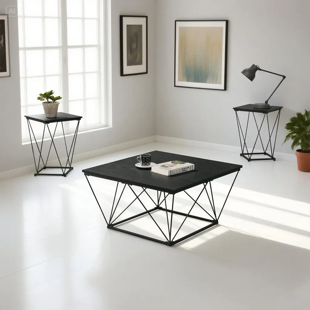Modern 3-piece coffee table set featuring angular metal bases, a sleek whetstone finish, and a versatile mix of engineered wood and metal for a stylish, functional living space.【Modern Geometric Design】 :Features angular and geometric metal bases, adding a contemporary and stylish look to any living space.【3-Piece Set】 :Includes one coffee table (31.5"W x 30.5"D x 17"H) and two matching end tables (15.5"W x 15"D x 22.5"H) for a coordinated setup.【Durable Construction】 :Made with a combination of materials including metal (for the base), engineered wood, and paper composite, ensuring sturdiness and longevity.
