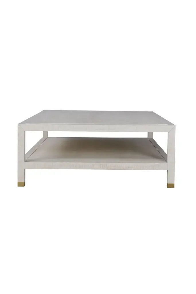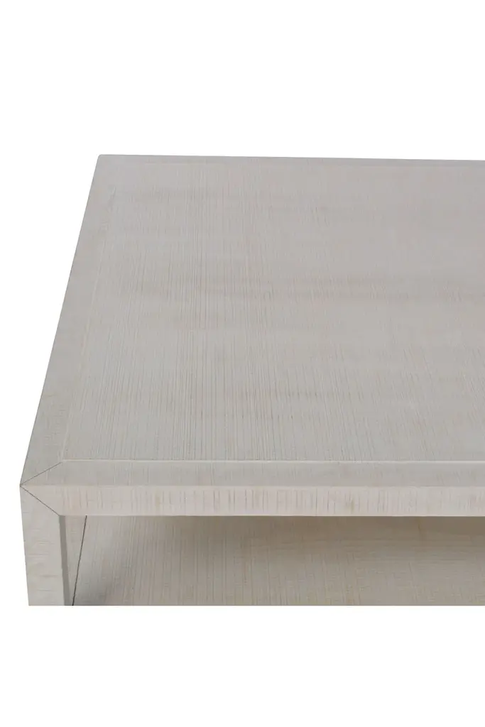 A grand, white, coffee table crafted from multi-directional rough sawn ash solids and veneers to give the illusion of woven linen. Create textural visual interest in a neutral minimalist space with this exquisite piece.