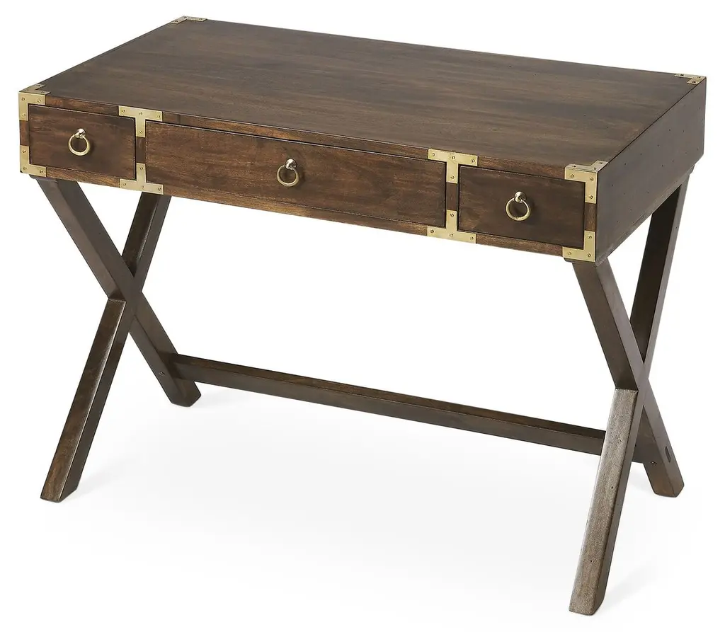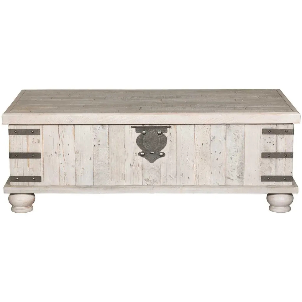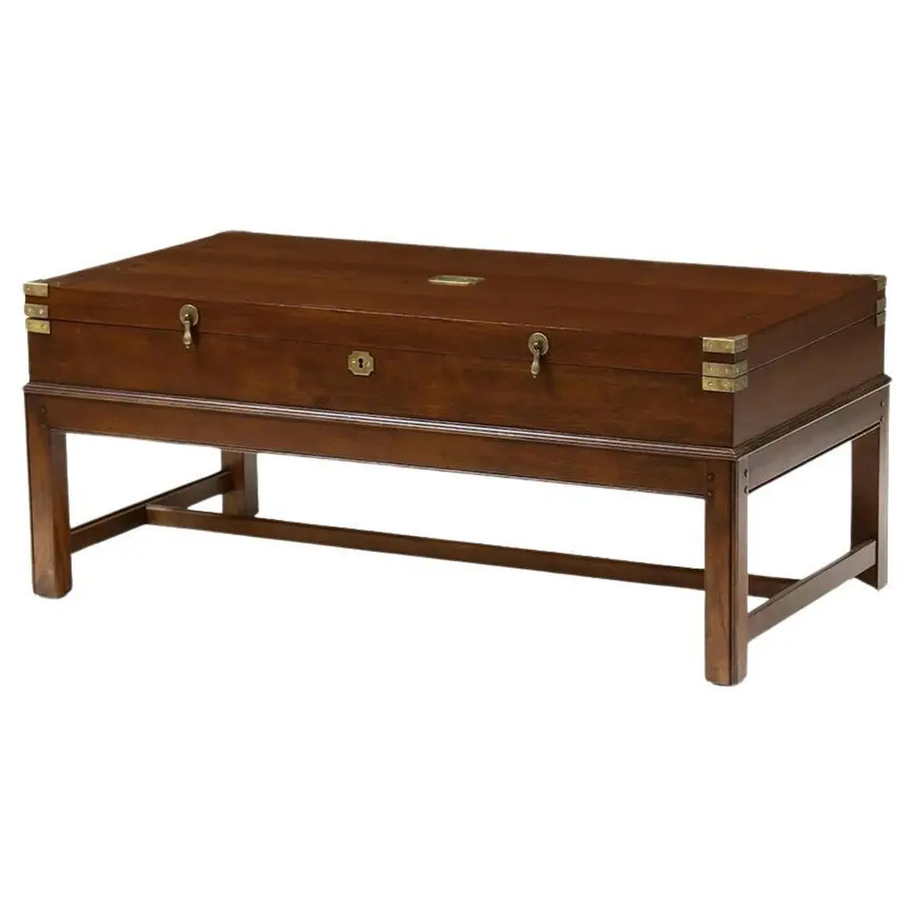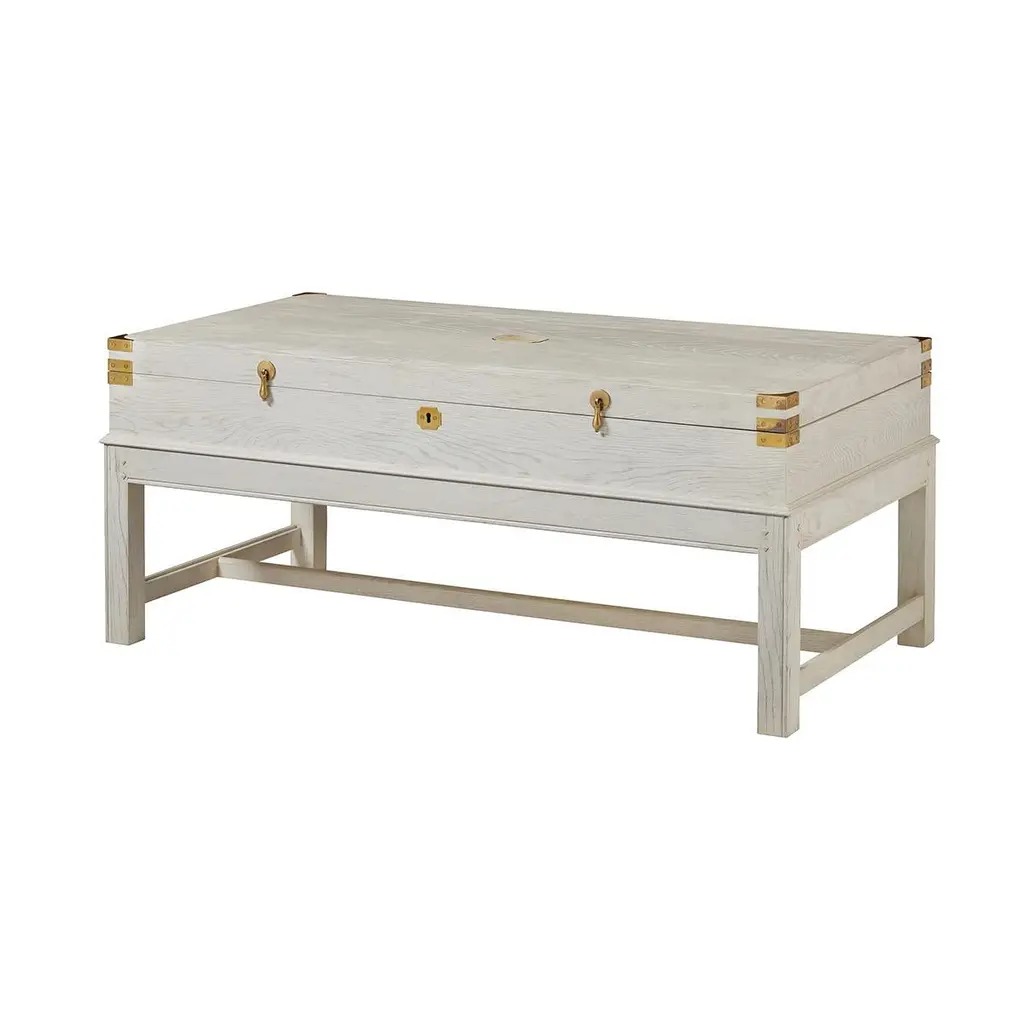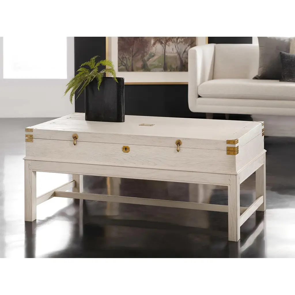 Modern Campaign Coffee Table with a white painted oak finish, with interior storage, brass hardware and mounts in the style of an antique English campaign case. On a stretcher base. Dimensions: 48.75" W x 25" D x 20.25" H