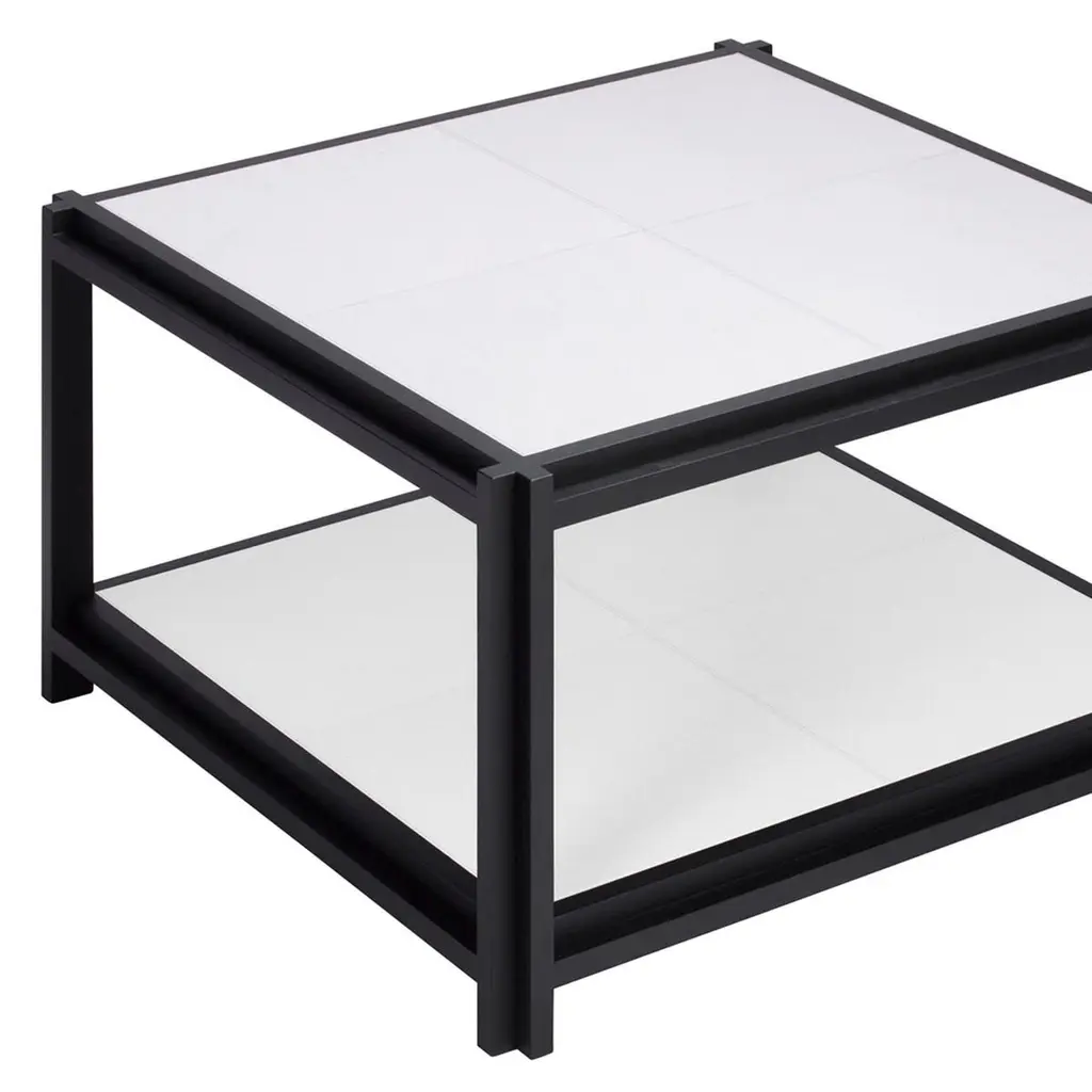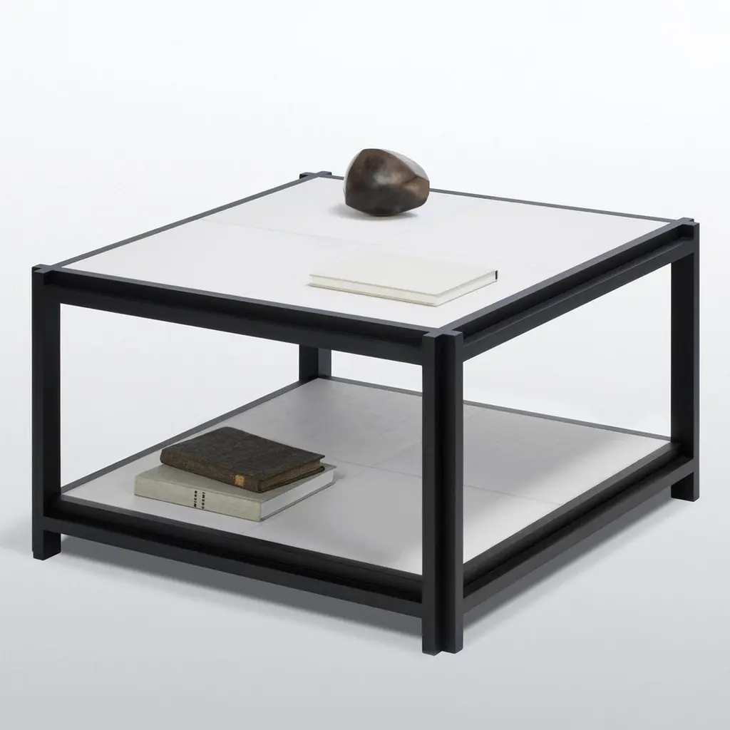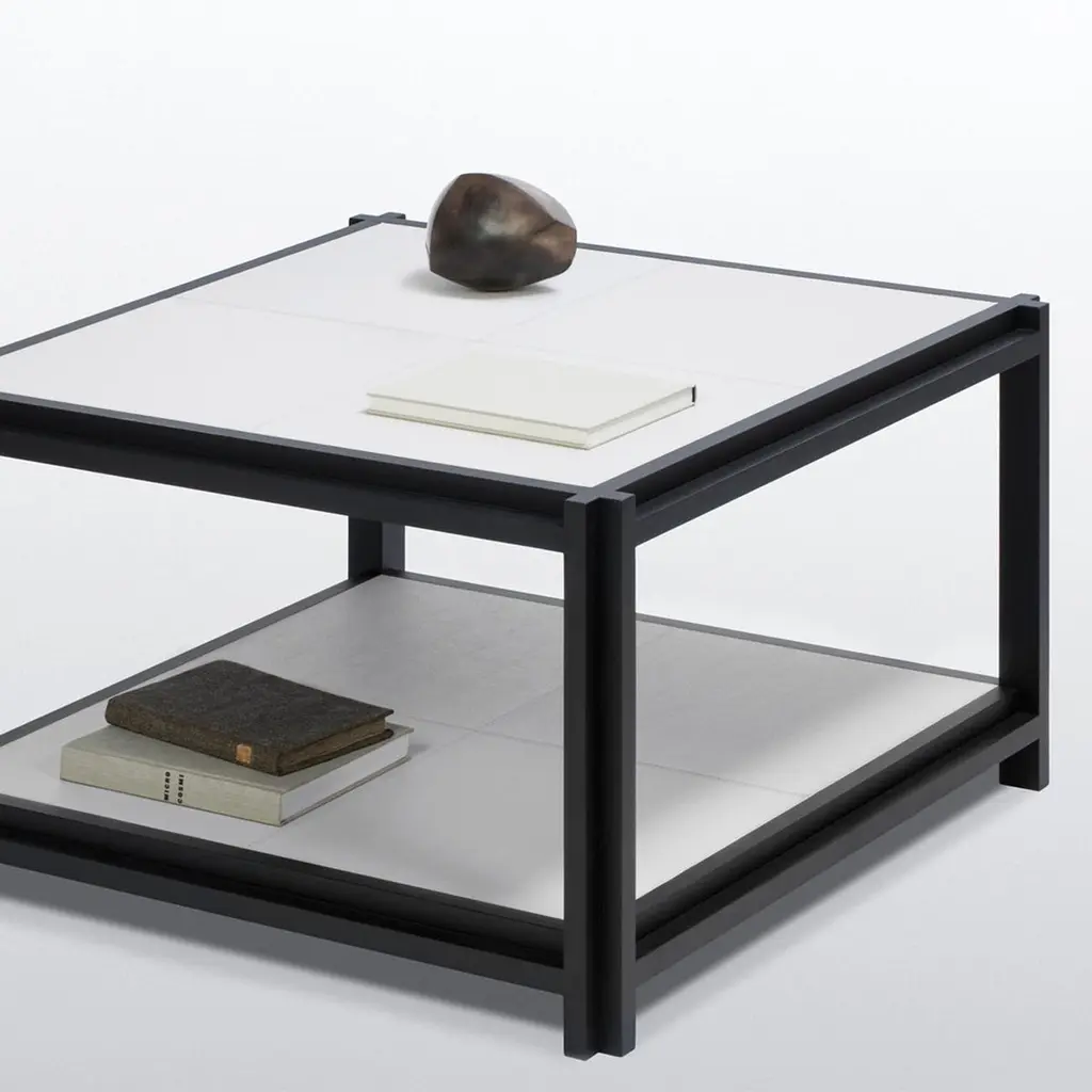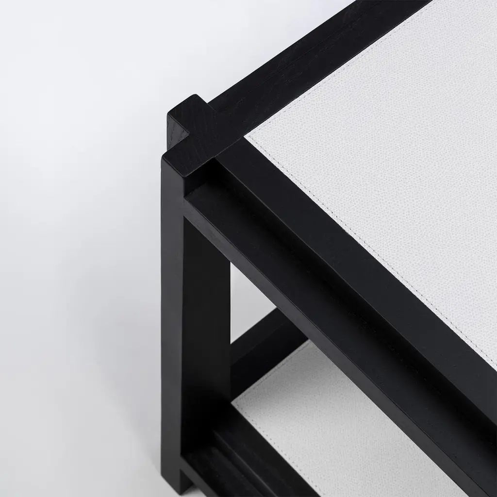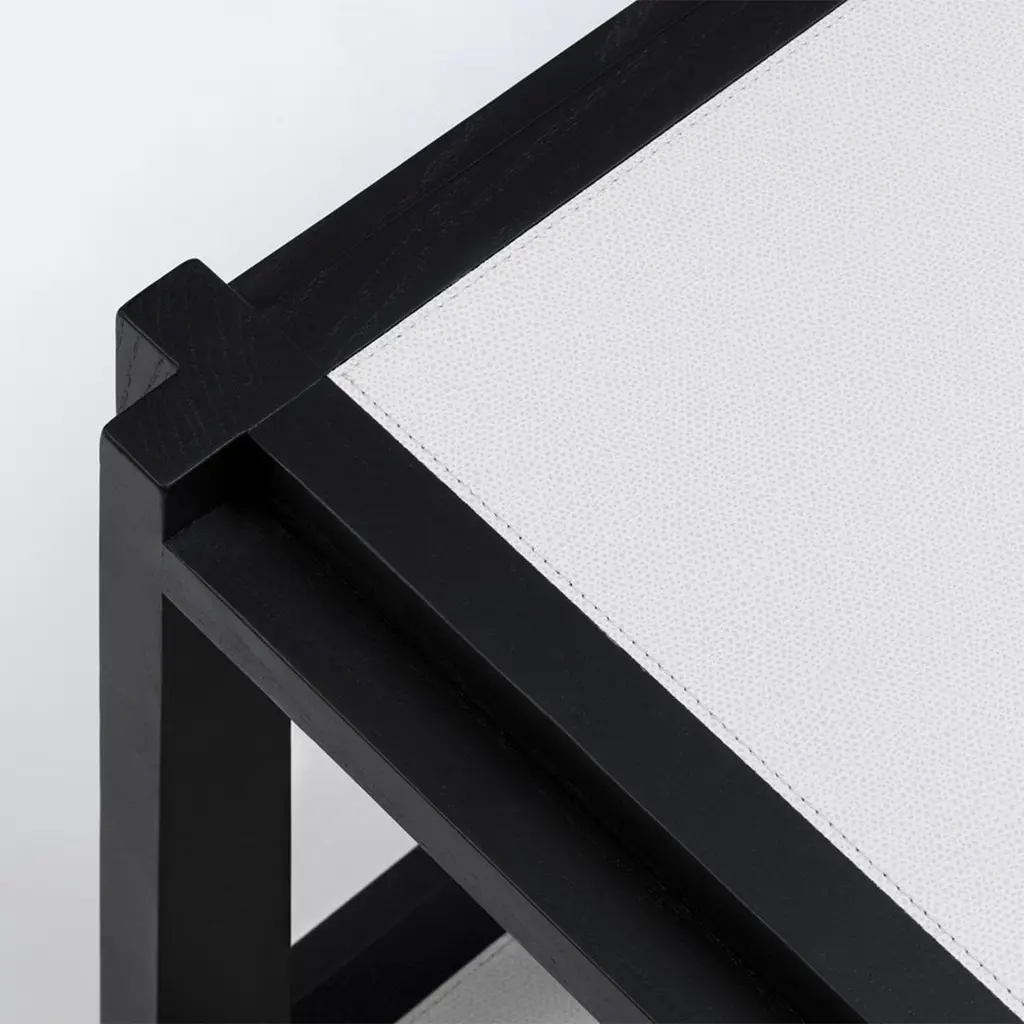 Coffee table white leather II with structure in solid walnut wenge stained. Down and up tops covered with high qualitywithe genuine leather, Cat A.Available in:L 40 x D 40 x H 45cm, price: 3900,00€L 50 x D 50 x H 45cm, price: 4400,00€L 60 x D 60 x H 45cm, price: 4900,00€L 80 x D 80 x H 45cm, price: 5400,00€L 100 x D 100 x H 45cm, price: 5900,00€L 120 x D 120 x H 45cm, price: 6400,00€.Also available in with structure in solid walnut in natural walnut finish.
