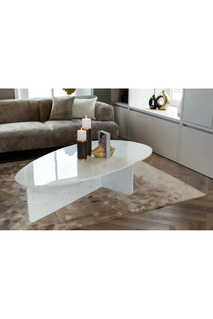 The Brandon Coffee Table by Richmond Interiors is entirely made from marble, making it not only stylish but also durable. It features an oval tabletop perched on a sturdy crisscross base. This table adds a pristine vibe to modern or minimalist seating area.
