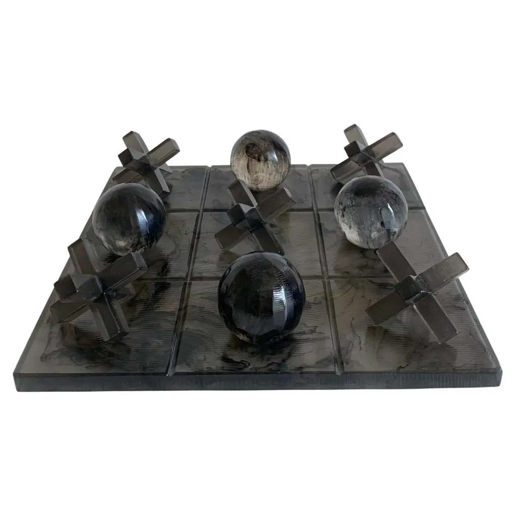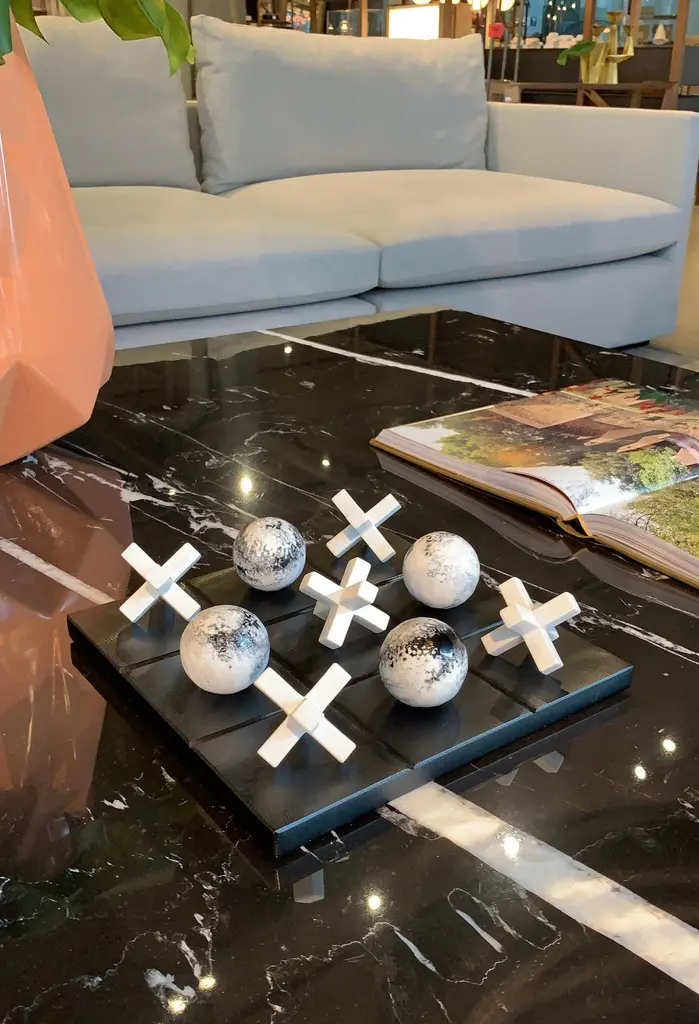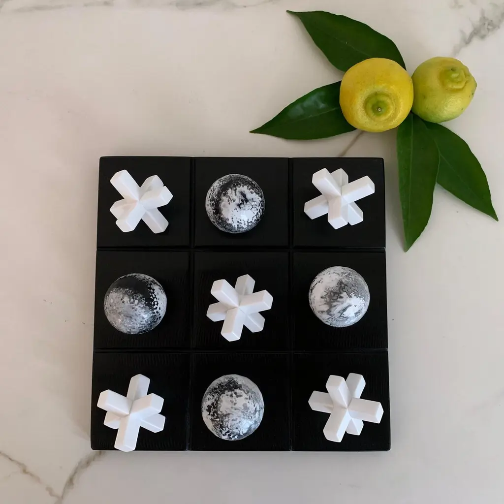 Our Tic Tac Toe is a beautiful, modern and fun take on the classic game. The three dimensional pieces are handmade in white resin with black marbled texture and the board is made of black textured resin. It will be the coolest statement piece on any coffee table.Materials: Resin It contains 9 three dimensional pieces and 1 resin board.Designed by Paola Valle and manufactured in Mexico City by extraordinary artisans. Our goal is to work hand by hand to create outstanding pieces that will represent our passion.Please avoid placing your resin pieces in direct sunlight to avoid discoloration. All resin items are strong and durable but should be treated with care as they can break if dropped or knocked against a hard surface. Colors may vary slightly to the item shown in previous photos, as everything is handmade.Due to the nature of the material every piece will be unique and aesthetically different.