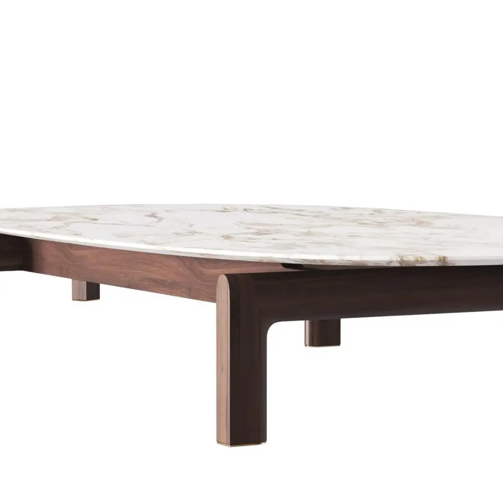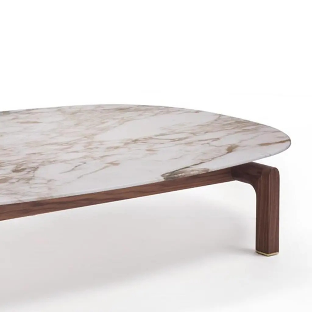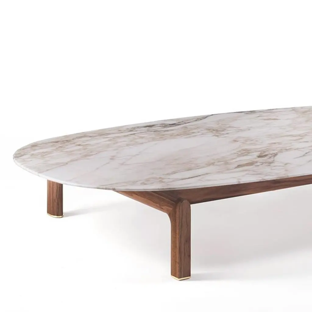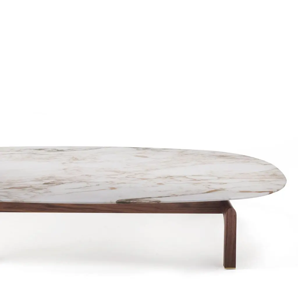 Coffee Table White Night with base in solid walnut wood and with oval white calacatta gold polished marble top.