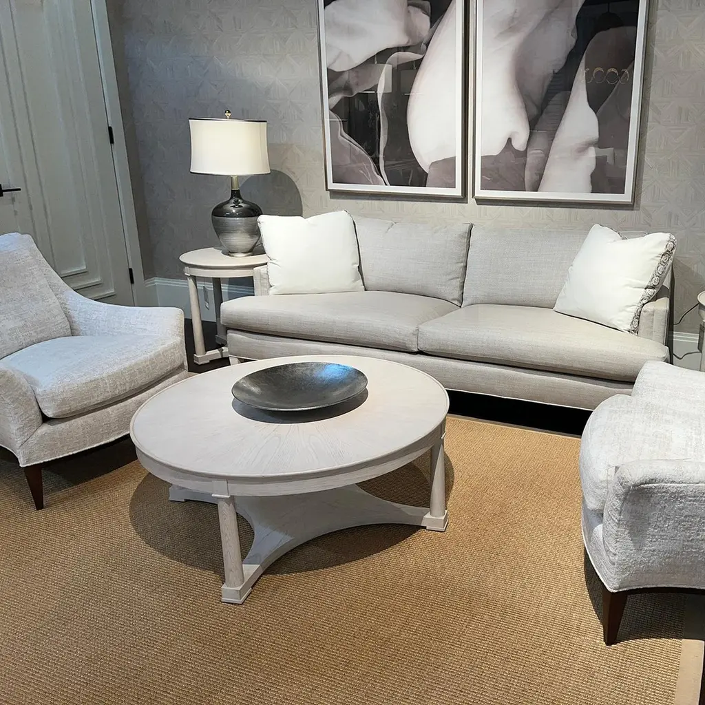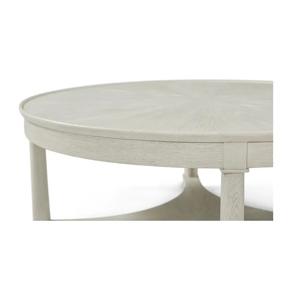 This elegantly designed piece combines functionality with style, making it the perfect centerpiece for any living room. Crafted from high-quality oak, the table white washed finish that highlights the natural grain and texture of the wood, adding character and depth to your decor.The spacious round top provides ample surface area for drinks, books, or decorative items, ensuring it meets the needs of a busy household. The table features a rayed and wooden gallery top, supported by classical turned column supports, giving it a timeless and sophisticated look. Dimensions: 42" W x 42" D x 17" H