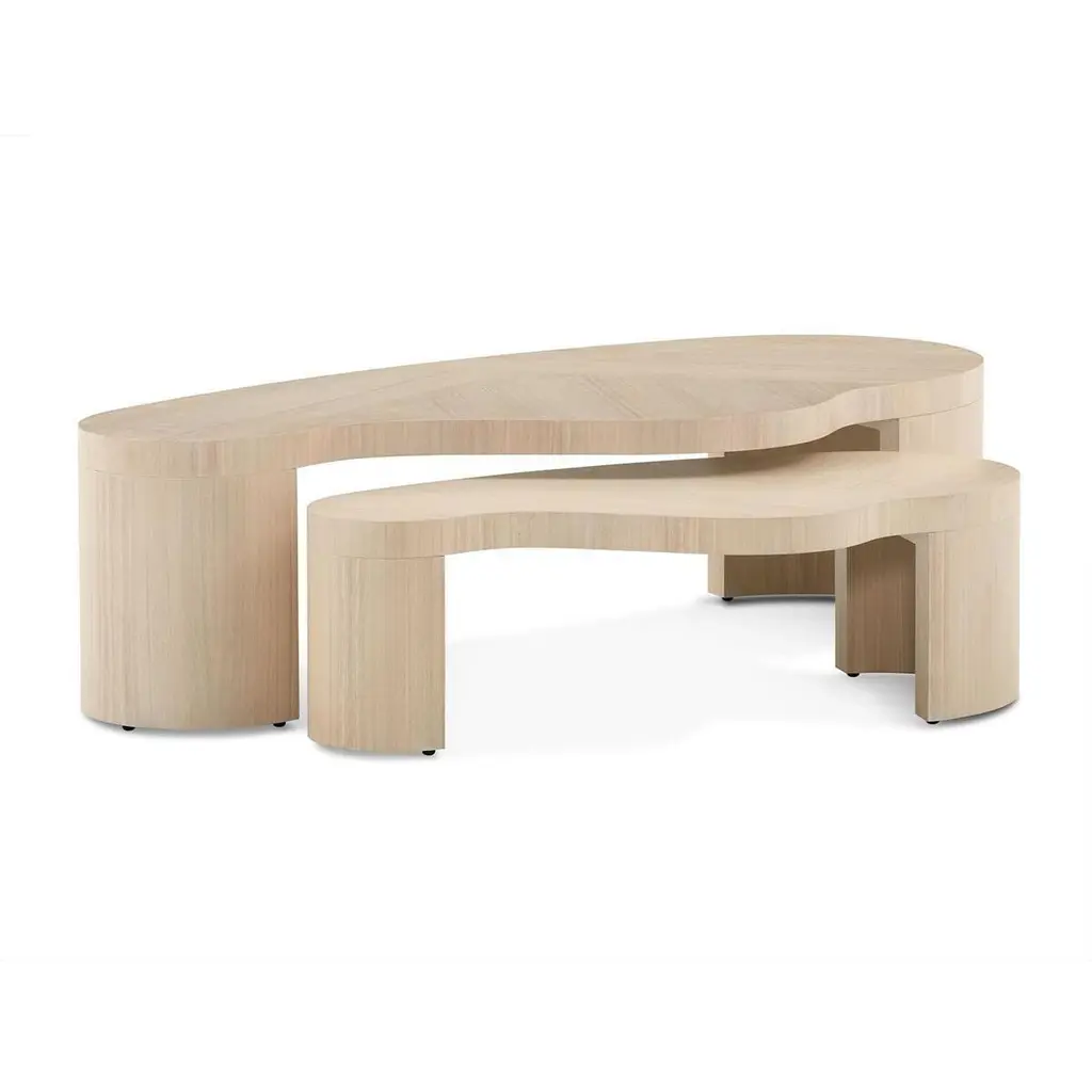 The Aero Cocktail tables represent a harmonious blend of form and function. Crafted from oak wood, the tables are characterized by an asymmetrical ovate shape in a White Washed finish. The rounded edges and meticulous craftsmanship allow the smaller piece to fit neatly under the larger one, turning redecoration into a breeze.