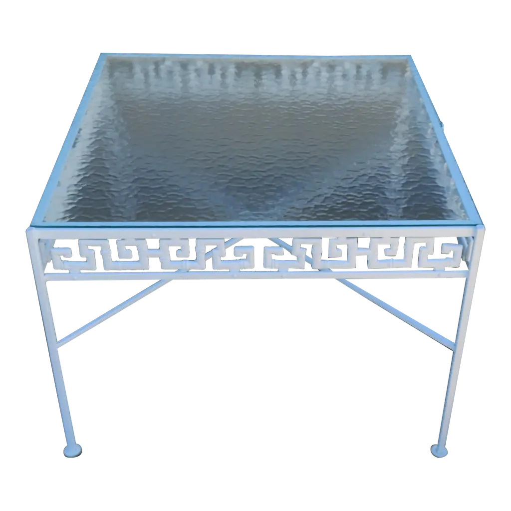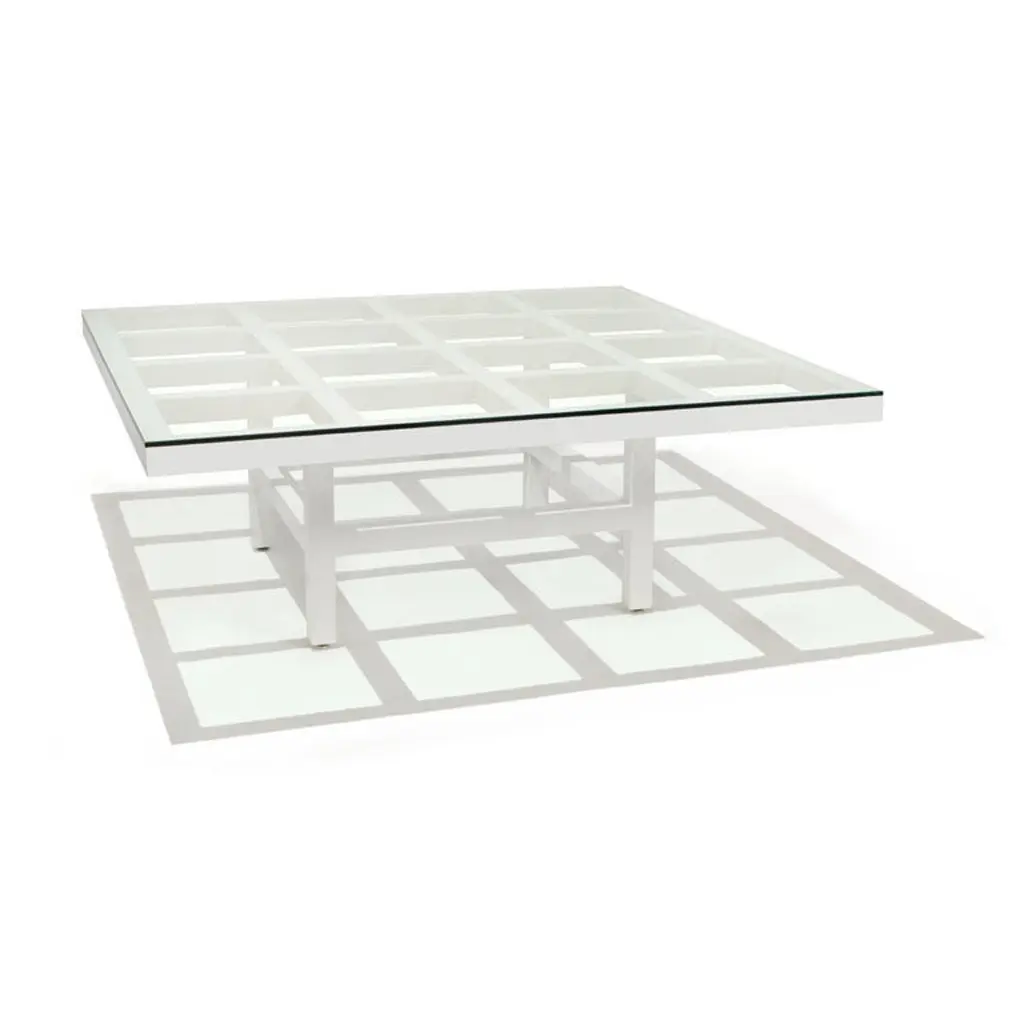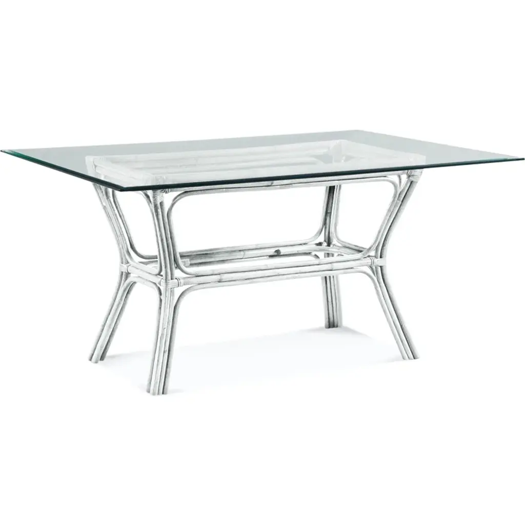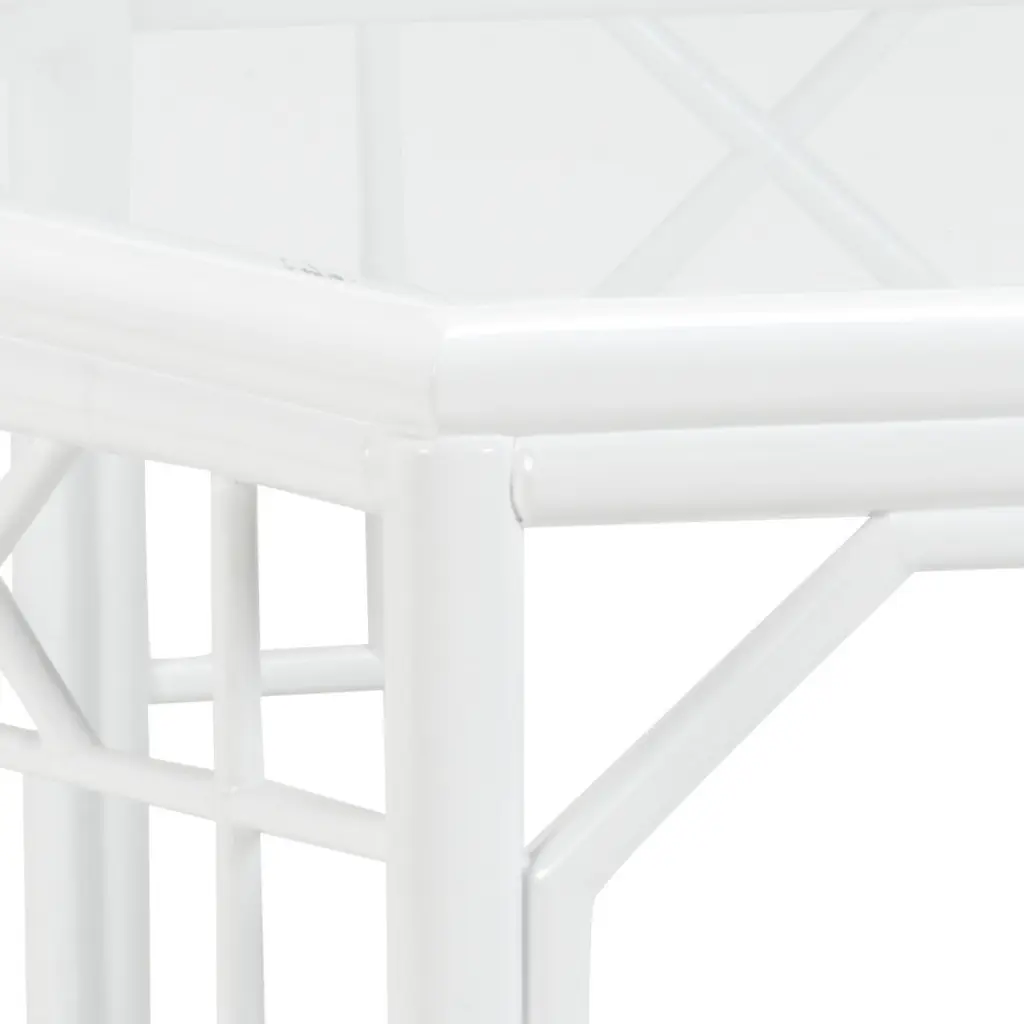 White Finish On Rattan Fretwork Hexagon Cocktail Table With A Clear Glass Top And Woven Cane Bottom Shelf.