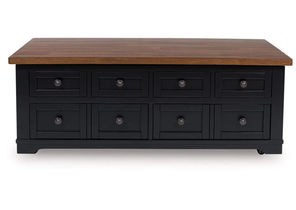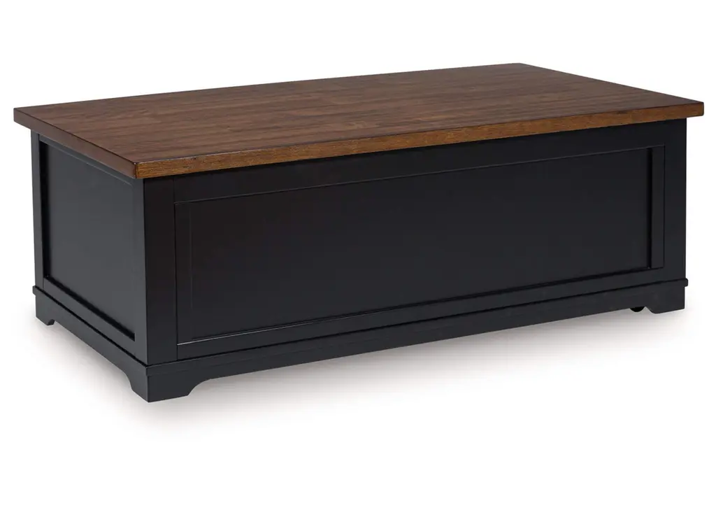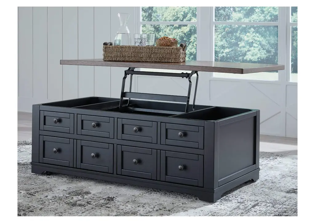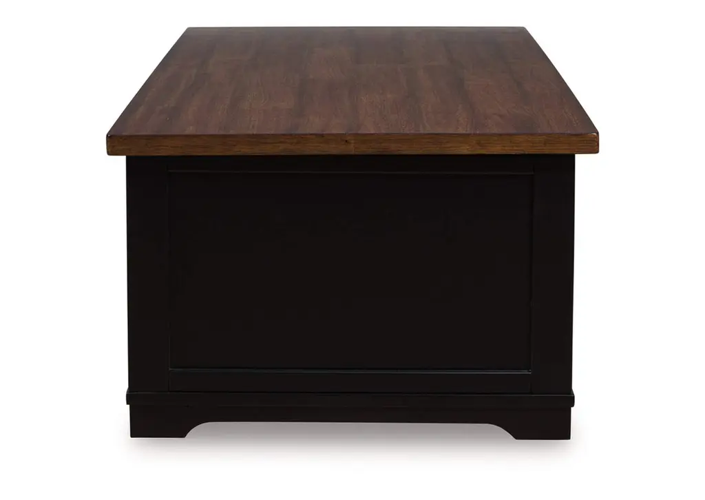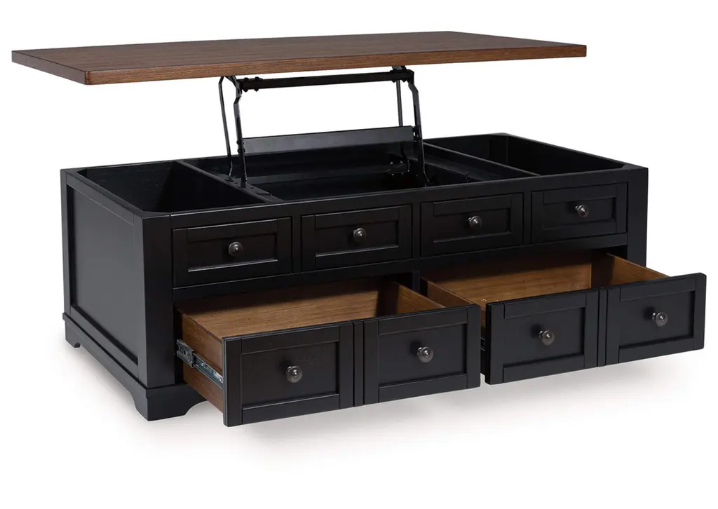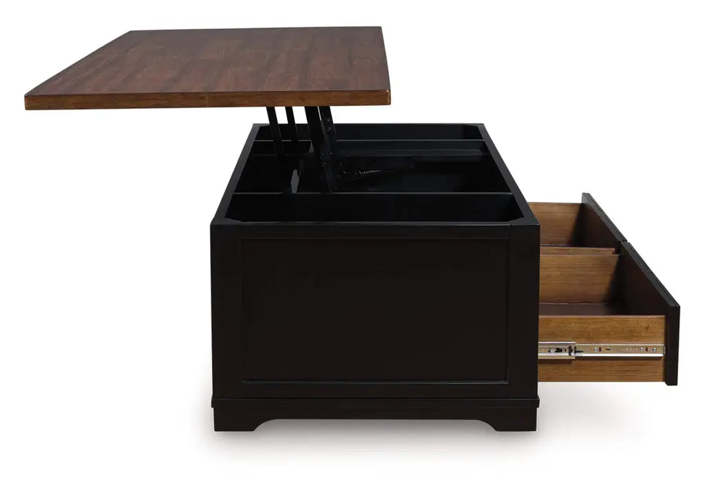 Raise the bar on modern farmhouse style with the Wildenauer lift-top coffee table. Its sturdy silhouette and casual good looks are accentuated with a two-tone finish, which pairs a warm satin black base with a contrasting butcher block veneer top. Combining form and function, its lift top extends for a casual dinner or extra work space in front of your sofa. Two spacious lower drawers and handy storage bins under the top make this piece awfully useful, too. Whether your style is vintage, country or eclectic, this table adds a hearty element. Weight 147.000 lbs. (66.15kgs.)