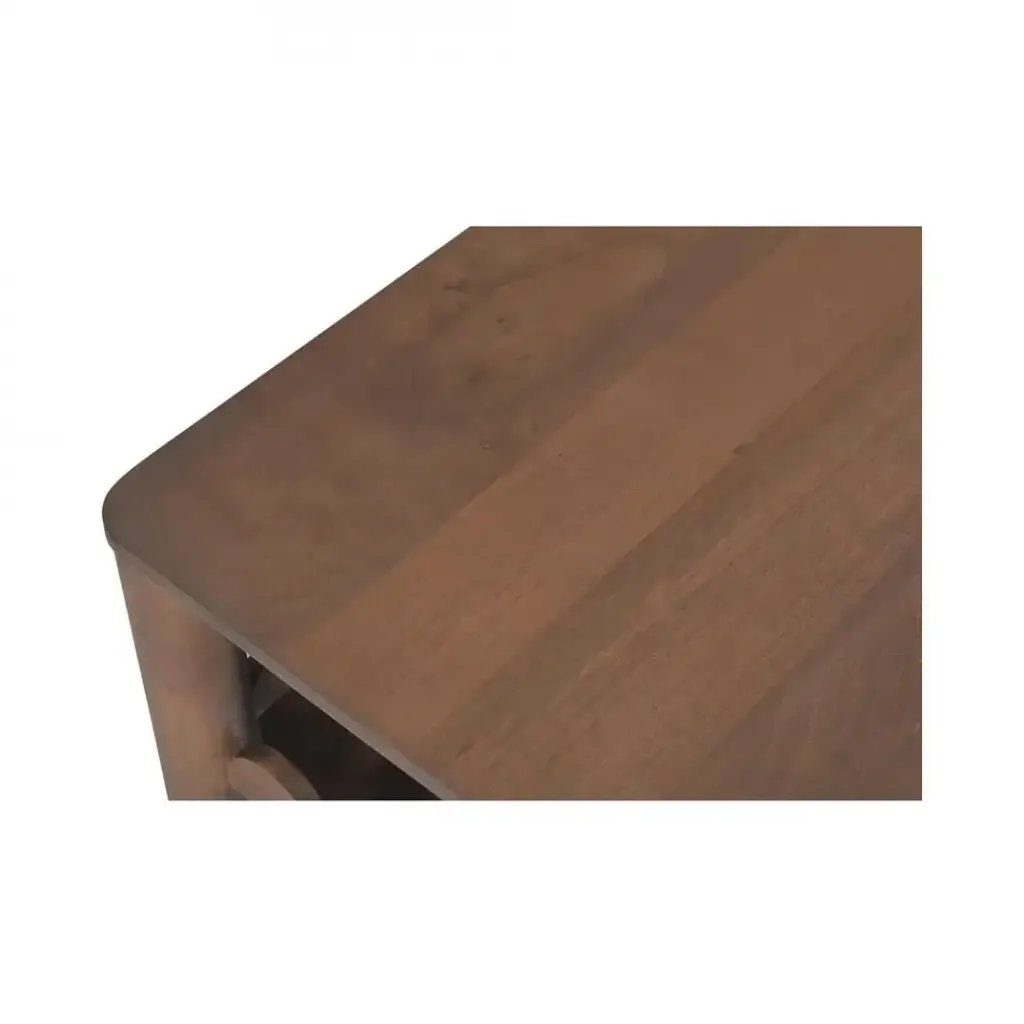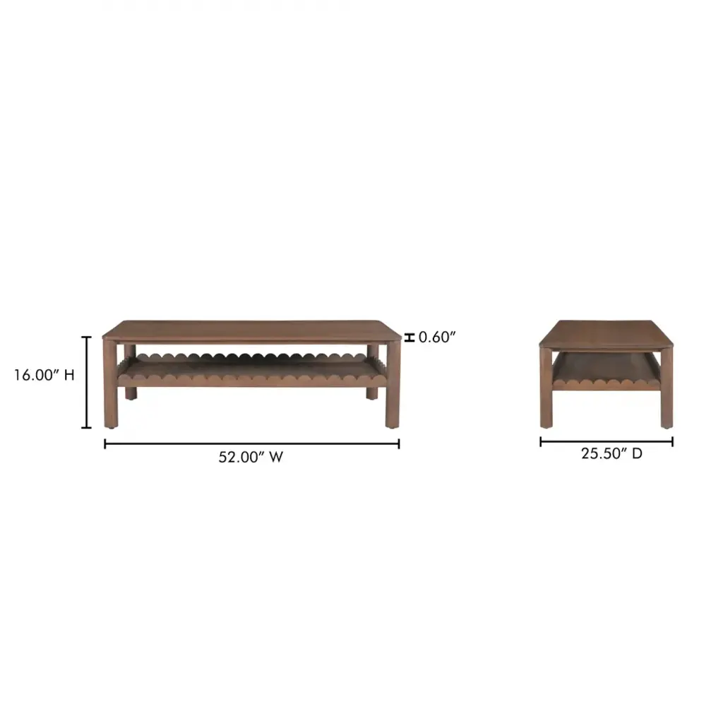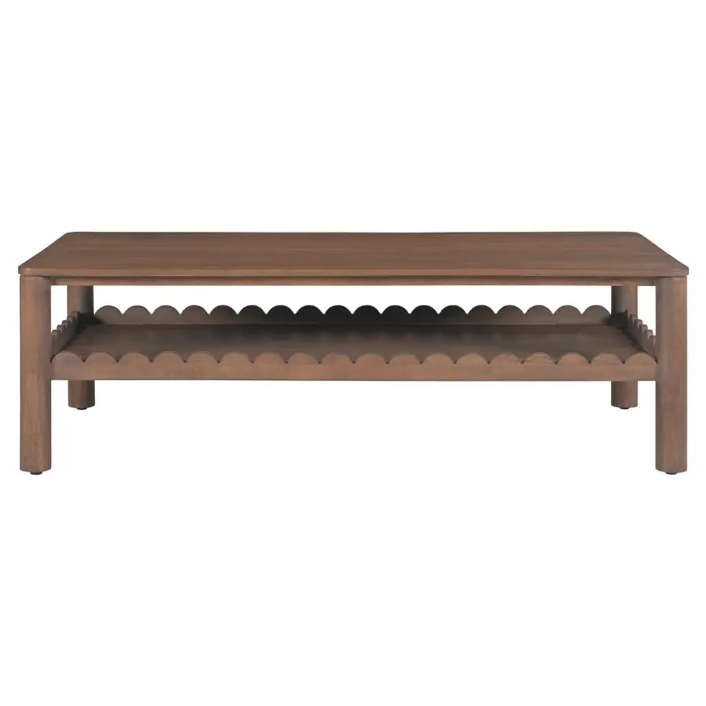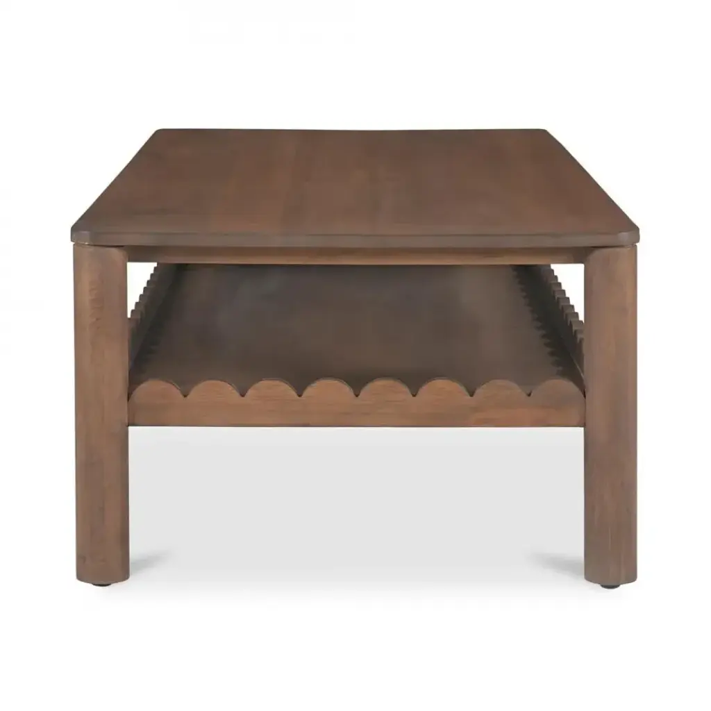 Modern aesthetics effortlessly blend with the refined simplicity of traditional Shaker design in the Wiley coffee table. Meticulously crafted, its elegant form is defined by sleek, geometric curves that add a captivating touch of modernity. The post legs stand as pillars of strength, grounding the coffee table with their understated presence. A showcase of intricate scalloped edge details to the face of the exposed lower shelf lends a timeless charm reminiscent of classical influences.