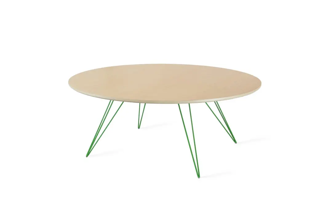 A thin, elegant and light table that can be customized to any shape, size and color desired. This handcrafted item perfectly blends industrial hairpin legs with a beveled wooden top. The irregular beauty of its natural wood combined with its simple elegant base creates a timeless, original design. This piece is offered in dinning and coffee heights as well as several shapes and sizes including large and small: rectangle, oval, square, and circle.