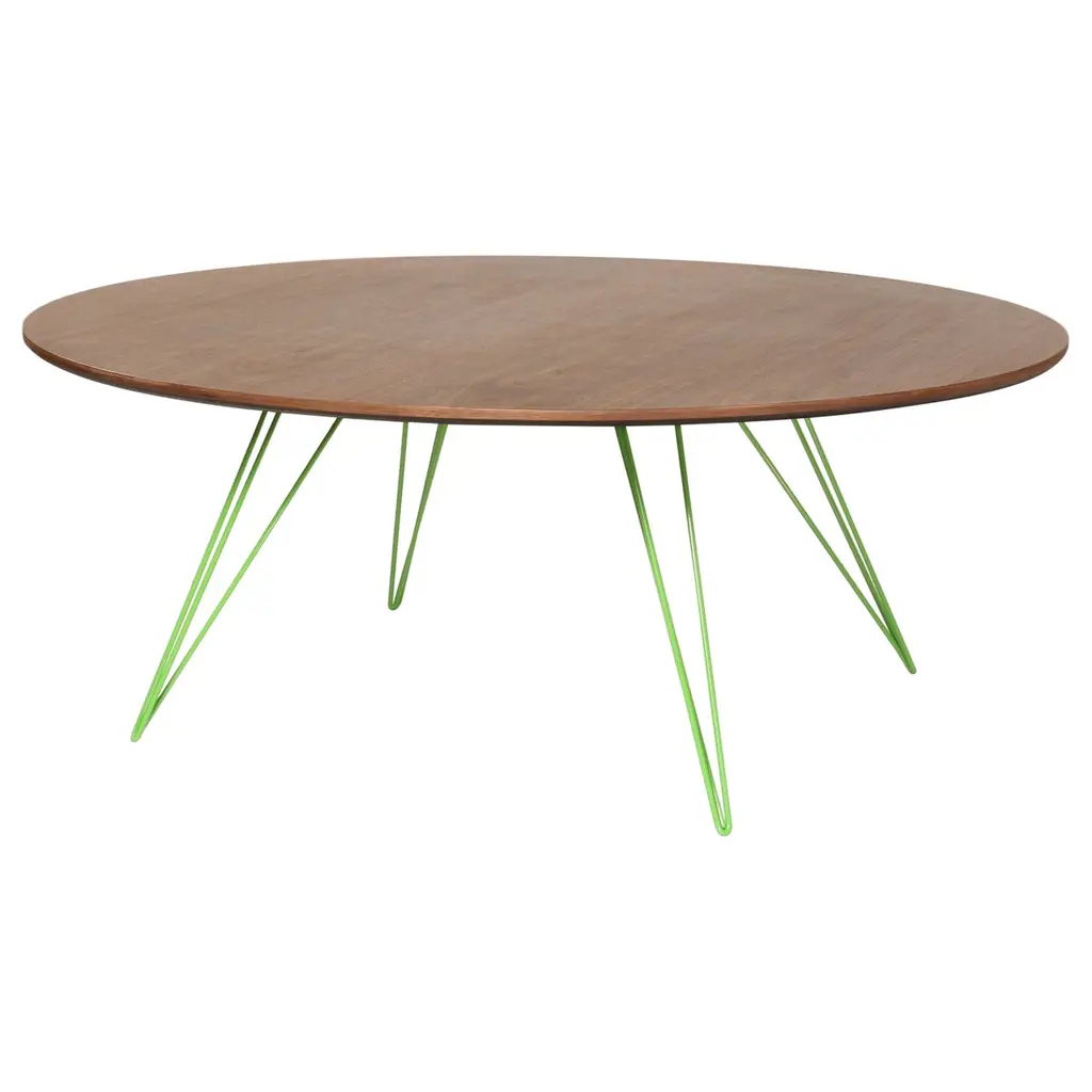 A thin, elegant and light table that can be customized to any shape, size and color desired. This handcrafted item perfectly blends industrial hairpin legs with a beveled wooden top. The irregular beauty of its natural wood combined with its simple elegant base creates a timeless, original design. This piece is offered in dinning and coffee heights as well as several shapes and sizes including large and small: rectangle, oval, square, and circle.