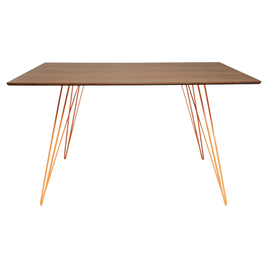 A thin, elegant and light table that can be customized to any shape, size and color desired. This handcrafted item perfectly blends industrial hairpin legs with a beveled wooden top. The irregular beauty of its natural wood combined with its simple elegant base creates a timeless, original design. This piece is offered in dinning and coffee heights as well as several shapes and sizes including large and small: rectangle, oval, square, and circle.