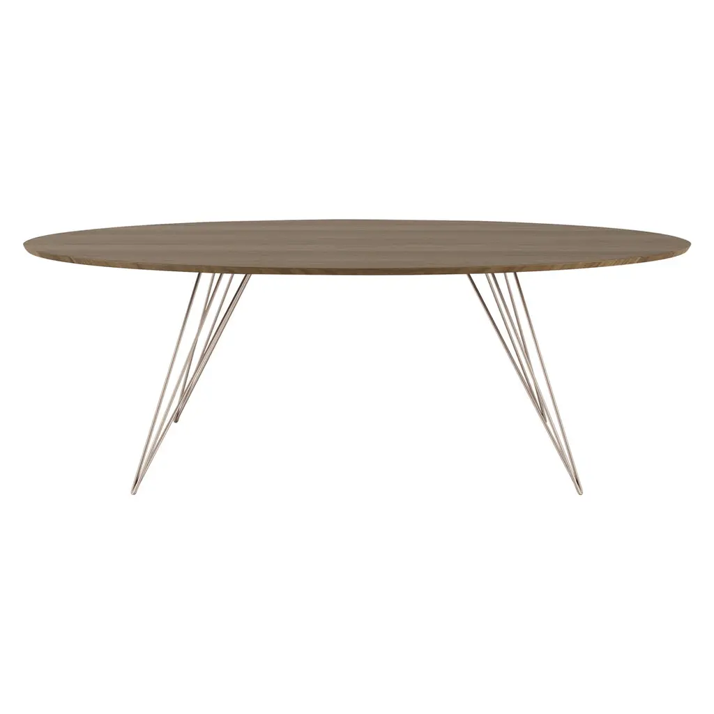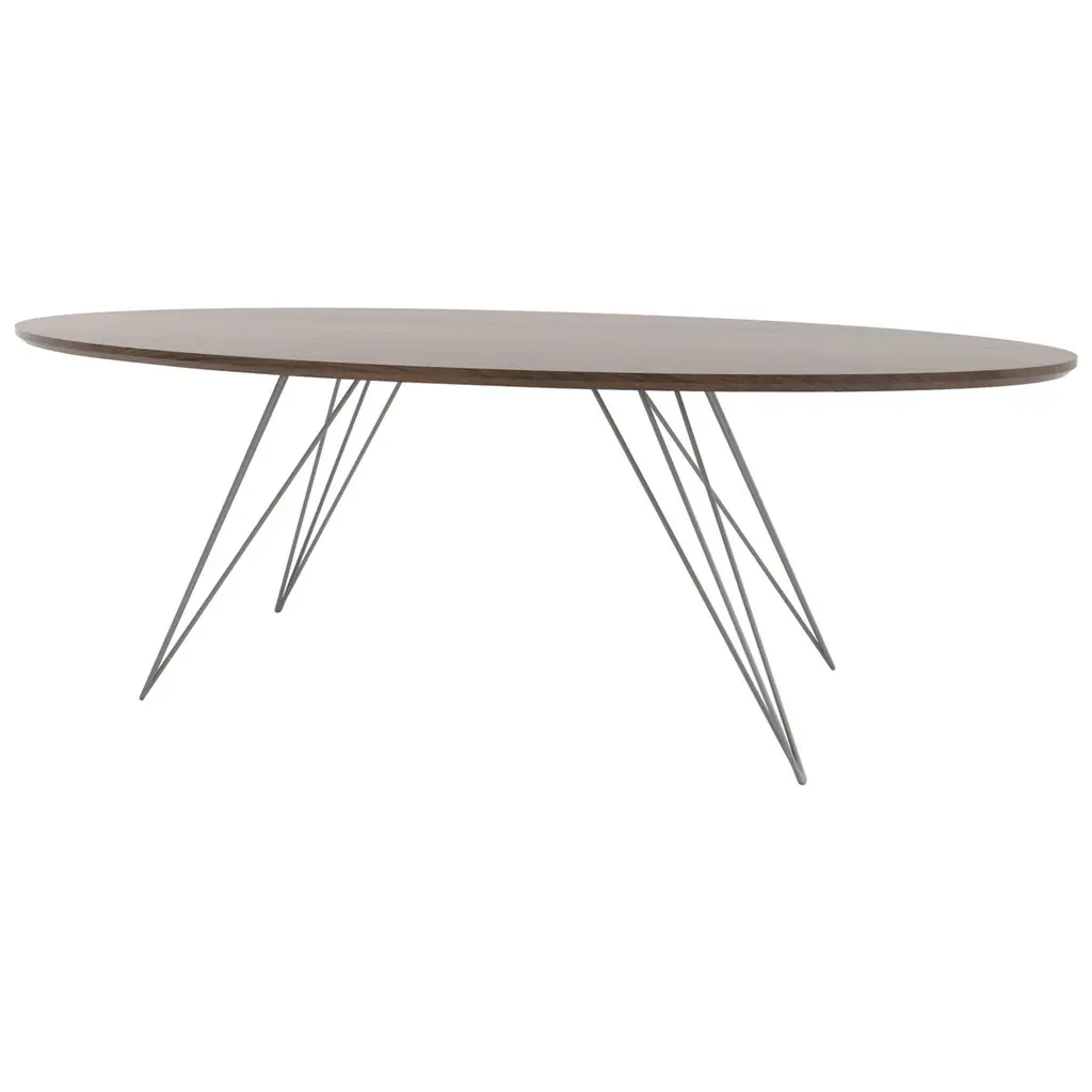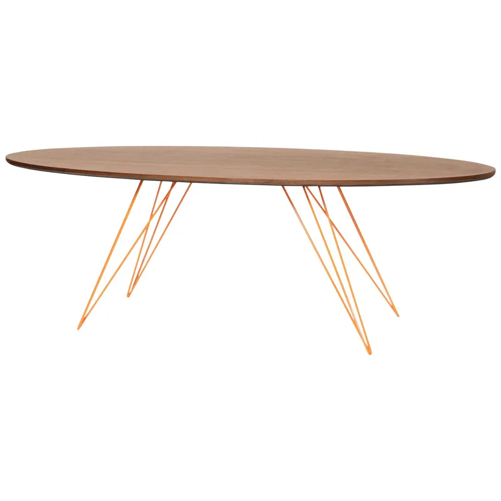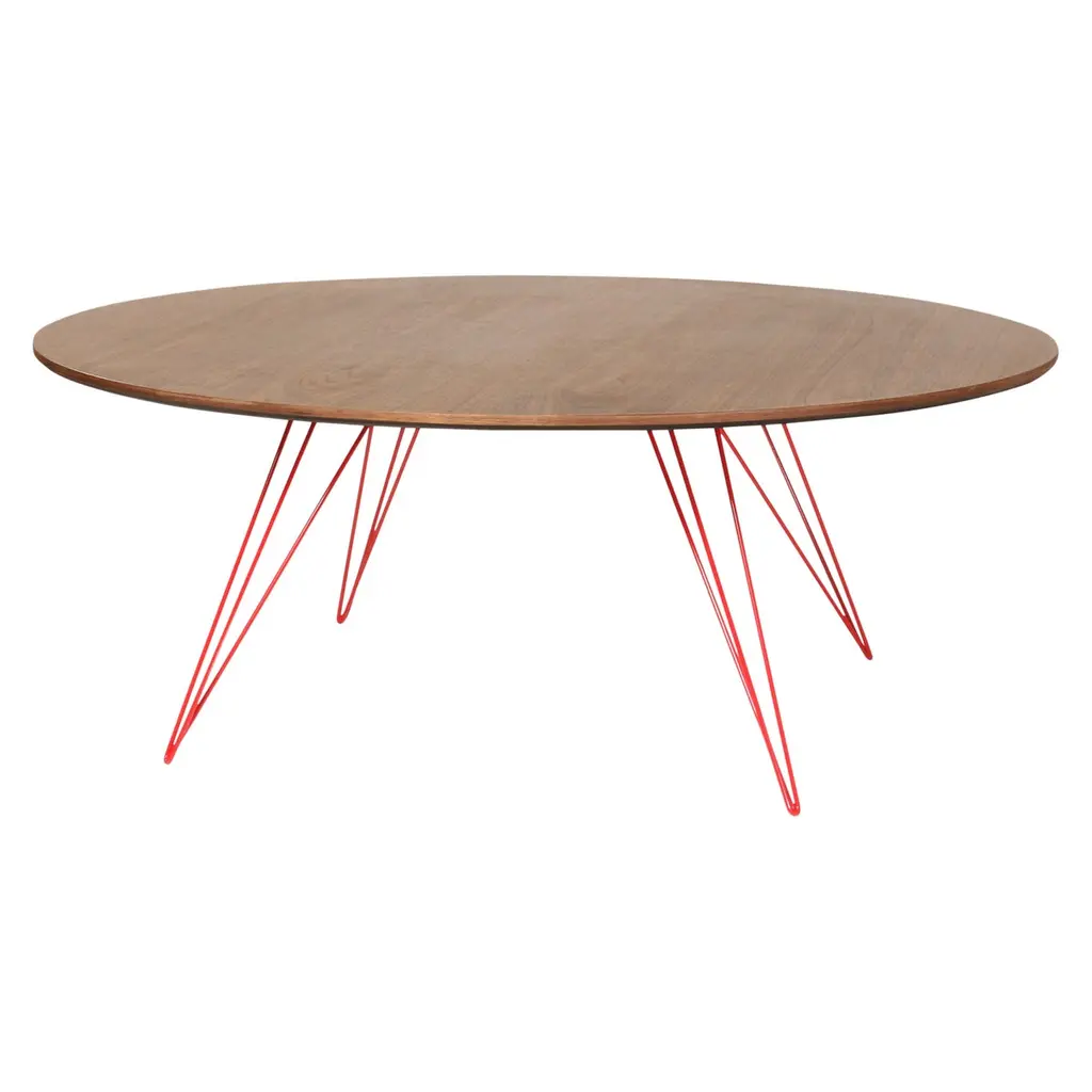 A thin, elegant and light table that can be customized to any shape, size and color desired. This handcrafted item perfectly blends industrial hairpin legs with a beveled wooden top. The irregular beauty of its natural wood combined with its simple elegant base creates a timeless, original design. This piece is offered in dinning and coffee heights as well as several shapes and sizes including large and small: rectangle, oval, square, and circle.