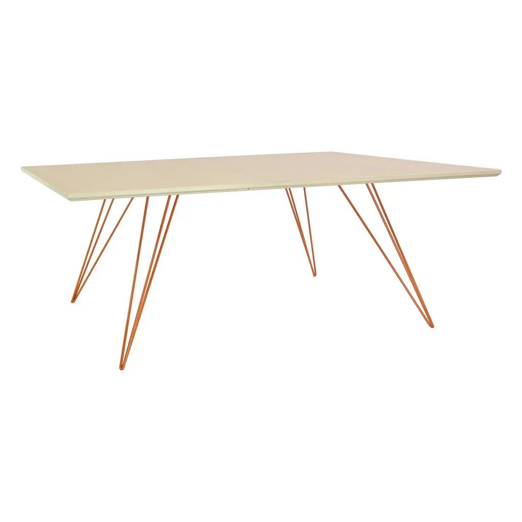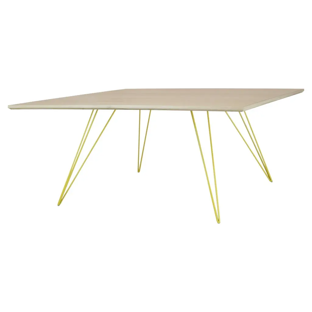 A thin, elegant and light table that can be customized to any shape, size and color desired. This handcrafted item perfectly blends industrial hairpin legs with a beveled wooden top. The irregular beauty of its natural wood combined with its simple elegant base creates a timeless, original design. This piece is offered in dinning and coffee heights as well as several shapes and sizes including large and small: rectangle, oval, square, and circle.