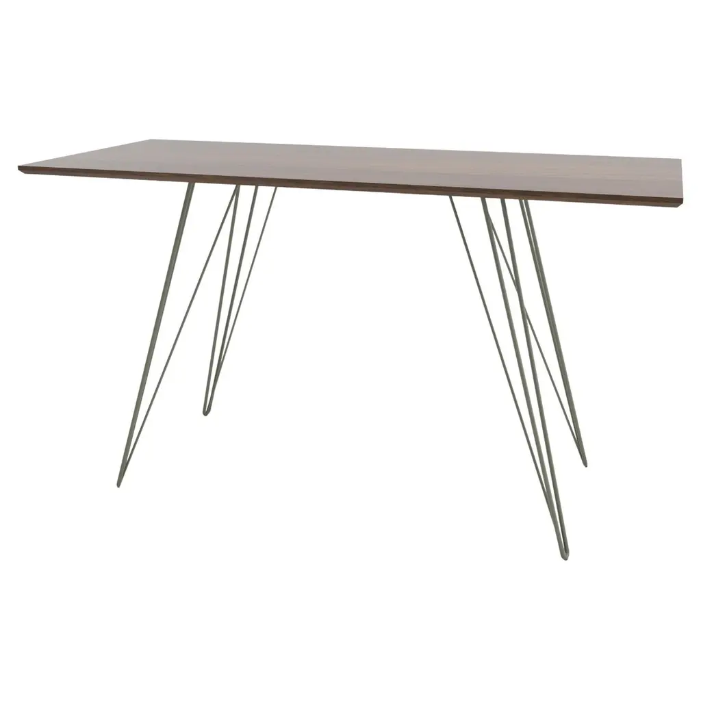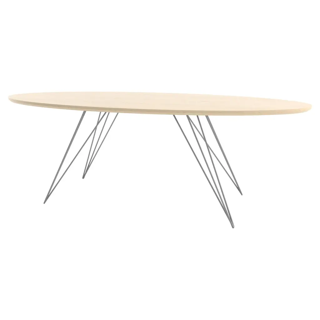 A thin, elegant and light table that can be customized to any shape, size and color desired. This handcrafted item perfectly blends industrial hairpin legs with a beveled wooden top. The irregular beauty of its natural wood combined with its simple elegant base creates a timeless, original design. This piece is offered in dinning and coffee heights as well as several shapes and sizes including large and small: rectangle, oval, square, and circle.