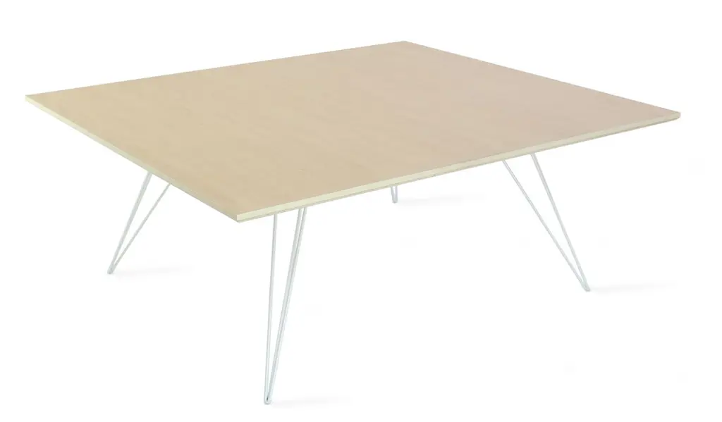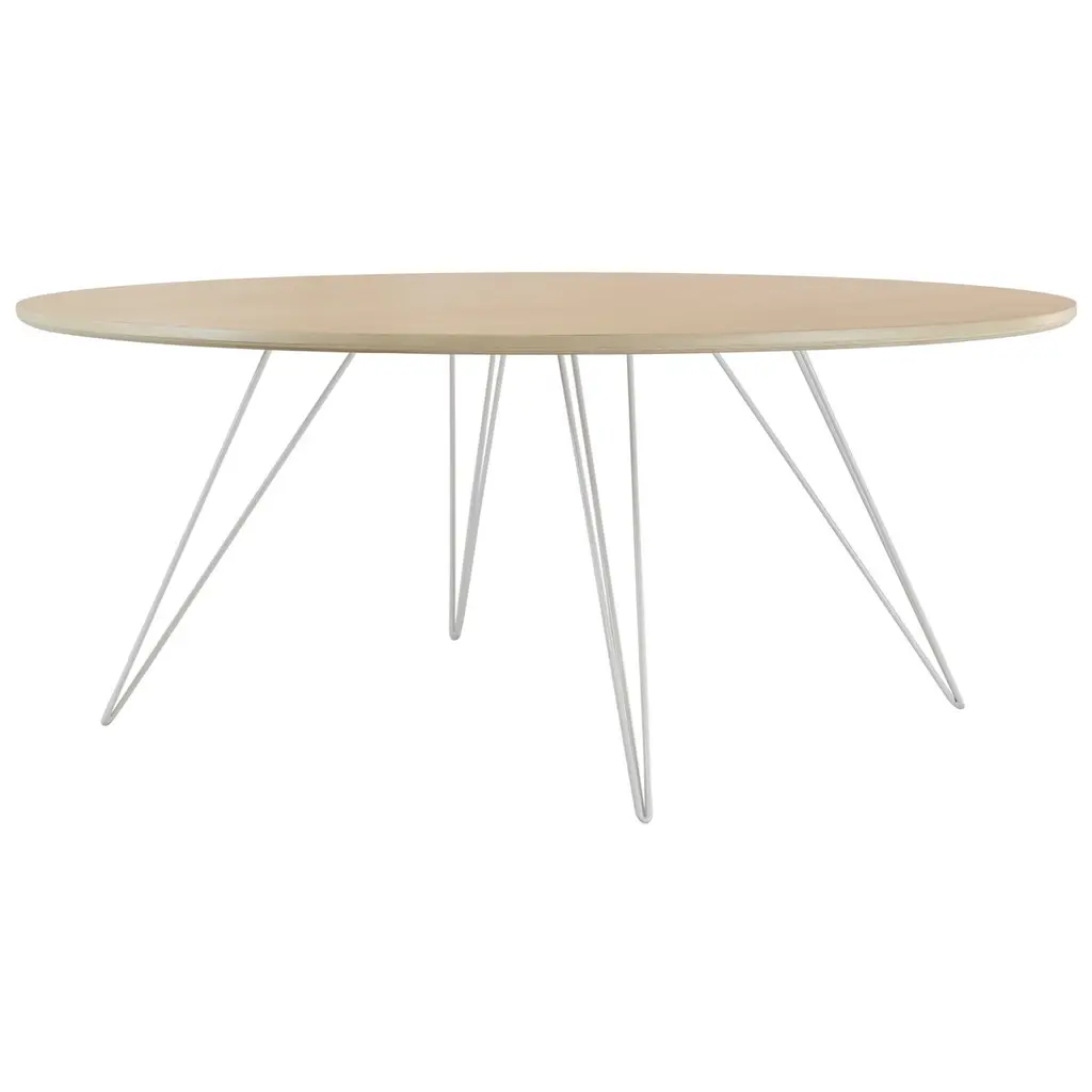 A thin, elegant and light table that can be customized to any shape, size and color desired. This handcrafted item perfectly blends industrial hairpin legs with a beveled wooden top. The irregular beauty of its natural wood combined with its simple elegant base creates a timeless, original design. This piece is offered in dinning and coffee heights as well as several shapes and sizes including large and small: rectangle, oval, square, and circle.