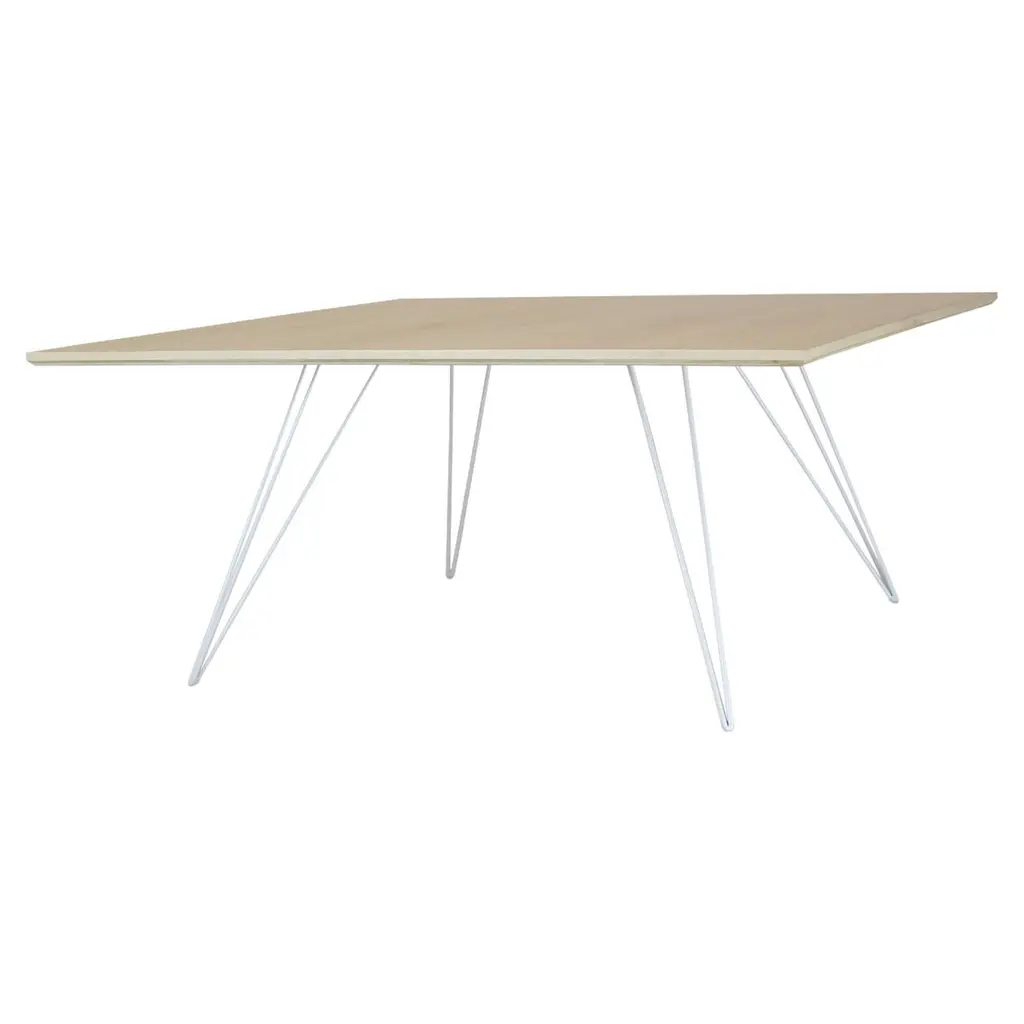 A thin, elegant and light table that can be customized to any shape, size and color desired. This handcrafted item perfectly blends industrial hairpin legs with a beveled wooden top. The irregular beauty of its natural wood combined with its simple elegant base creates a timeless, original design. This piece is offered in dinning and coffee heights as well as several shapes and sizes including large and small: rectangle, oval, square, and circle.