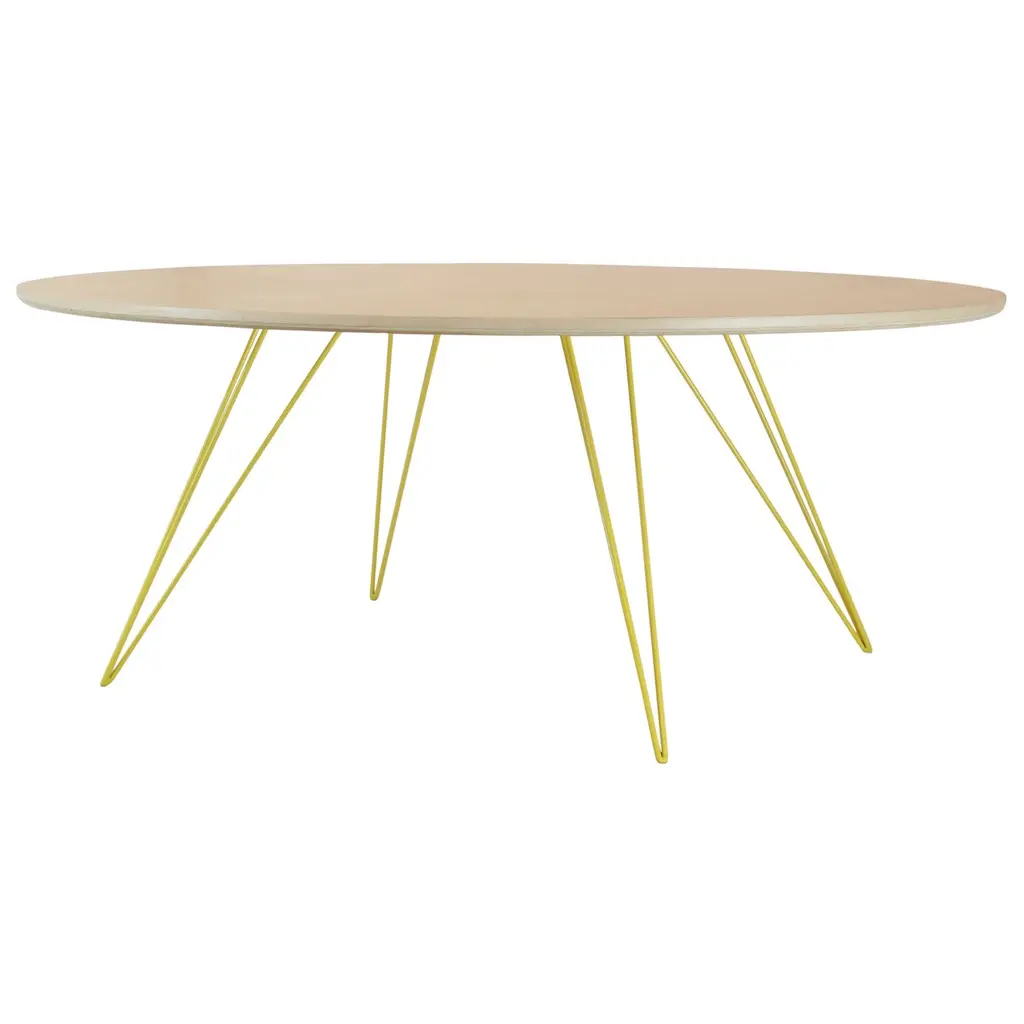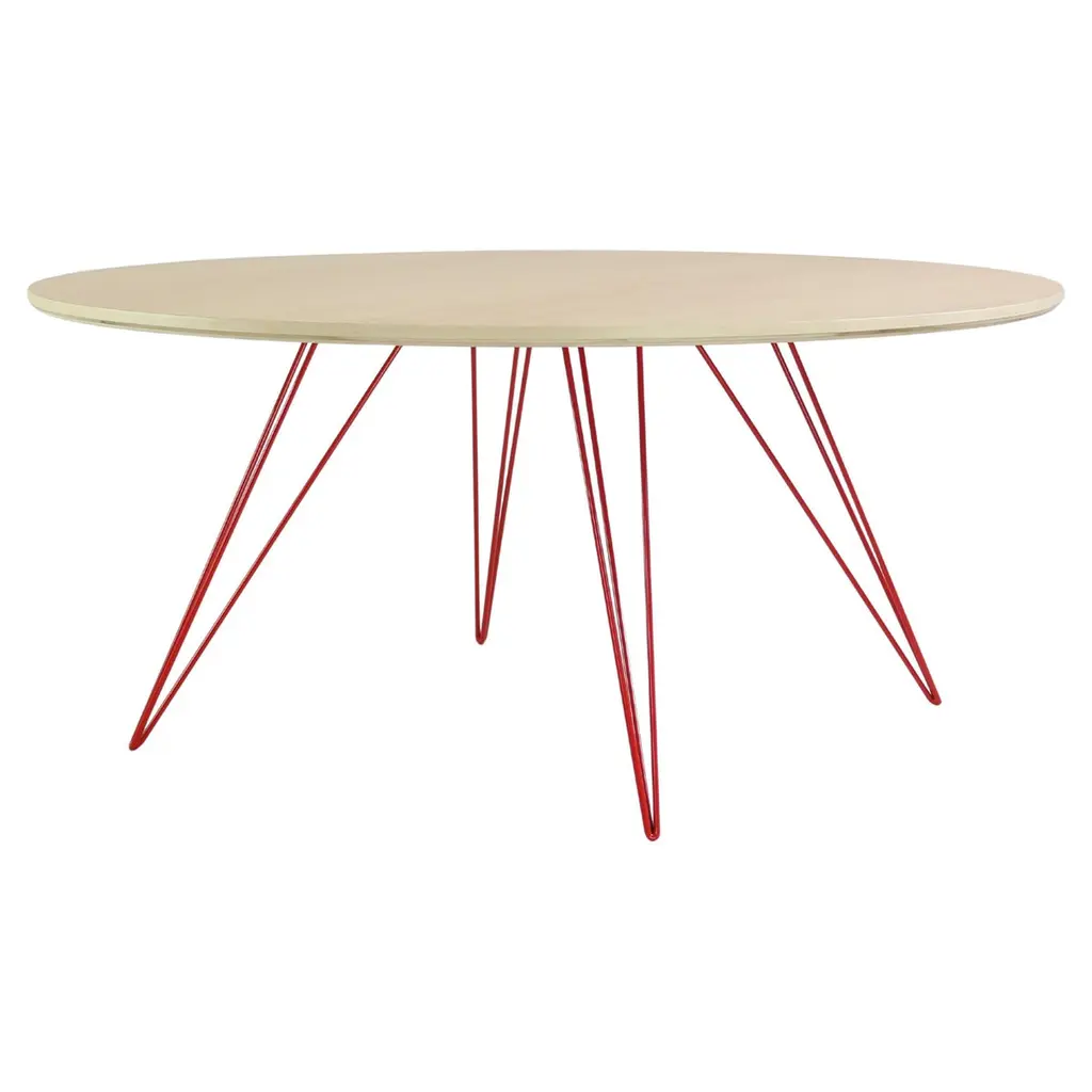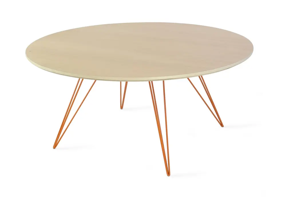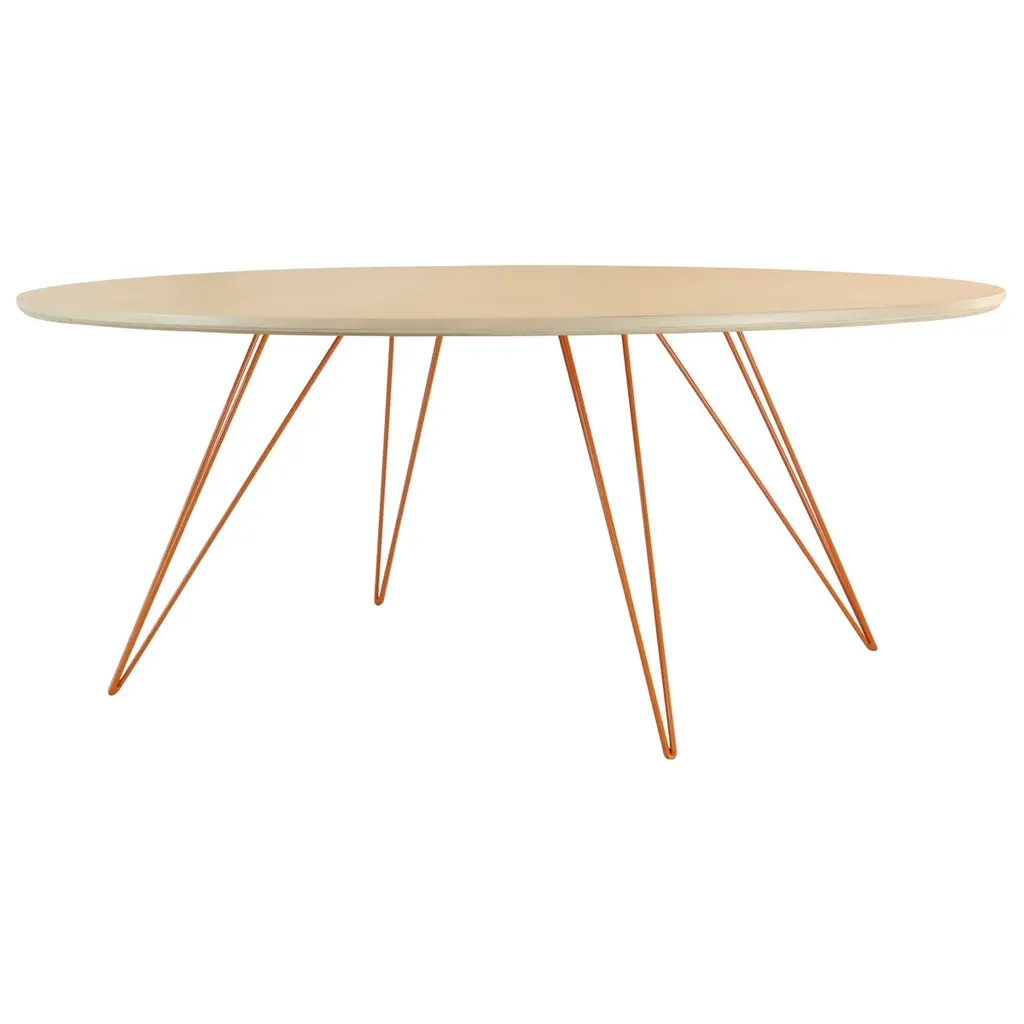 A thin, elegant and light table that can be customized to any shape, size and color desired. This handcrafted item perfectly blends industrial hairpin legs with a beveled wooden top. The irregular beauty of its natural wood combined with its simple elegant base creates a timeless, original design. This piece is offered in dinning and coffee heights as well as several shapes and sizes including large and small: rectangle, oval, square, and circle.