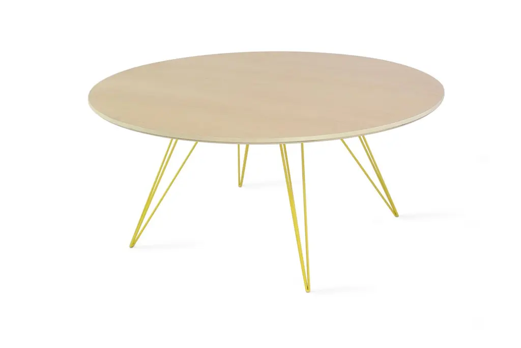 A thin, elegant and light table that can be customized to any shape, size and color desired. This handcrafted item perfectly blends industrial hairpin legs with a beveled wooden top. The irregular beauty of its natural wood combined with its simple elegant base creates a timeless, original design. This piece is offered in dinning and coffee heights as well as several shapes and sizes including large and small: rectangle, oval, square, and circle.