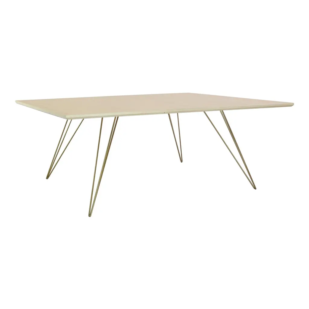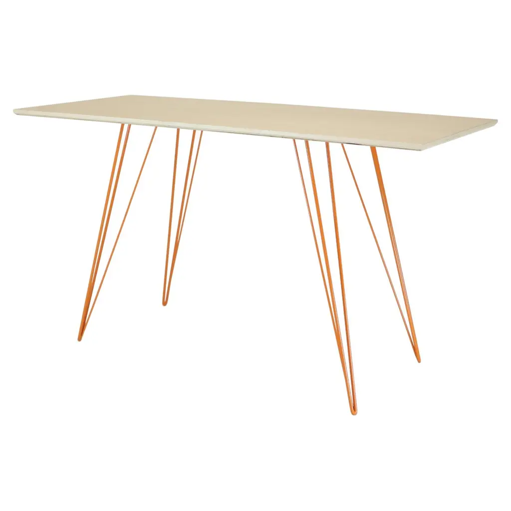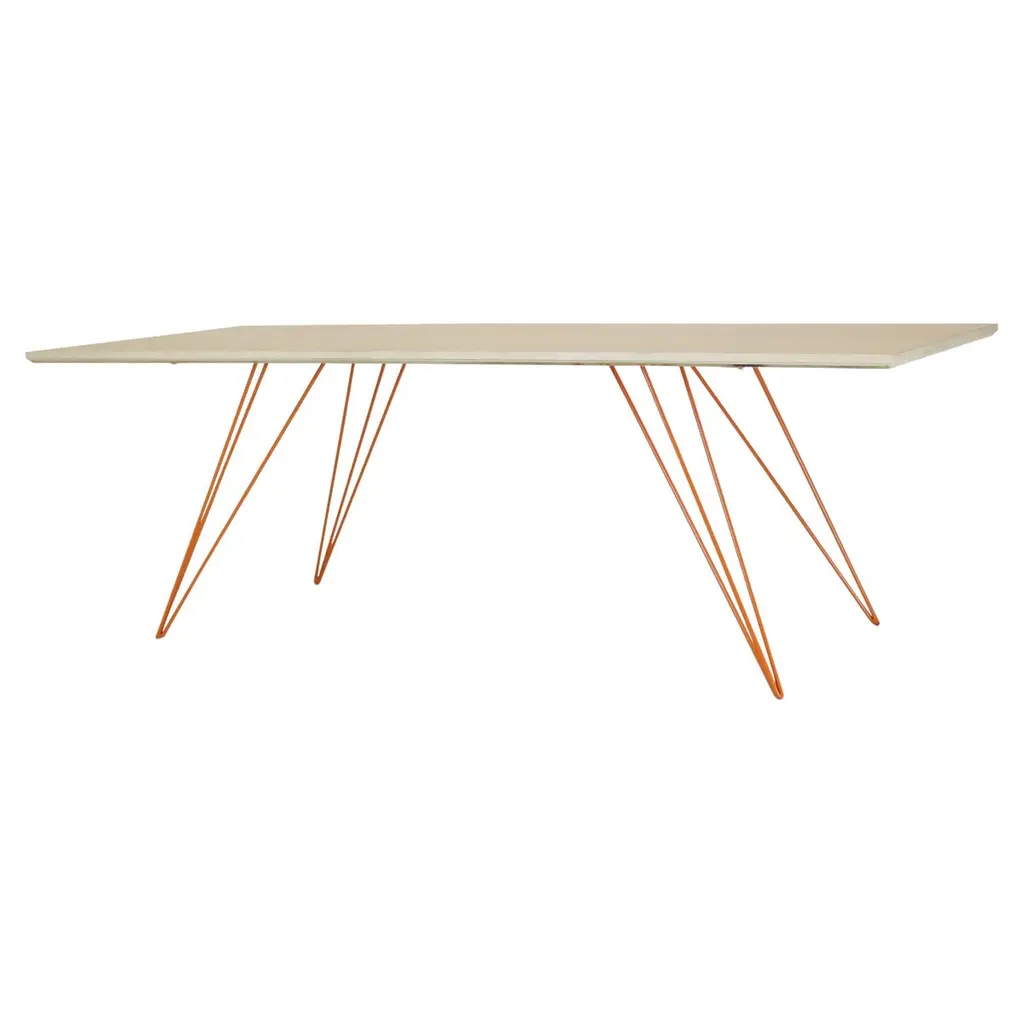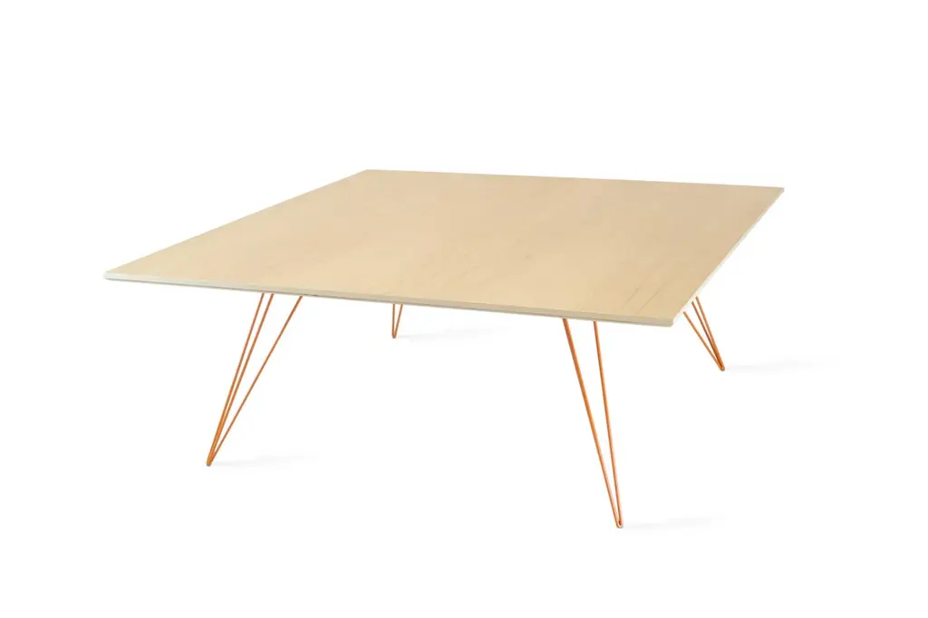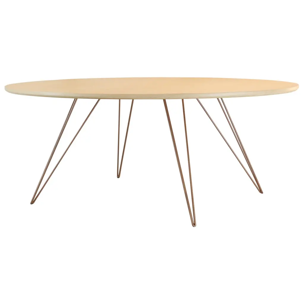 A thin, elegant and light table that can be customized to any shape, size and color desired. This handcrafted item perfectly blends industrial hairpin legs with a beveled wooden top. The irregular beauty of its natural wood combined with its simple elegant base creates a timeless, original design. This piece is offered in dinning and coffee heights as well as several shapes and sizes including large and small: rectangle, oval, square, and circle.