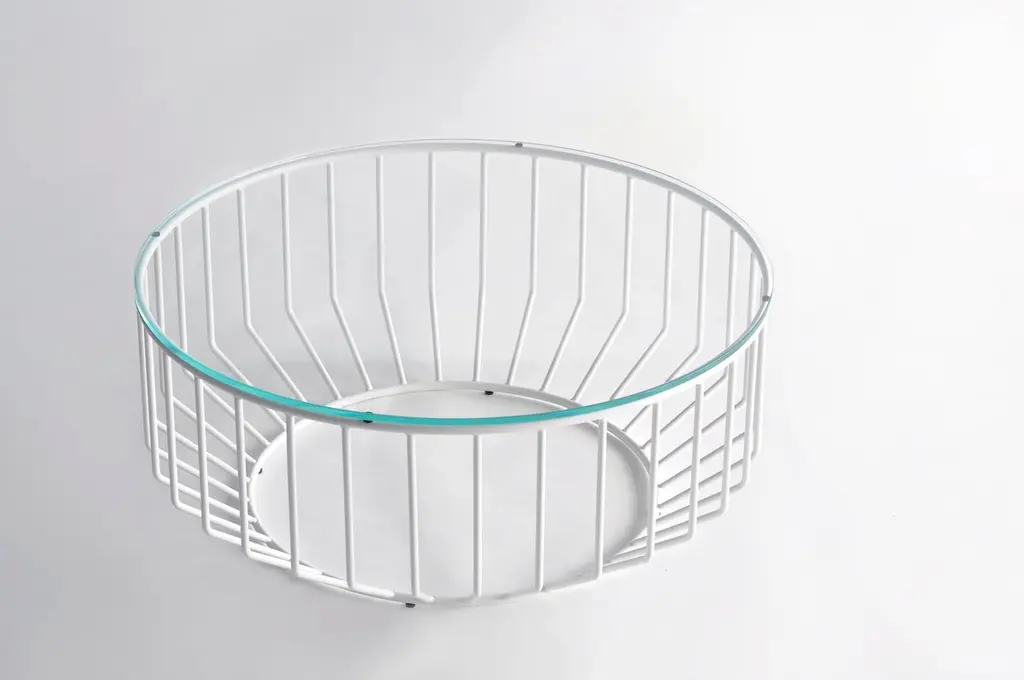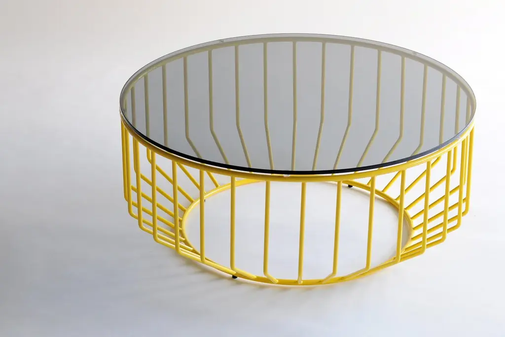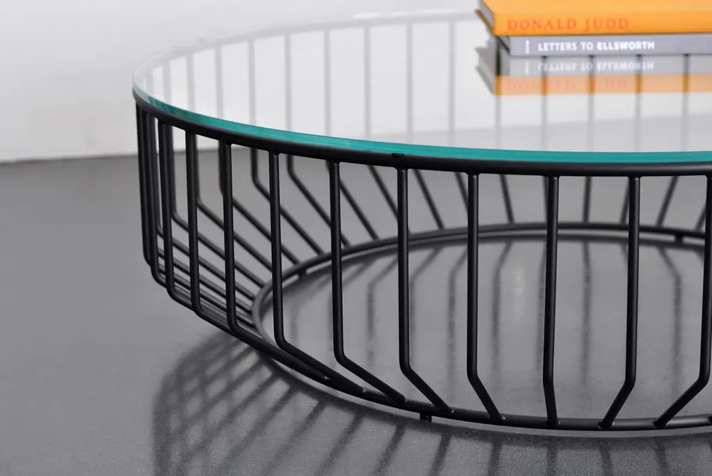 Blending sloping angles and taut lengths of bent metal are a modern interpretation of the wiry idea initially conceived by Warren Platner. The series is made up of a suite of tables, side tables and benches and fitted with luxurious solid wood, glass, or upholstered tops. By choosing the upholstered top the coffee table can serve as an ottoman.Prices exclude packing.Price is for the 32" diameter size Wired Coffee Table, in Smoked Brass and either a Bronze Glass top, Gray Glass top, or Starphire (Clear) Glass top.