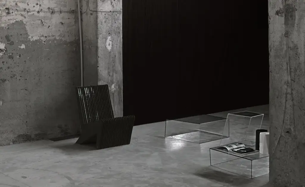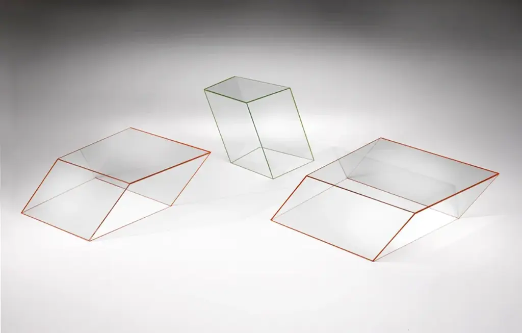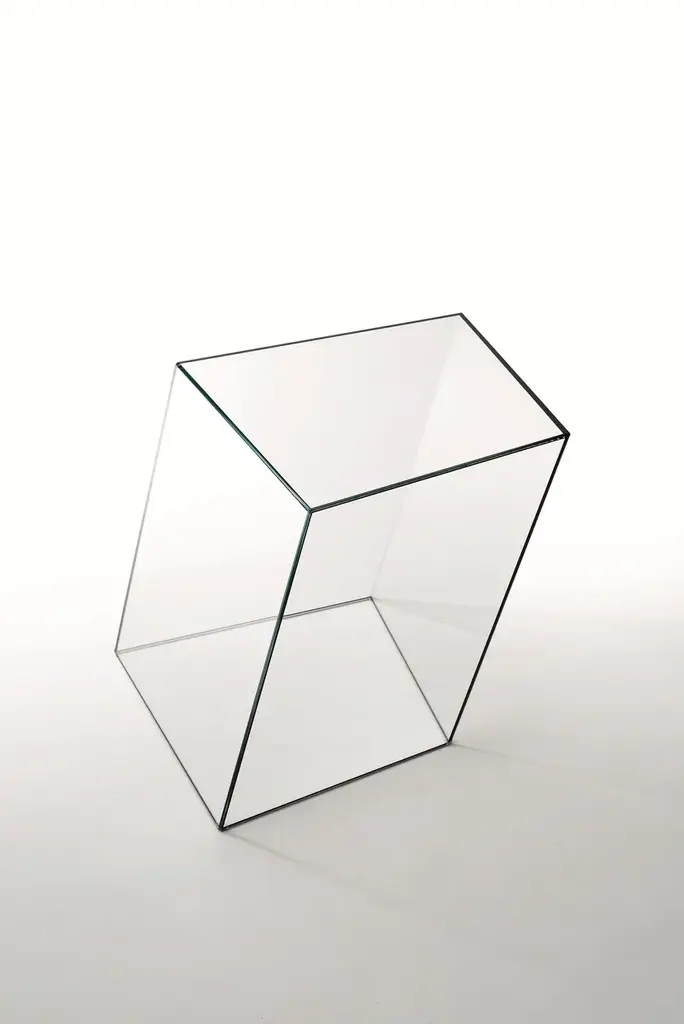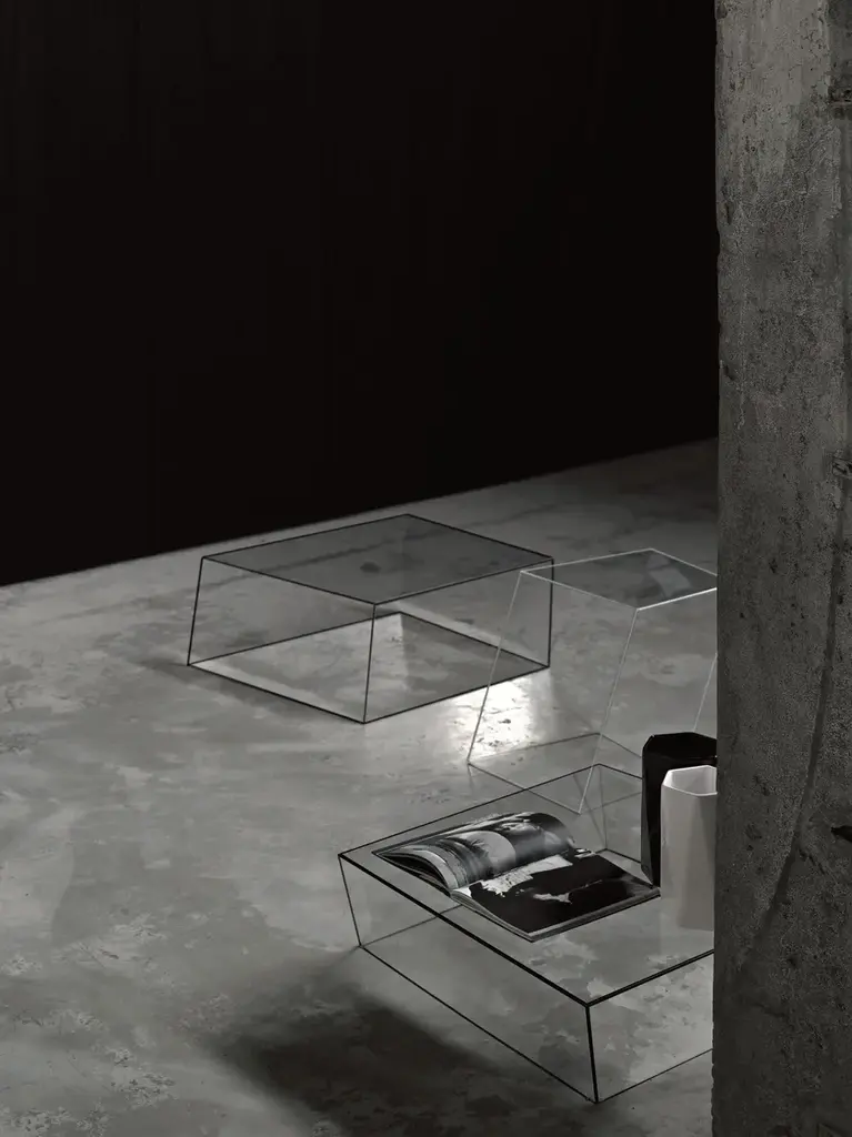 Wireframe is a series of twisted and irregular, parallelepiped shaped low tables, obtained by gluing tempered transparent extralight glass slabs, whose edges have grinding angles with each of their inclinations completely different from the other ones.The result is an apparently unstable and precariously balanced low table.The edges are enhanced by a coloured line in glossy lacquered glass.