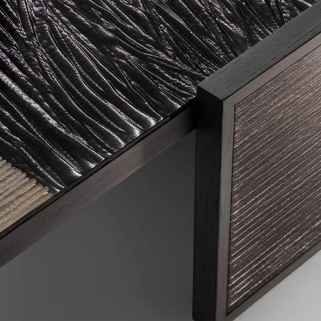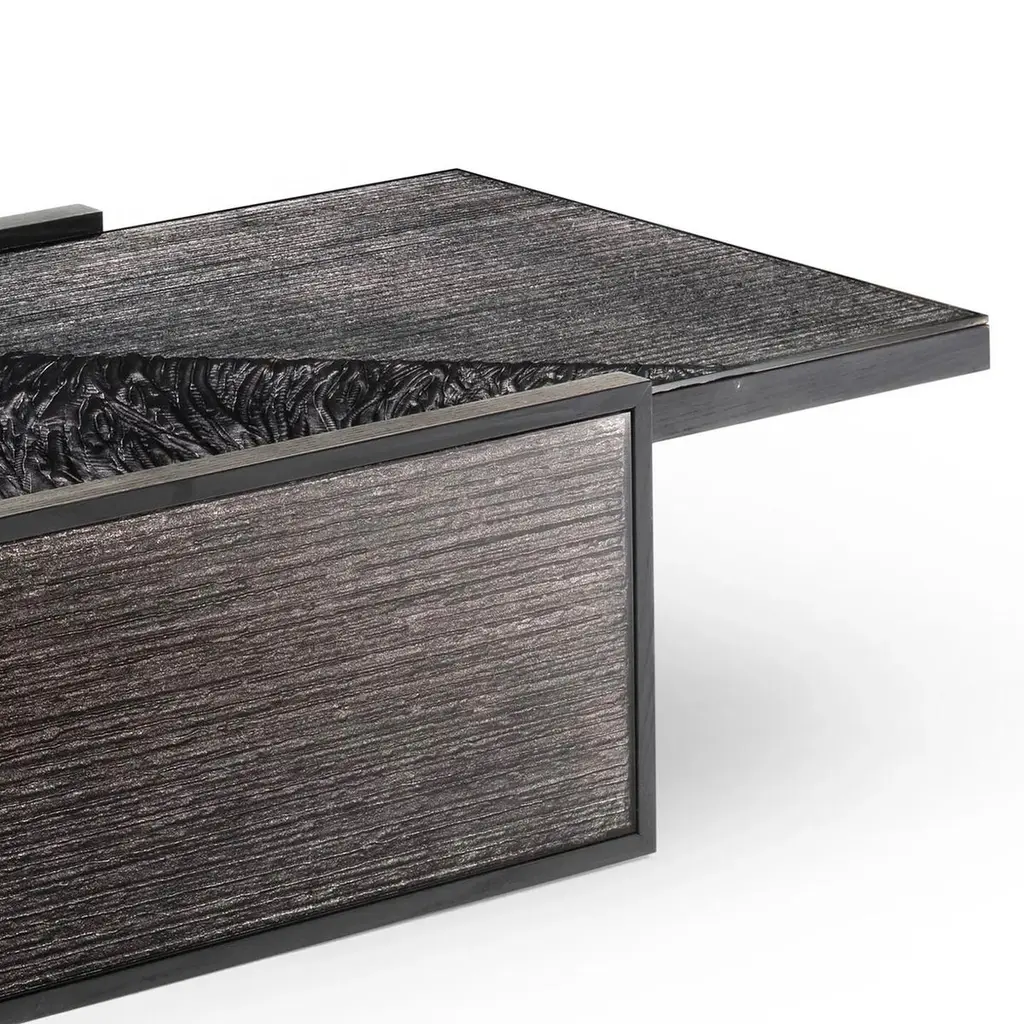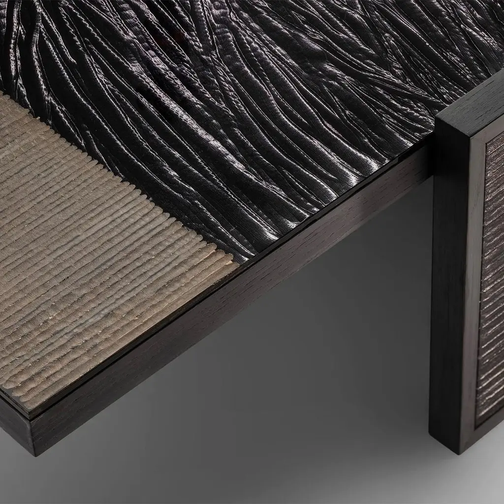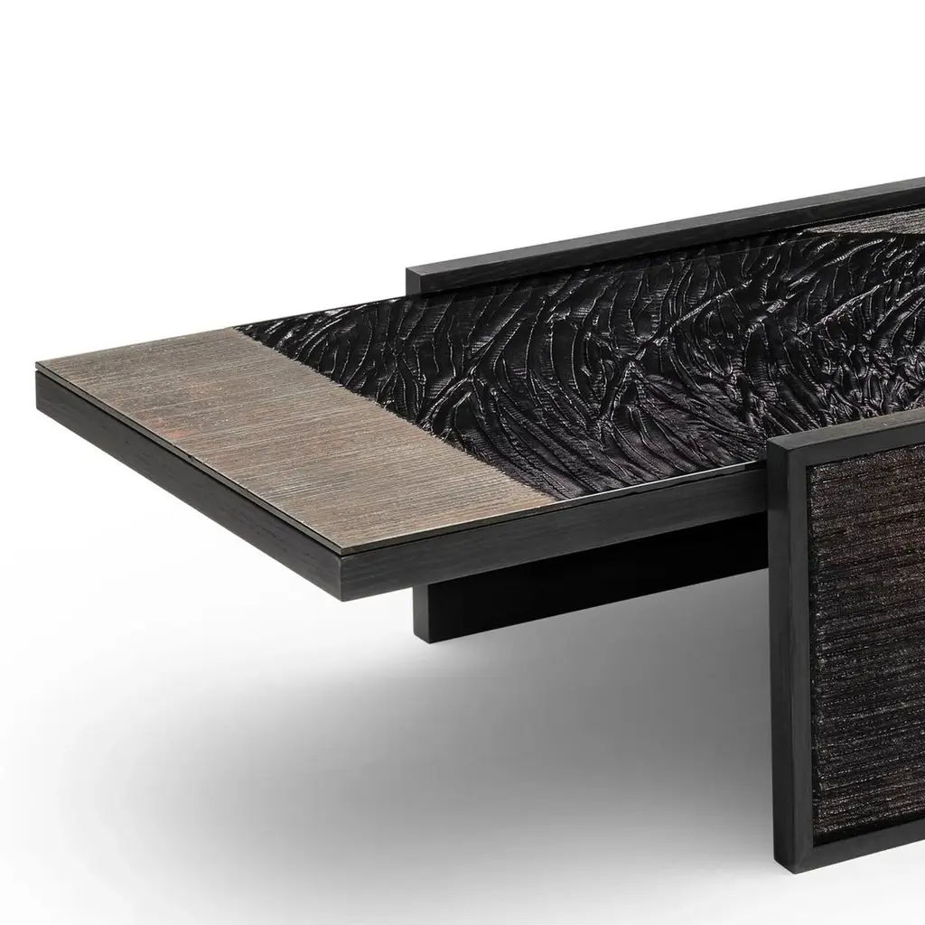 Coffee Table Woodenglass with frame structure made of ash wood in veneer stained black wood. Table top and leg sides covered with extra clear glass with engraved glass in sober umbra dark finish.