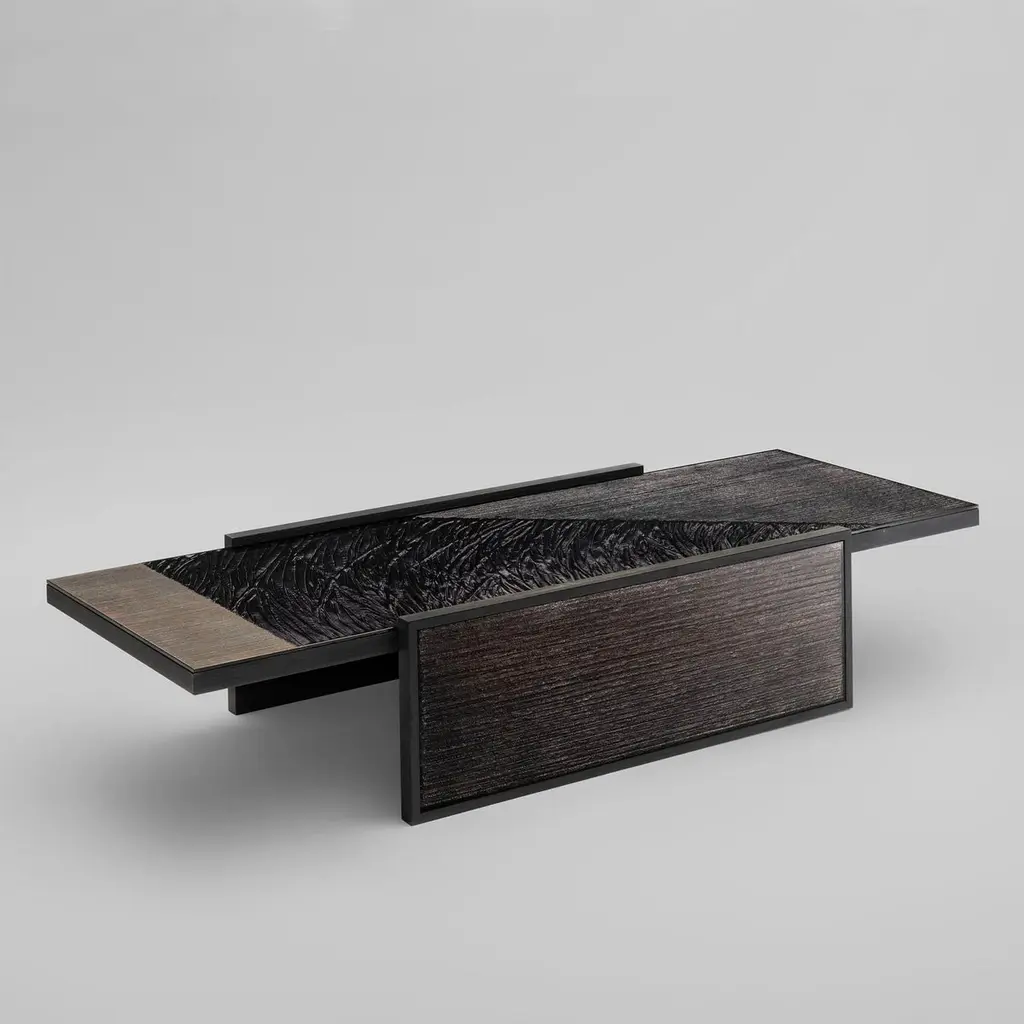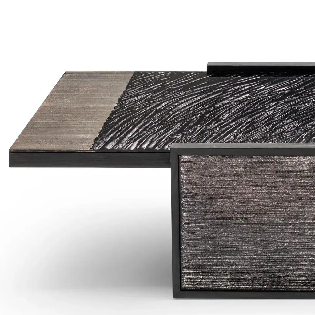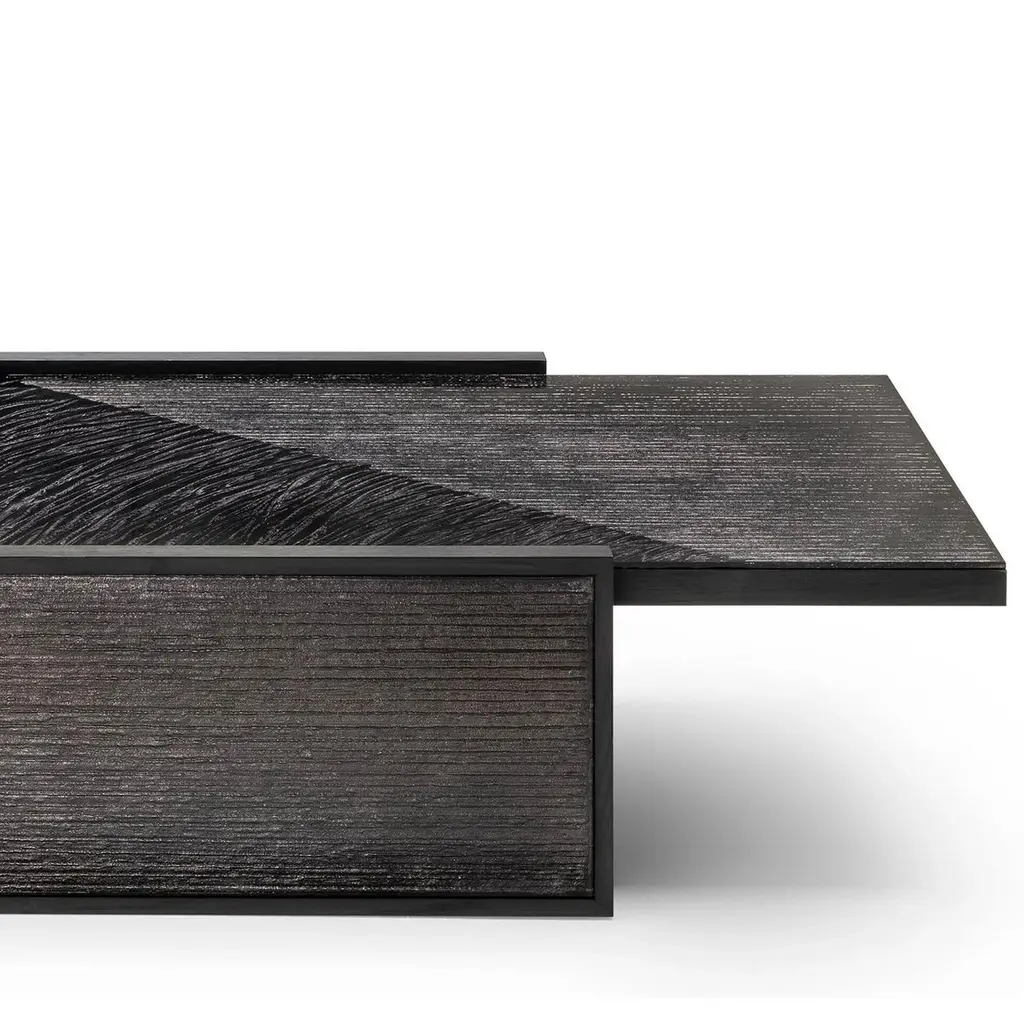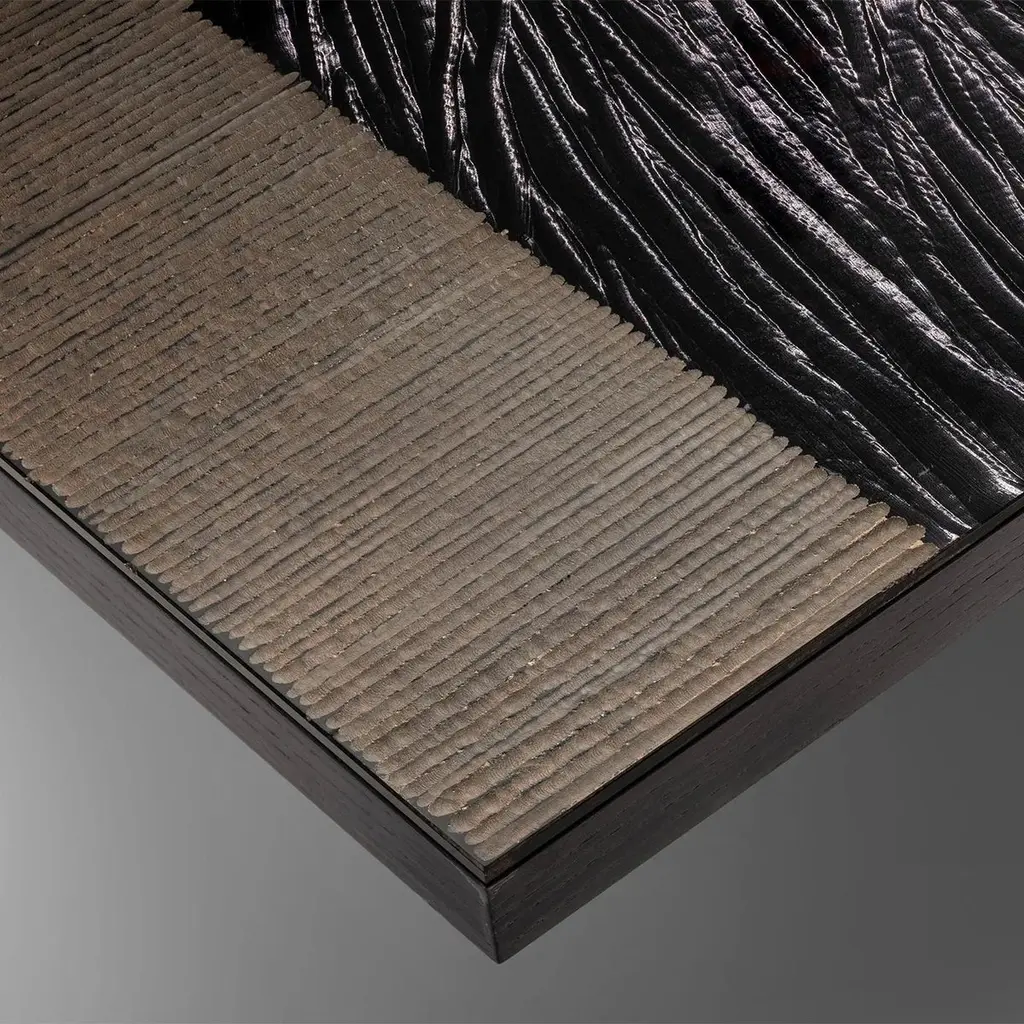 Coffee Table Woodenglass with frame structure made of ash wood in veneer stained black wood. Table top and leg sides covered with extra clear glass with engraved glass in sober umbra dark finish.