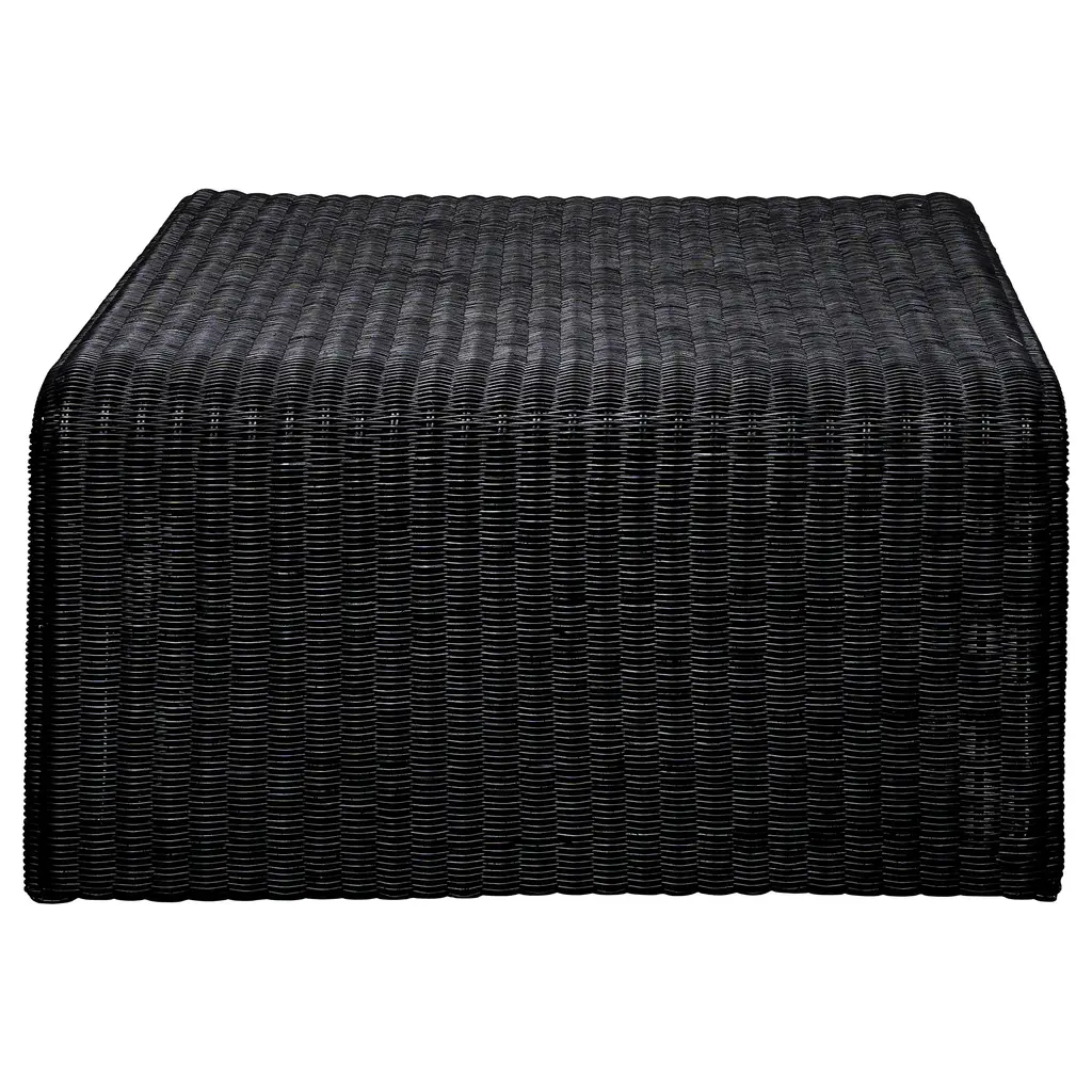 Glossy black highlights the exceptional dimension of a modern rattan coffee table. Its simple silhouette is light and airy, adding contrast to the black to provide casual elegance and plenty of texture at the center of a living room sitting area.
