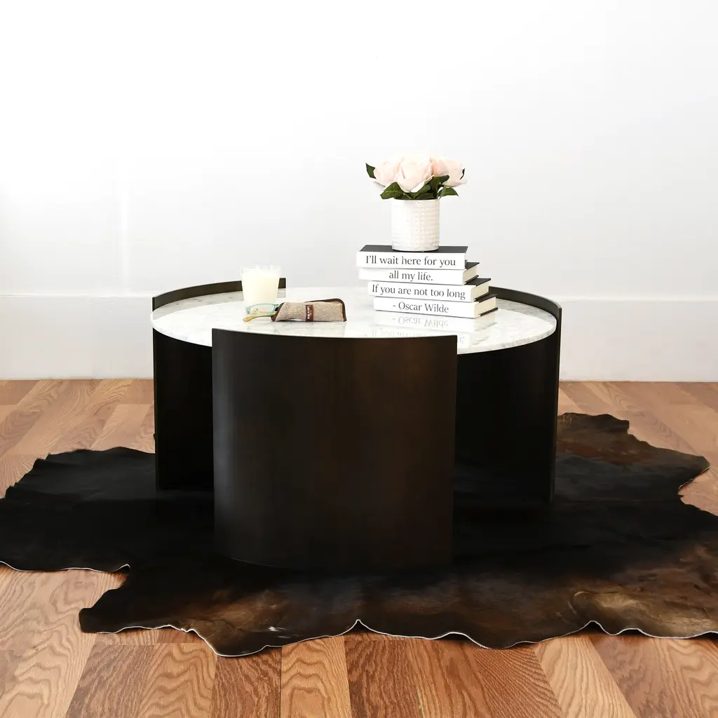 Looking for a round cocktail table with a high-style profile and durable, luxurious composition? Look no further than our extraordinary, statement-making Montana table. Three painted bronze sculptural forms enclose a luminous white marble top, creating the look that is simultaneously grounded and gravity defying.