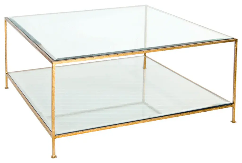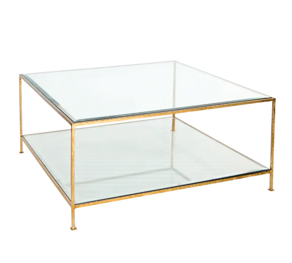 Our minimalist, square cocktail table complements almost any design aesthetic. Evoking a stately presence, this linear, two-tier iron frame is finished with lustrous, gold leaf finish. Beveled glass top and shelf keep it light and airy while offering plenty of surface area to display your coffee table books and decorative objects. An essential living room piece.