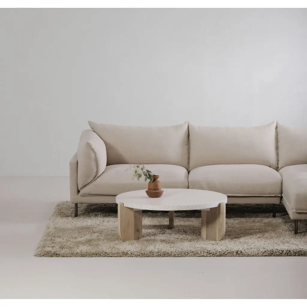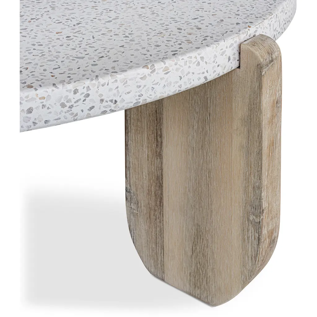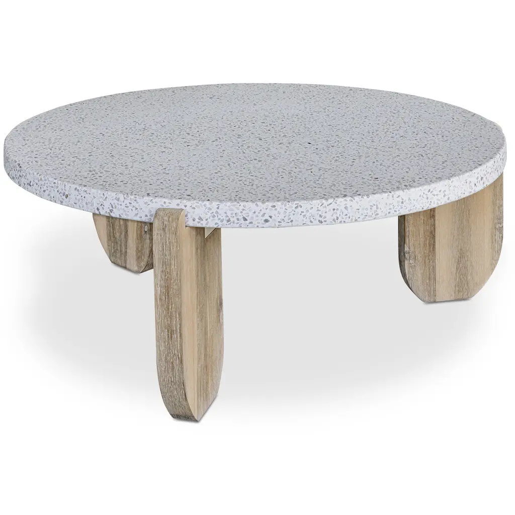 Ancient inspiration meets design innovation as the Wunder coffee table takes a monolithic statement into a low-profile silhouette. A round terrazzo tabletop perfectly matches the organic texture and sturdy support of solid acacia legs, the bold design offset by soft rounded edges.