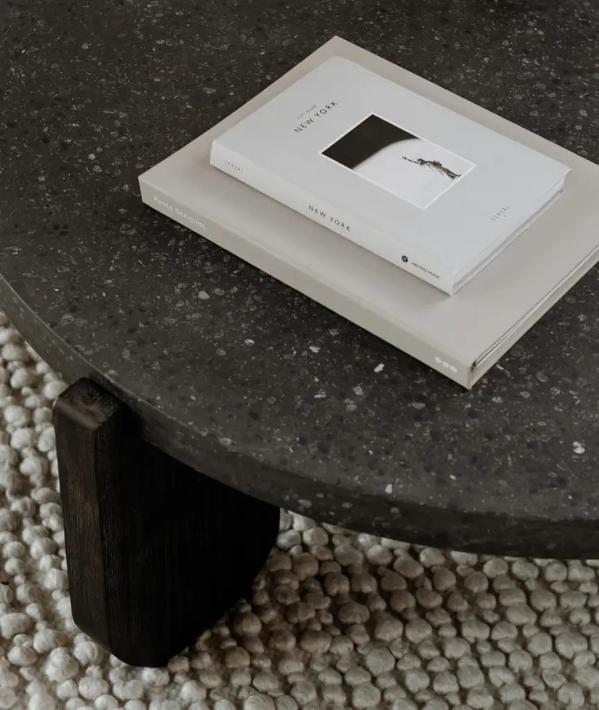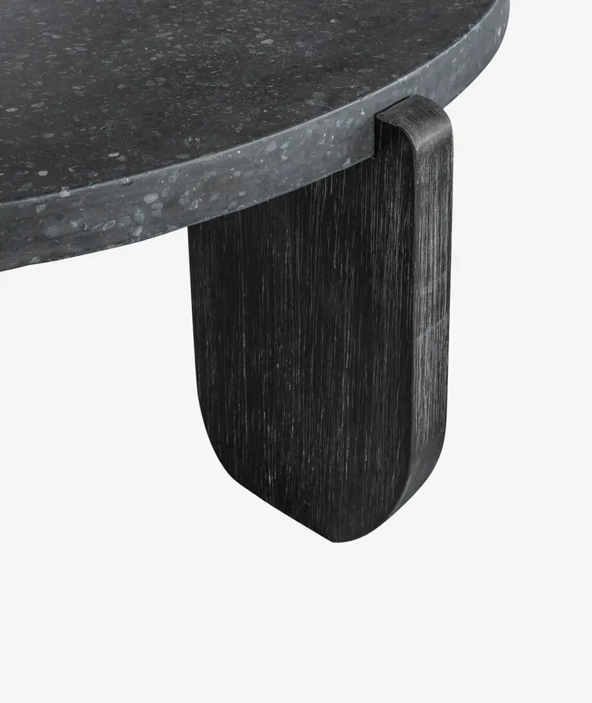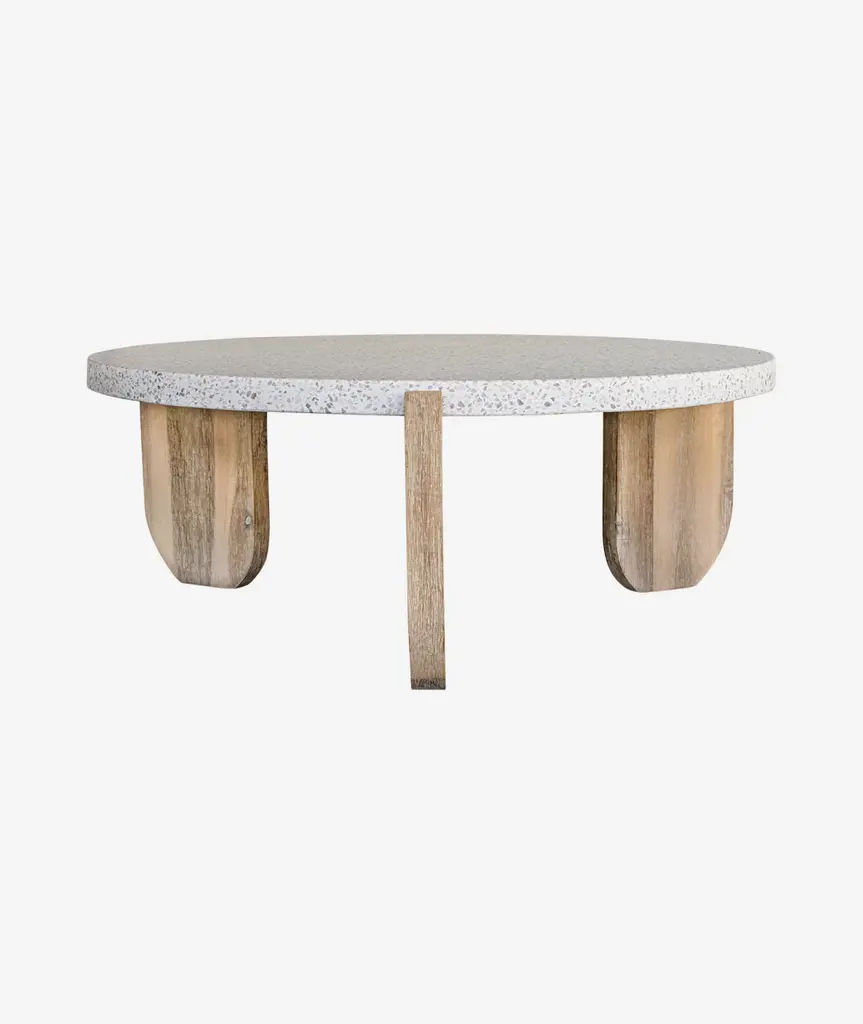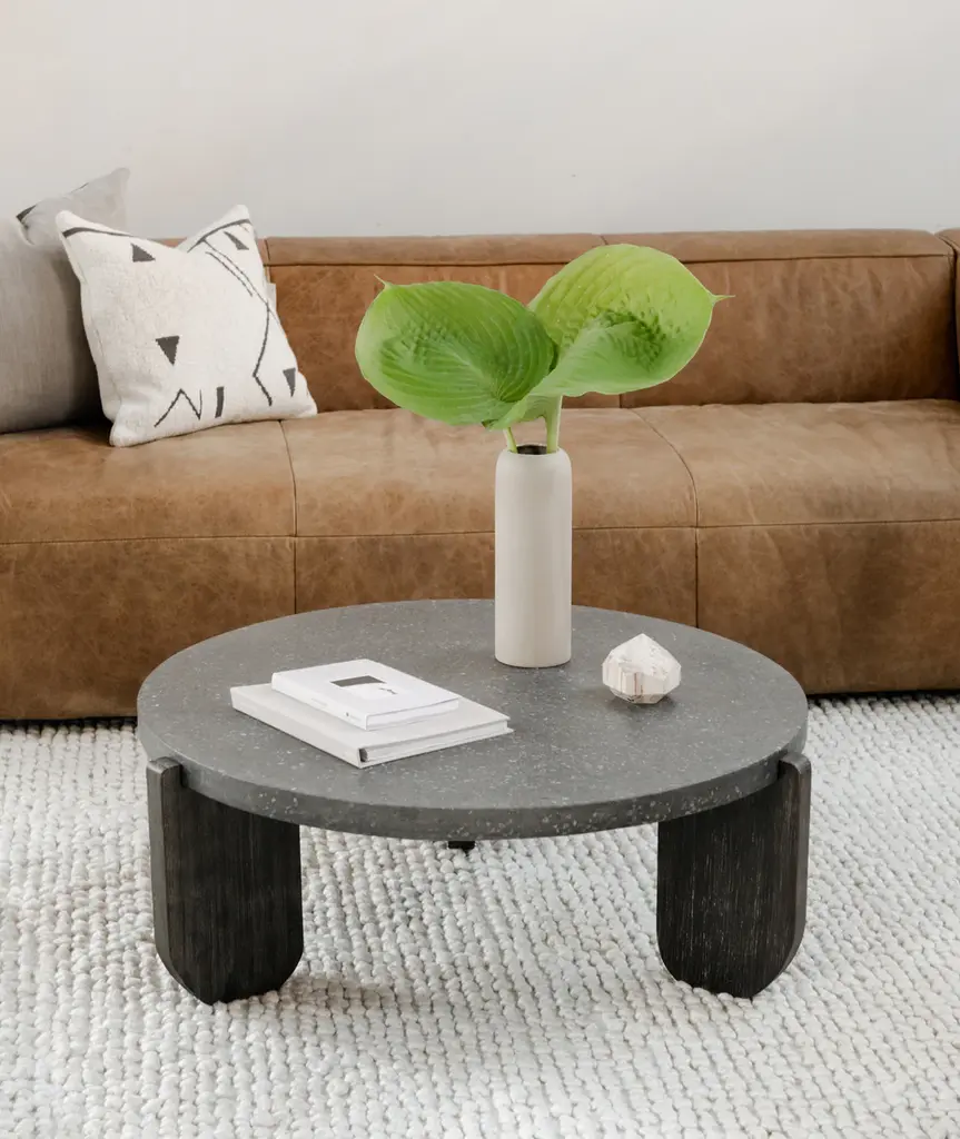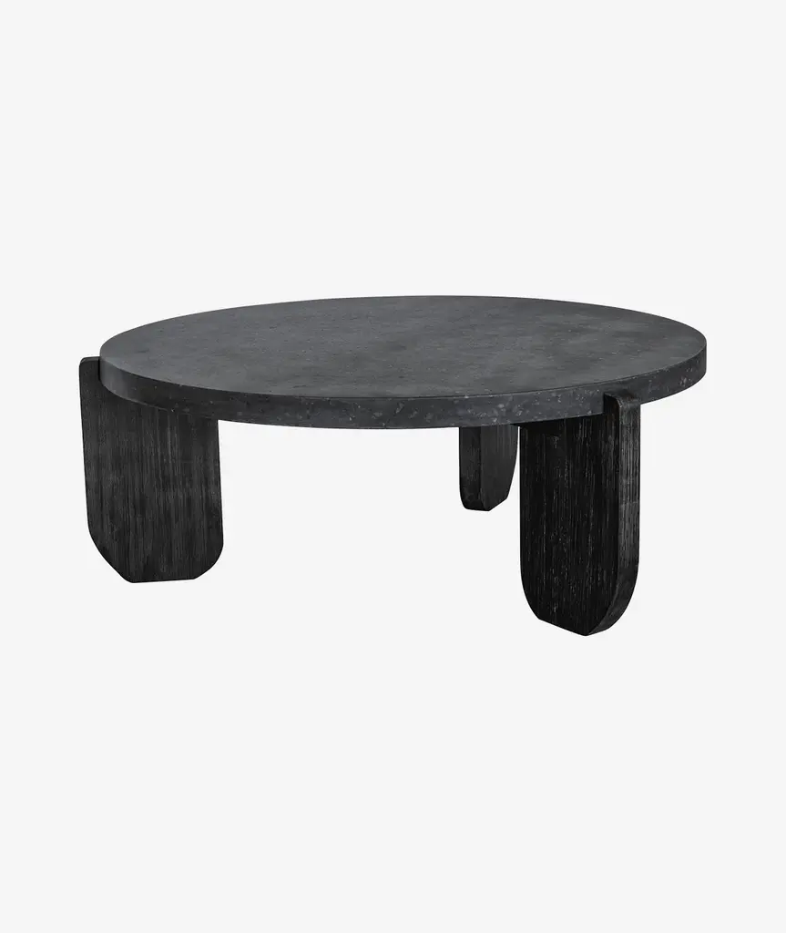 Ancient inspiration meets design innovation. Strikingly dark, the Wunder coffee table takes a monolithic statement into a low-profile silhouette to keep your space strong. A round concrete tabletop is perfectly matched by the organic texture and sturdy support of solid acacia legs, the bold design offset by soft rounded edges. Wonderfully versatile, this coffee table wouldn't look out of place in a modern apartment or the hanging gardens of Babylon. Consider it mid-Mesopotamian modern- or feel free to consider it the bold new centerpiece for your living space.