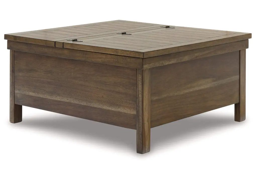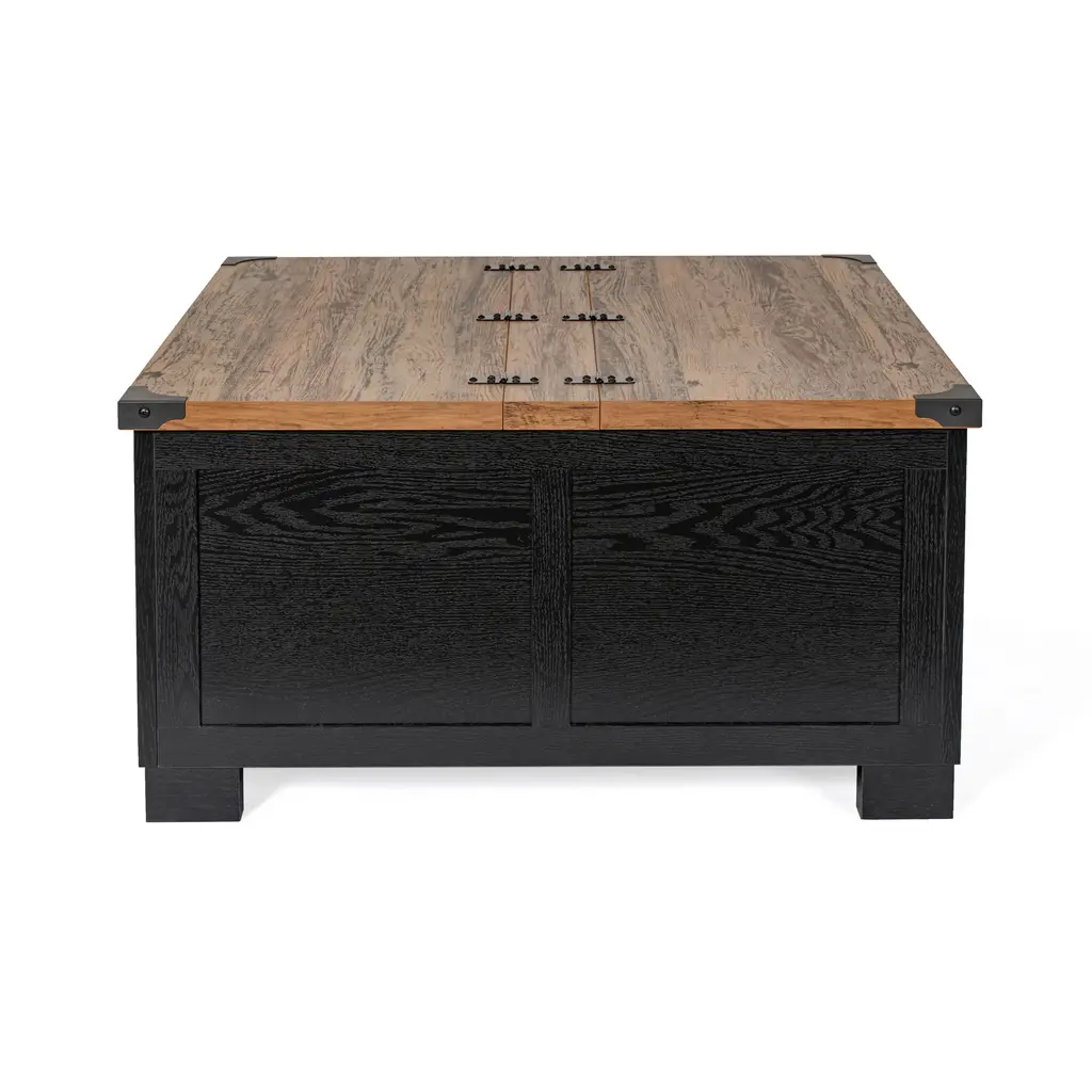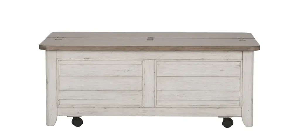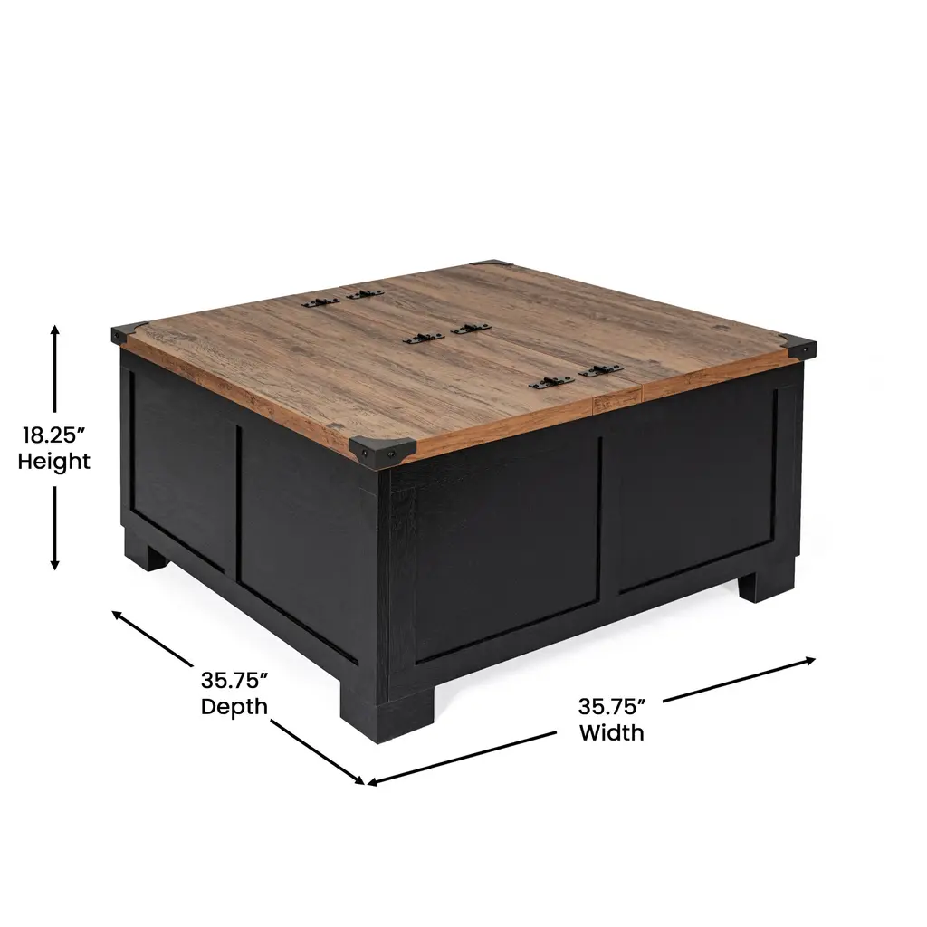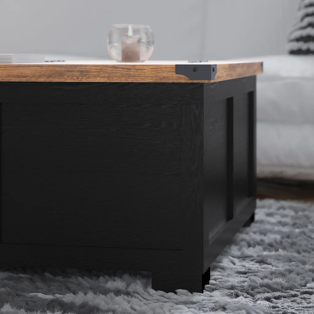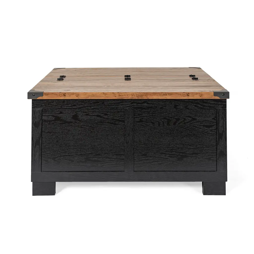 Add rustic charm to your living space with this dual hinged lift top farmhouse style coffee table with storage. Finished in a richly hued color scheme and adorned with metal hinges and corner pieces, this coffee table fully embraces the forward-trending modern farmhouse style. The generous table top provides an excellent spot for game play, snacks, or resting your feet at the end of a long day. Robustly crafted from strong and sturdy engineered wood, this large coffee table with storage holds up to 200 lbs. static weight to keep games, blankets, or kids toys completely accessible but hidden from sight for a tidy appearance. The addition of pneumatic hinges that lock in place when the tops are open aids with safety and noise reduction. Easy to assemble and maintain, this coffee table assembles in 60 minutes or less and wipes clean with a dry cloth.