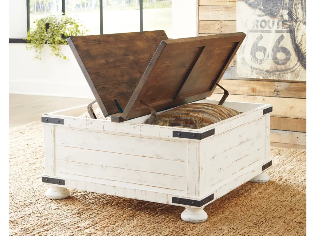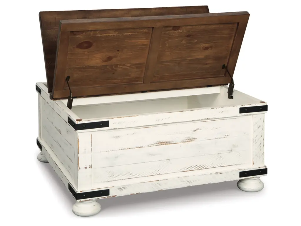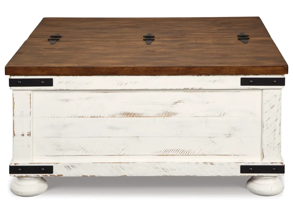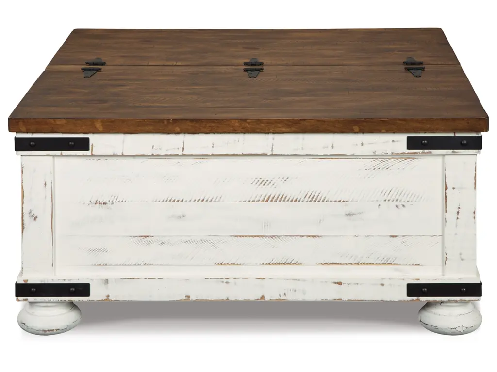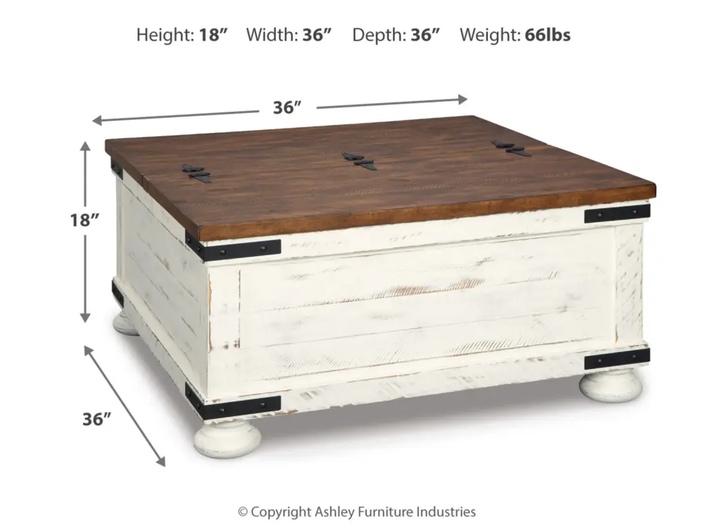 Double take. Sporting a two-tone finish, dual-sided lid design and expansive storage space, the Wystfield square coffee table takes the art of rustic farmhouse living to a new level. Designer touches include plank-effect styling, heavy distressing and industrial bracket hardware.