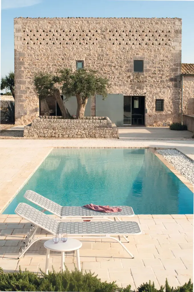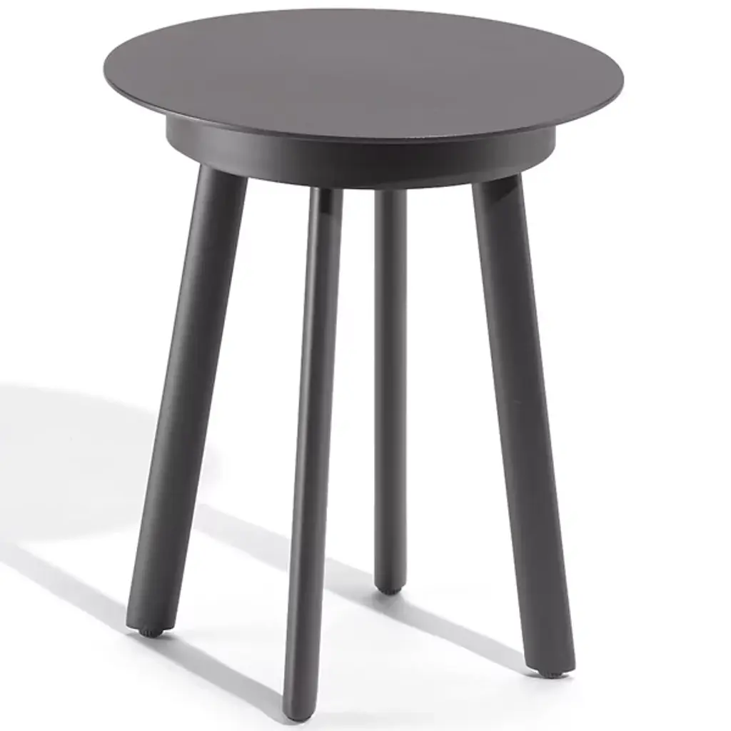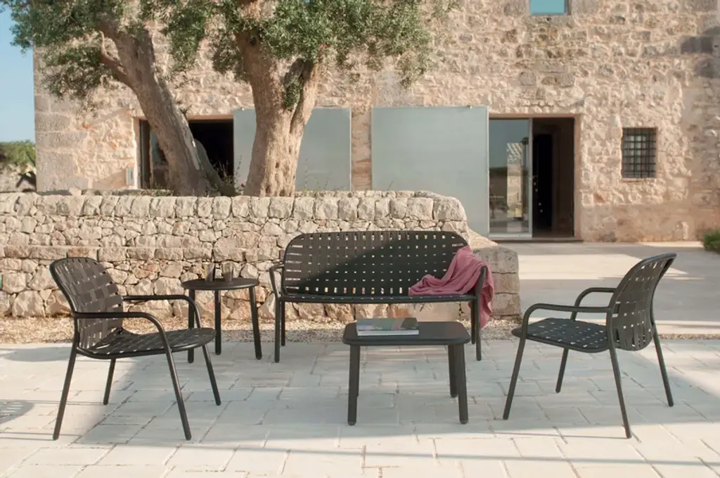 Yard is a low garden table with a round top made of painted aluminum.The woven elastic straps, joined in an innovative way to the sophisticated aluminium frame, give life to a collection defined by outstanding, eclectic style and superb comfort, perfectly suitable for outdoor uses. Yard is a complete range of furniture, made up of a chair, armchair, fixed tables, relaxing armchairs, coffee tables of various sizes and a sunbed. The signature feature of the Yard collection is the way it mixes materials, such as stainless steel or ash with aluminium. The collection is completed with counter tables of various sizes, for both contract and residential settings.