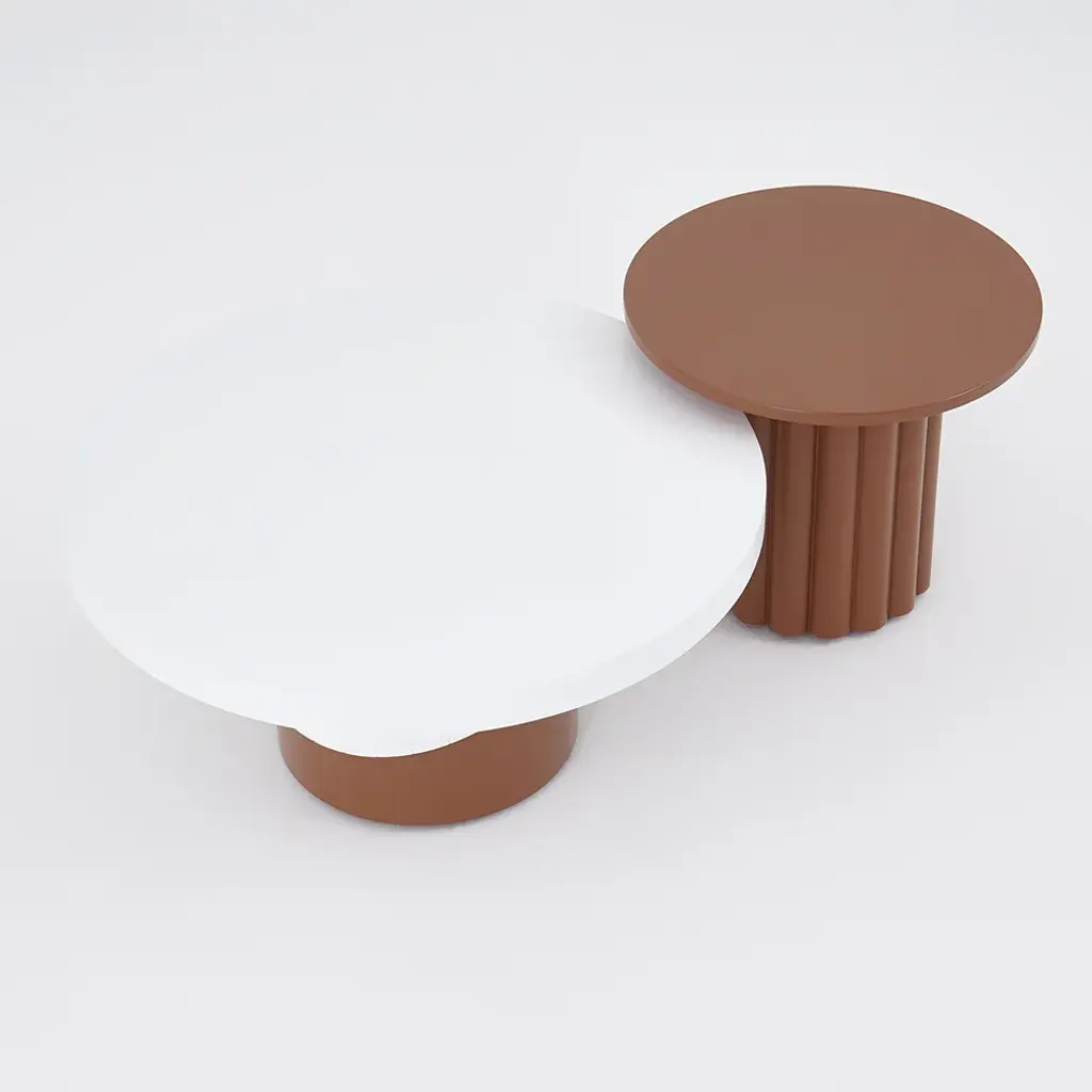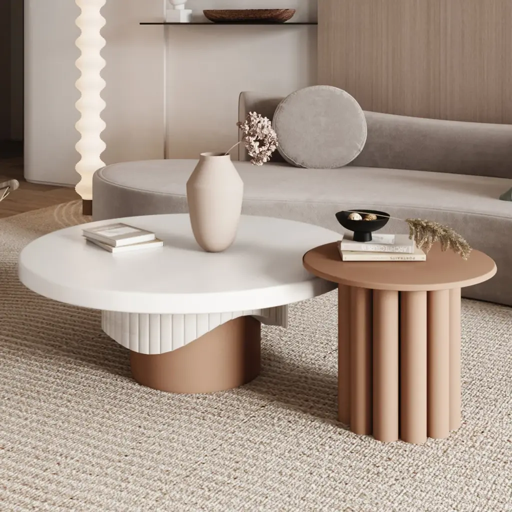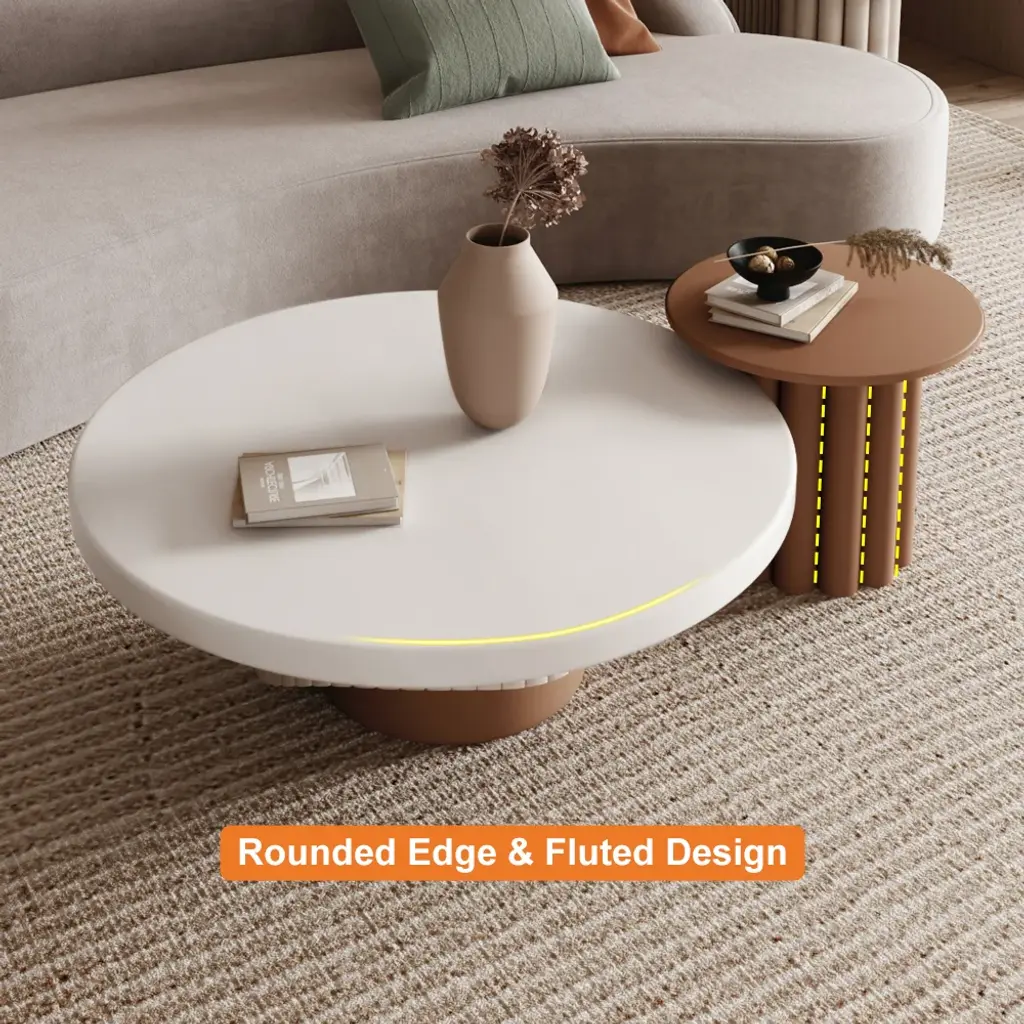 This Japandi 2-piece coffee table set features elegant fluted bases and round tops in white & walnut. Crafted from durable MDF, the minimalist design brings serene beauty to any space. Arrange them together or separately to create your perfect layout.