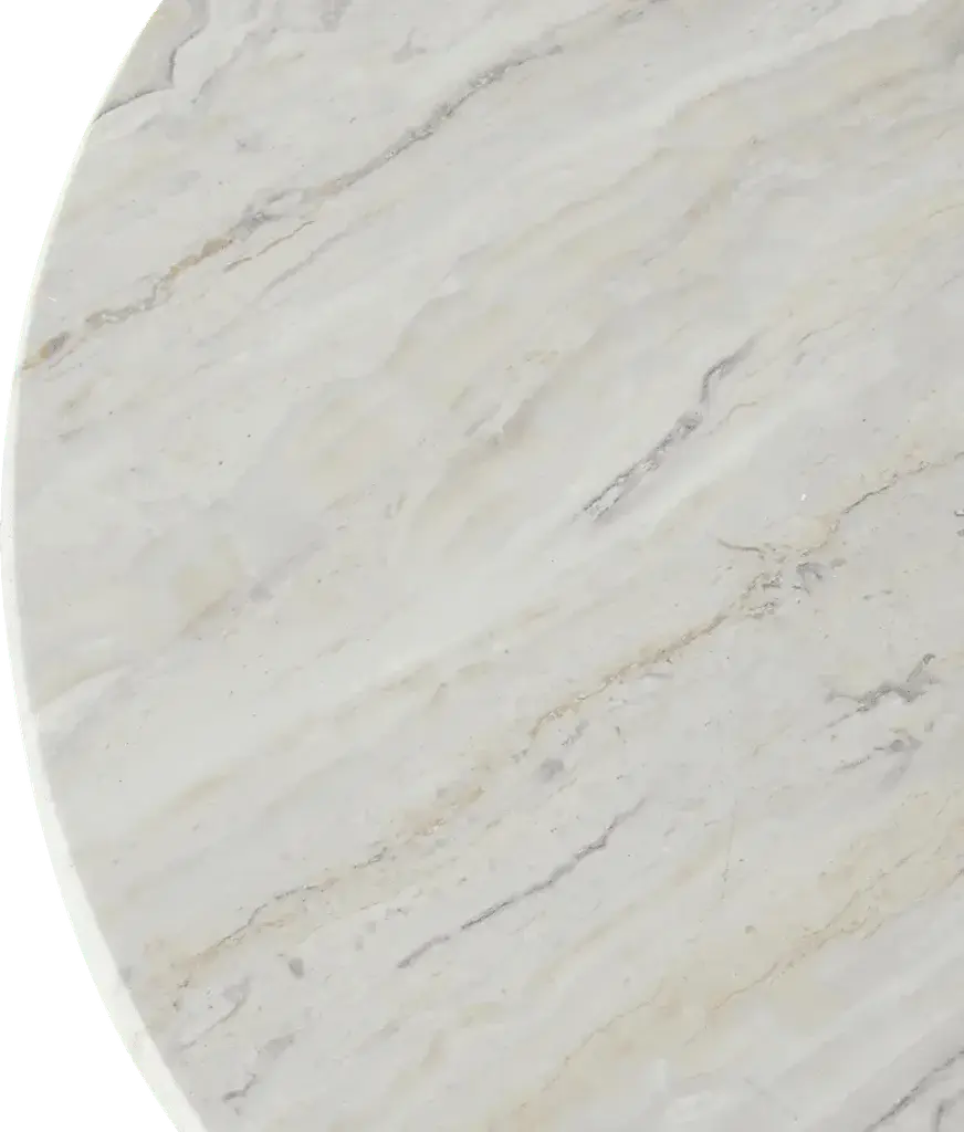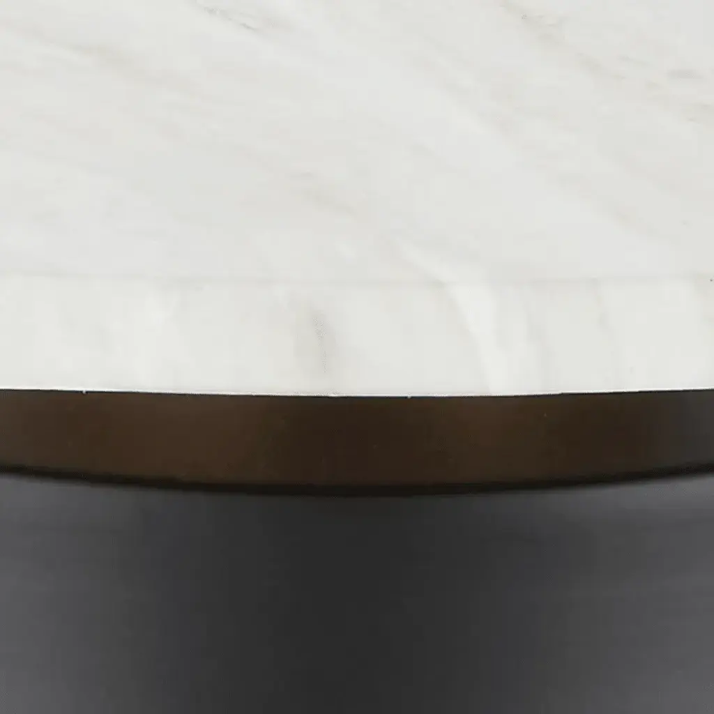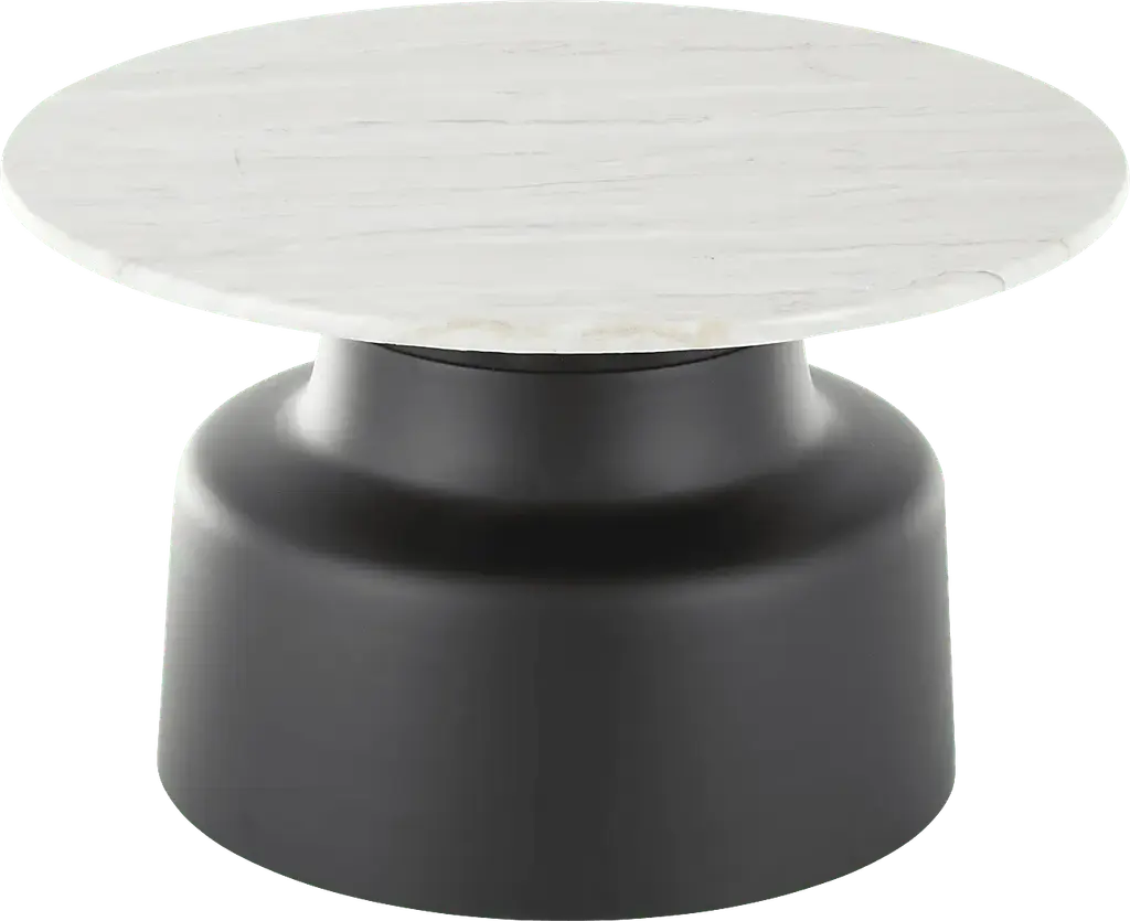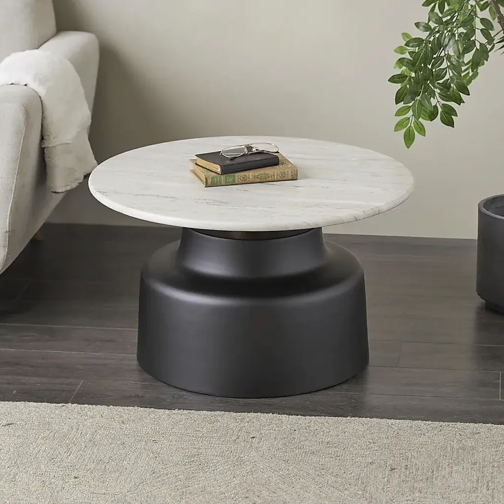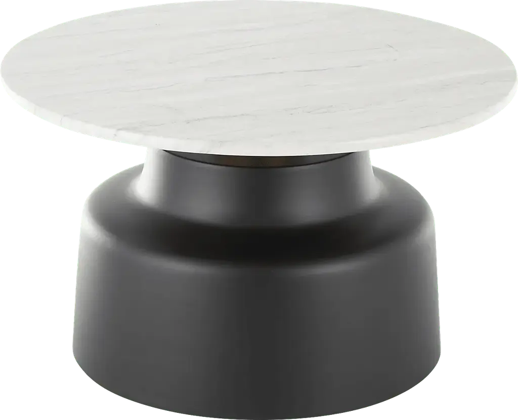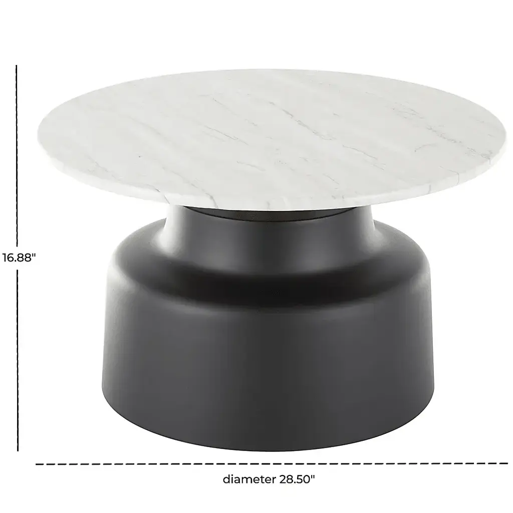 Embrace artistic expression with a style that highlights bold designs with sleek lines, neutral elements, and a minimalist aesthetic with the Yegi coffee table. The black living room coffee table is crafted from high-quality matte black iron, topped with a pristine white faux marble finish on MDF, creating an exquisite blend of durability and sophistication. Cylinder living room furniture exhibits a wide round design, showcasing a contemporary matte black finish that perfectly contrasts with the timeless elegance of white marble painted on its wooden top. A striking feature of this metal coffee table is the pristine white marble-inspired tabletop, adding a touch of luxury to its design. Customer assembly is required.