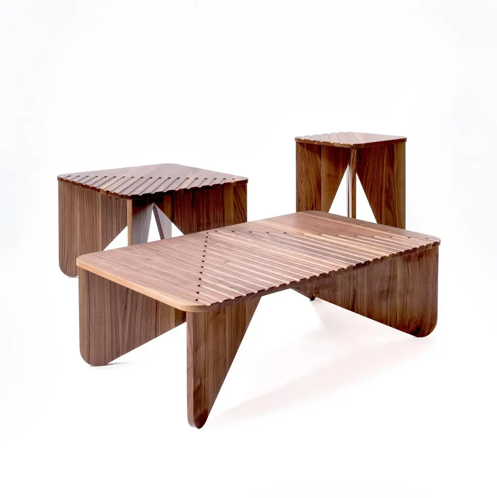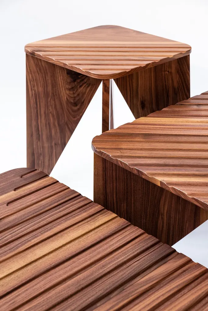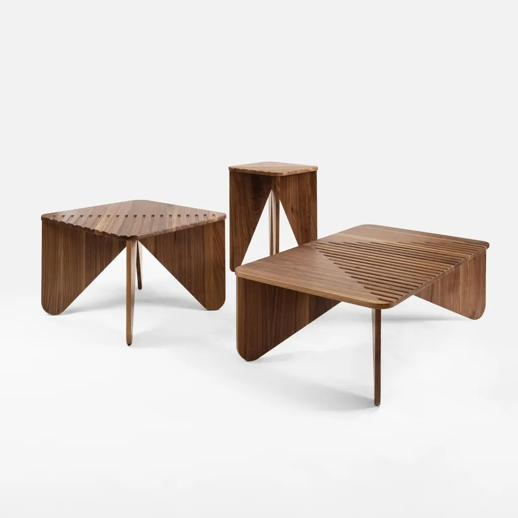 Yoko collection designed by Serena Confalo-nieri for Medulum consists of 3 wooden coffee tables.The pieces are characterized by the repetition of trian-gular elements, which visually refer to the Japanese art of origami.This recourse to geometric repetition is further high-lighted through the creation of an embossed linear texture which, on the surface, generates further ge-ometries, while, on the legs, it leads to different front and back of the surface, just like a sheet of paper.Various heights and sizes allow this coffee table collection to be placed both inside private homes, living and sleeping areas, and in public and hospitality facilities.The Yoko coffee tables are entirely made of solid Canaletto walnut. The geometries are made by precise craftsmanship of the profiles and engravings on the table tops.