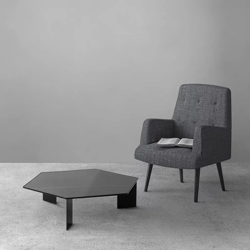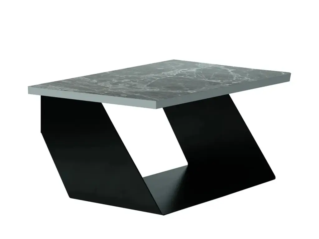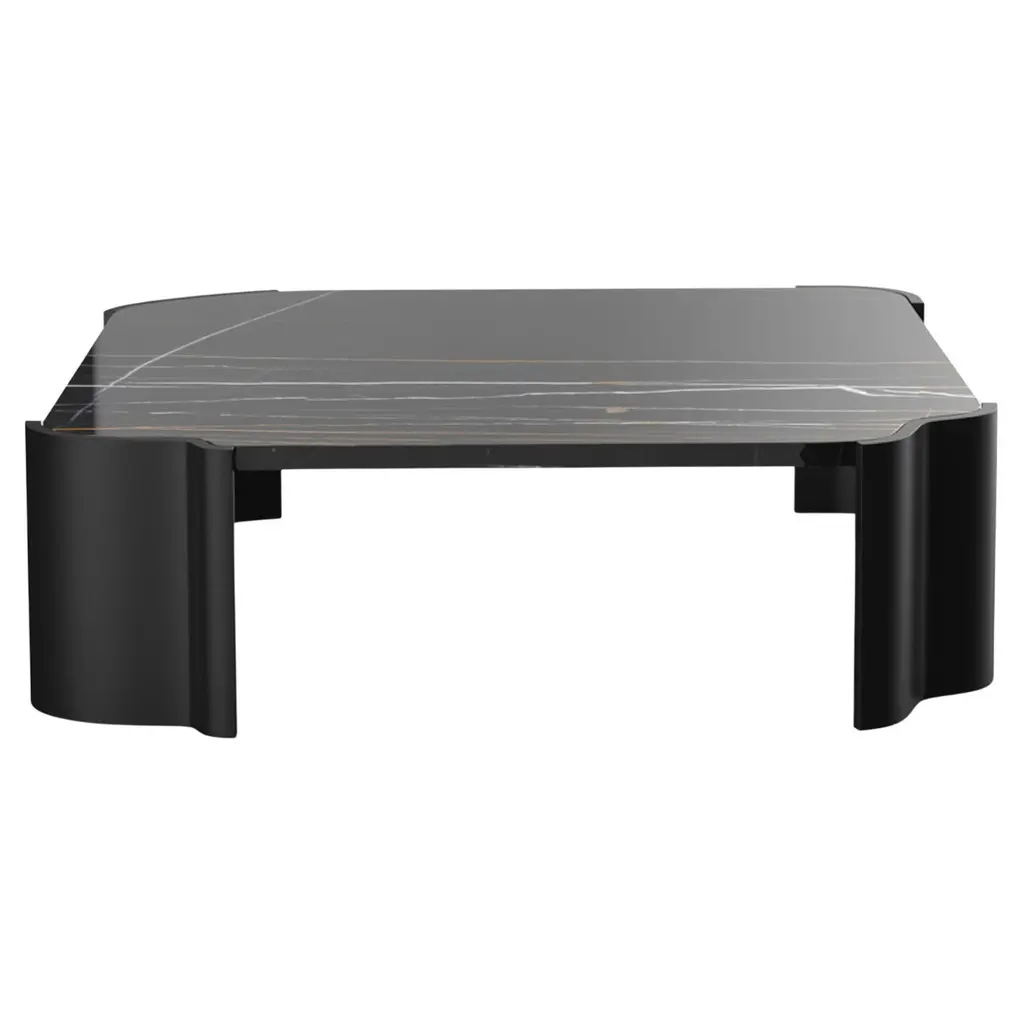 "Yso" is a small table with amazing geometric lines. The structure is available in black or brass painted iron, while the top is made with black ceramic tile with a Marquinia marble effect.