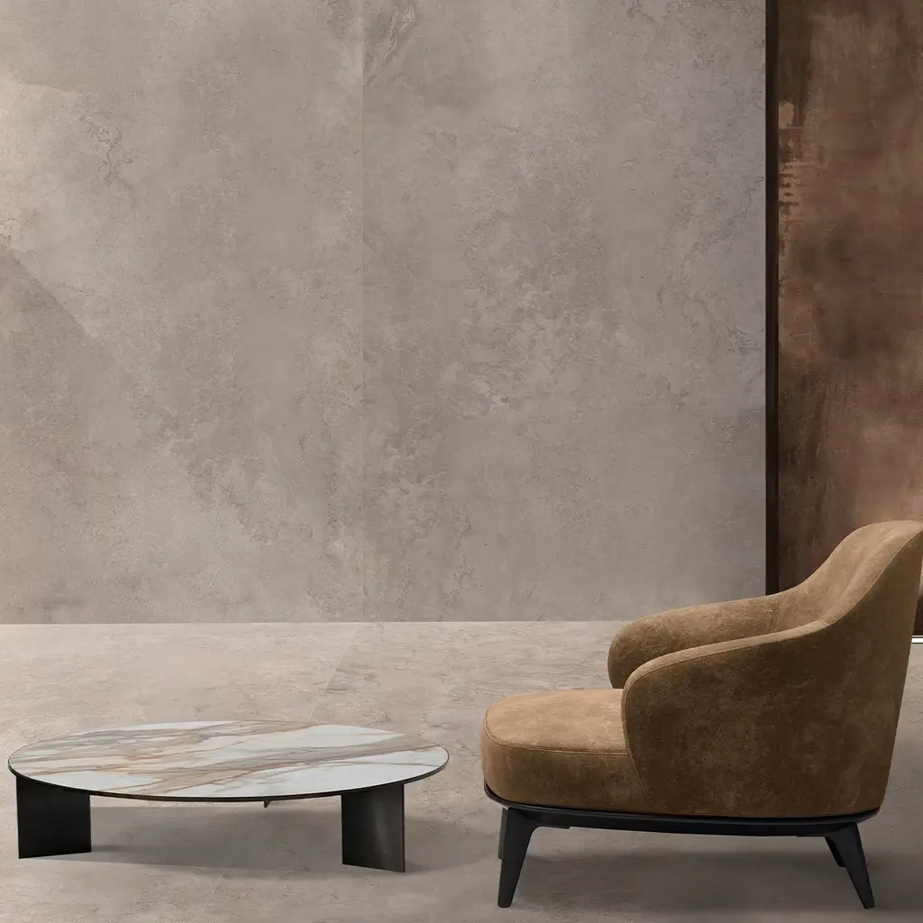 "Yso" is a small round table with amazing geometric lines in its structure. The structure is available in black or brass painted iron, while the top is made with black ceramic tile with a Calacatta Macchia Vecchia marble effect.