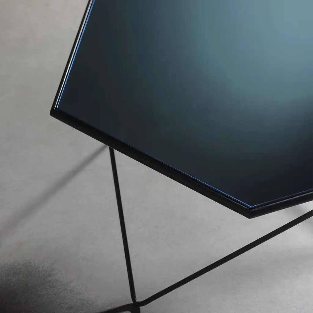This unique, extremely modern coffee table stands out due to its geometric shapes and use of sleek materials. Its black metal base offers a play on thin, criss-crossing lines, while its hexagonal top features a serene, mirrored surface, creating an item with a great amount of visual complexity. The brand has been making furniture in Florence since 1898.