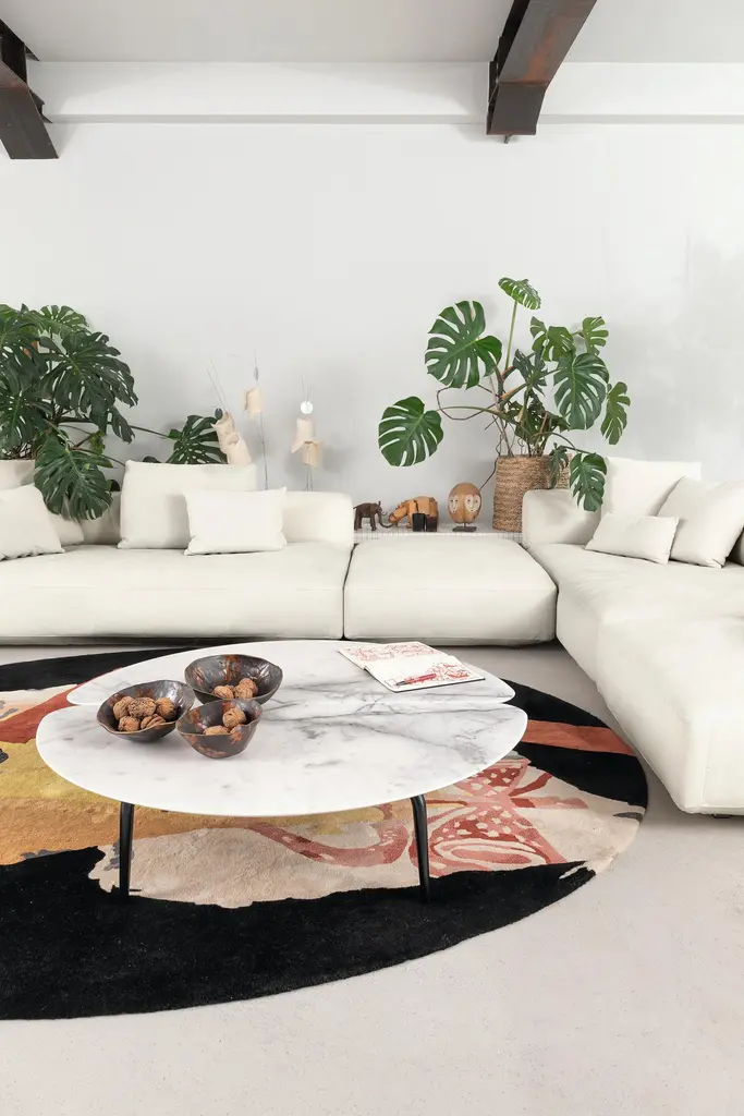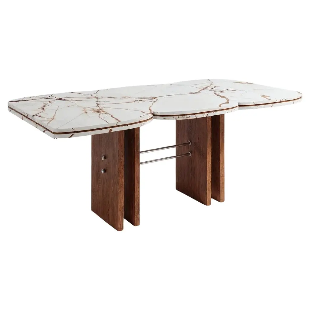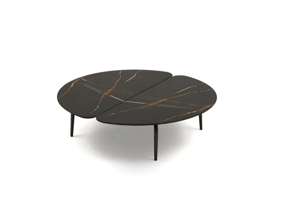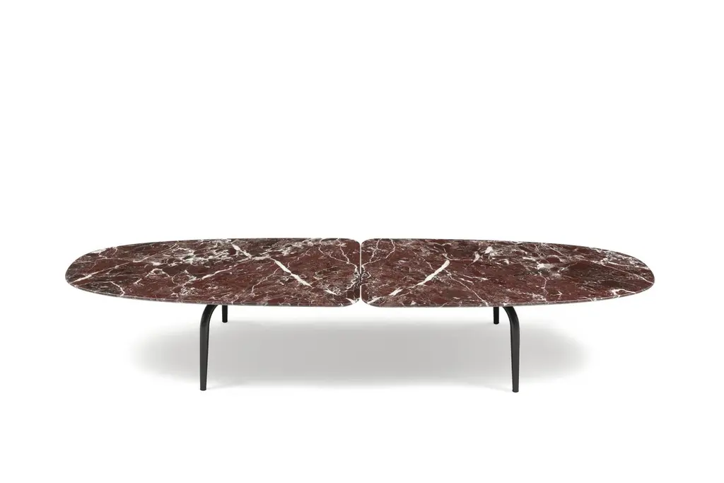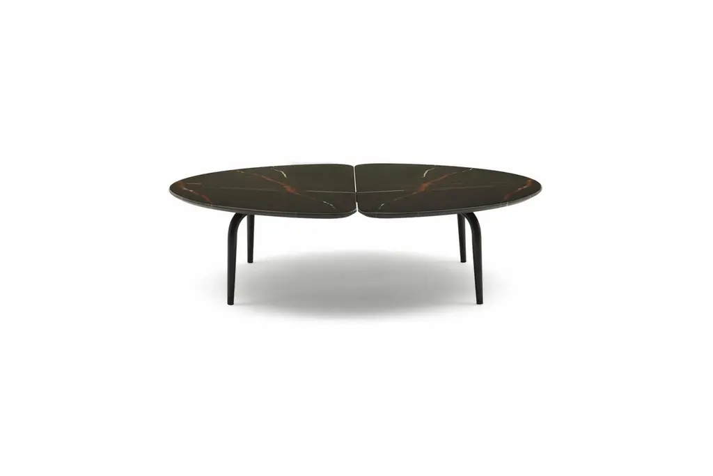 Small tables. Black varnished steel frame. Tops available either in grey Calacatta marble, in red Lepanto marble or in Sahara Noir marble with stain-resistant protective varnish, in clear matt polyester.Two coffee tables inspired by two concepts and two natural elements: graphism and symmetry, marble and tropical butterflies. By combining these seemingly contradictory elements, the ethereality of a wing beat and the solidity of stone, we’ve created a furnishing complement of contemporary taste: a solid top in natural marble supported by a slender, organic structure in steel.