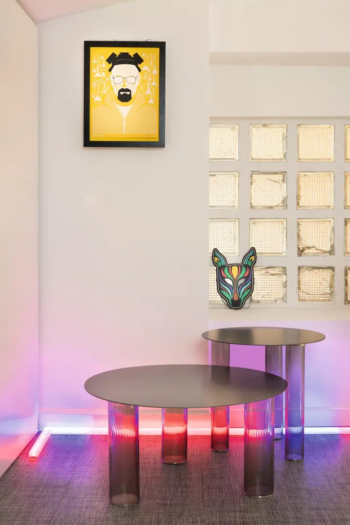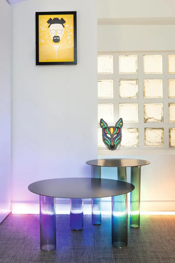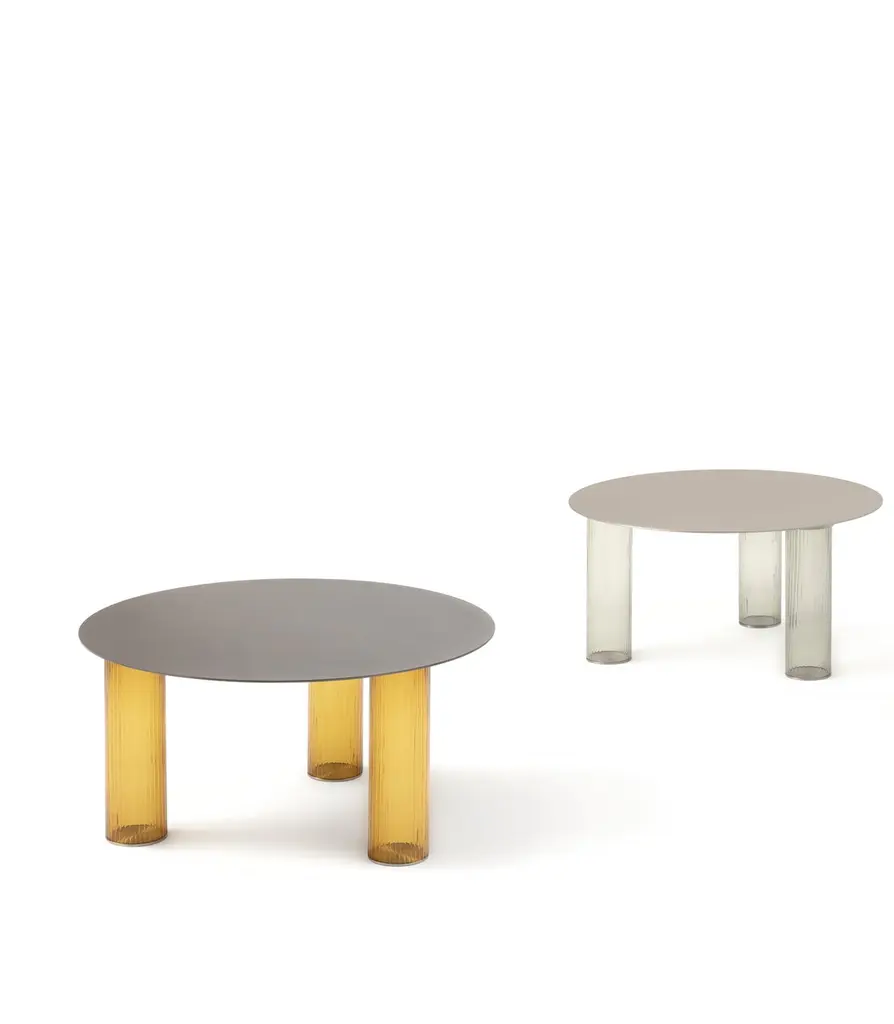 Ø 48 h 44 & Ø 68 h 34Coffee table. Three-layered blown glass legs in the shades smoky grey or amber. Steel sheet top, 4 mm thick, with either natural or blacknickel-satin finish.Sebastian Herkner, renowned for his particular sensitivity toward glass, designed a pair of small tables where the glass strength and durability are axiomatically used for developing the concept of the entire product.Three-layered blown glass legs in the shades smoky grey and amber. Steel sheet top, 4 mm thick, with either natural or black nickel-satin finish top, 5 mm thick.
