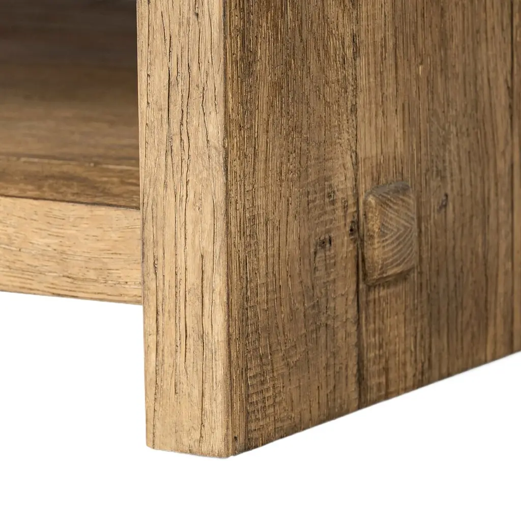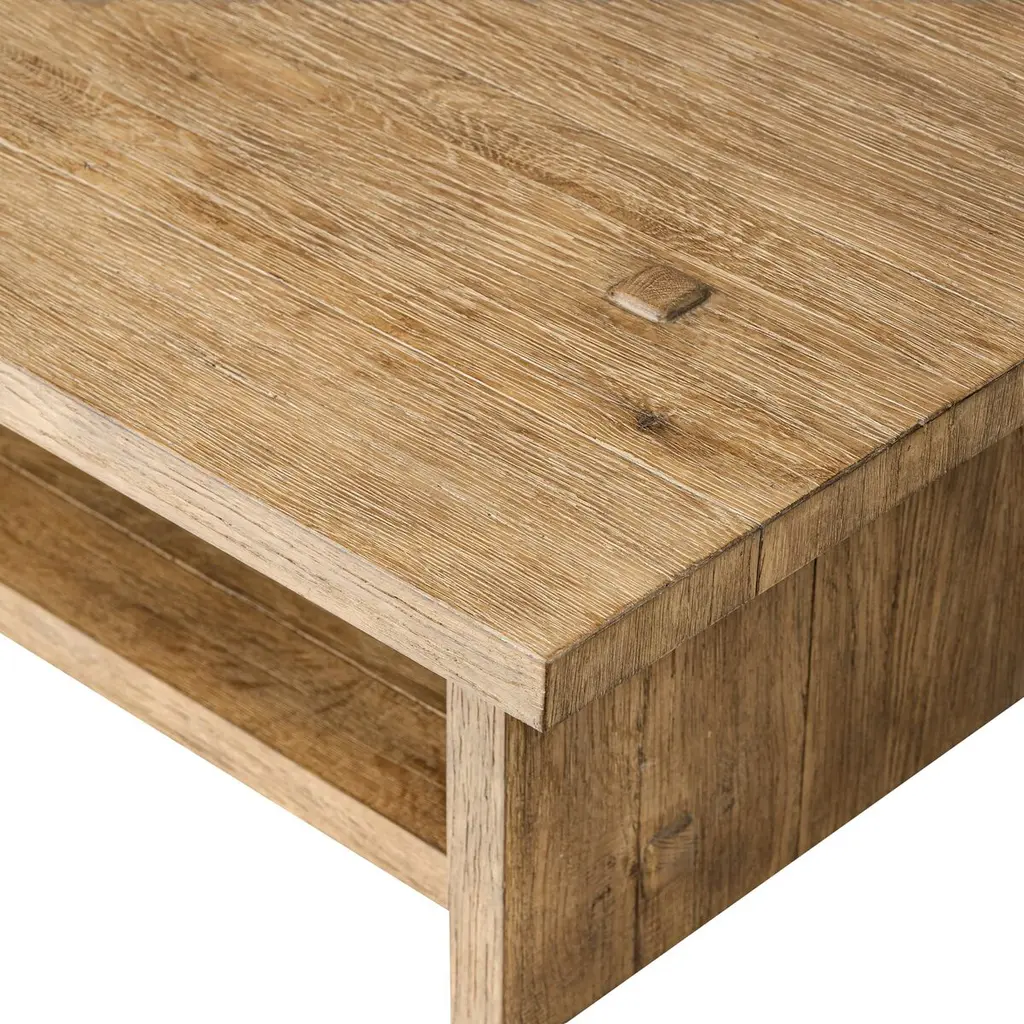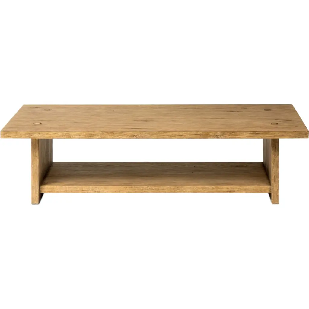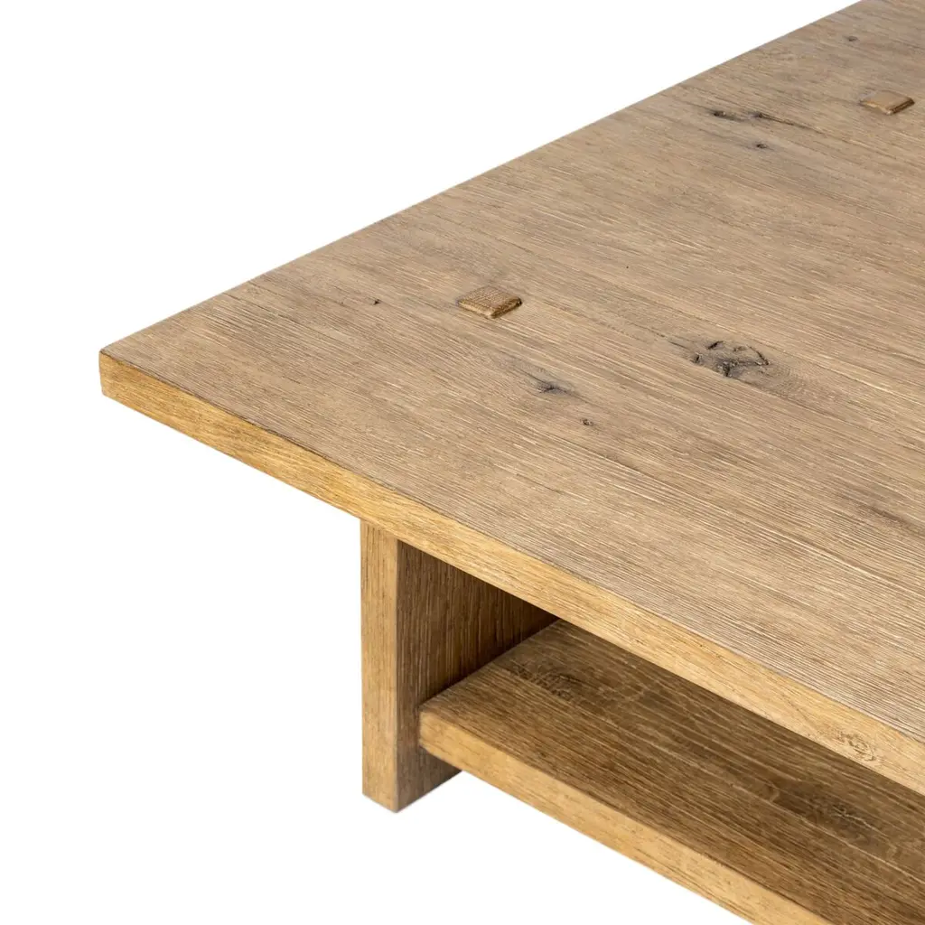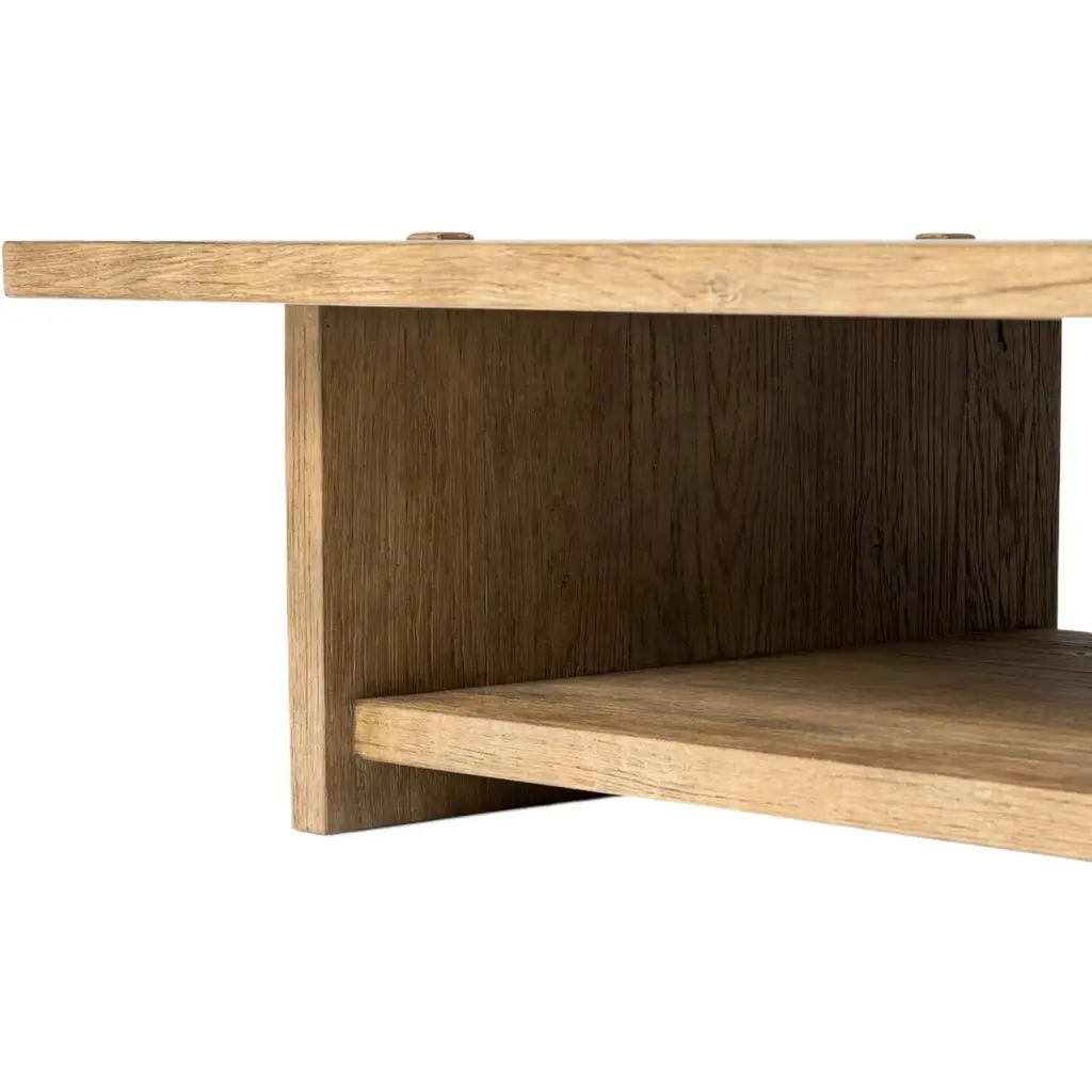 Simply shaped, material driven. A paneled coffee table features pull-through joinery, with lower shelving bringing bonus storage to your living space. A design collaboration by Amber Lewis and Four Hands.