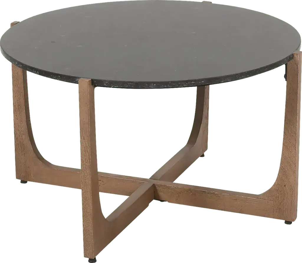 Deco-inspired coffee table by VUUE is a testament to simplicity. Circular top is supported by cast aluminum quarter-circle legs with an antique finish. Legs fit within hand-carved cutouts in the wooden tops. Wirebrushed for texture, acacia wood top is further enhanced by black stain and light lacquer. CB2 exclusive.