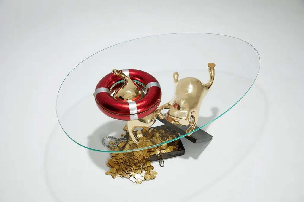 Zhipeng Tan’s ‘Treasures' coffee table embodies and further extends the concept of his most iconic collection, TanTan Collection. “This year, we have been forced to isolate yourself from one another to maintain safety. Although staying home has become our default lifestyle, it ironically reminds us of holidays and leisure time that we used to take granted of,’ says Zhipeng. This year, he further explores his imaginary leisure time that we completely lost due to COVID-19, and captured it in the unique and playful little human forms, TanTan. The Treasures Coffee Table illustrates TanTan scuba diving and finding treasures in the ocean. The rich luster and versatility of brass complement the spirited design, f?inding a harmonious fusion of sculpture and furniture, provocative objects of both beauty and utility.Zhipeng Tan'Treasure,' 2020TanTan CollectionBrass and glassMeasures: 20 H x 54 W x 37 D in50 H x 138 W x 93 D cm.
