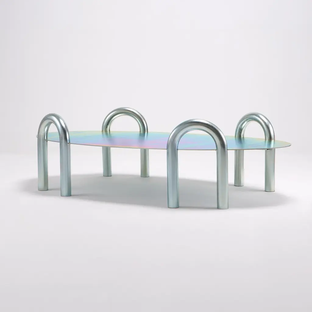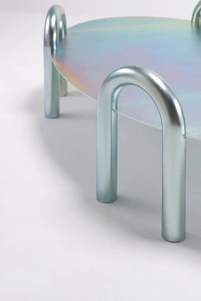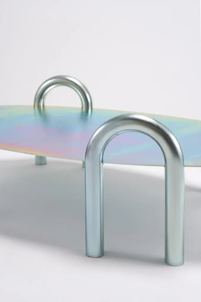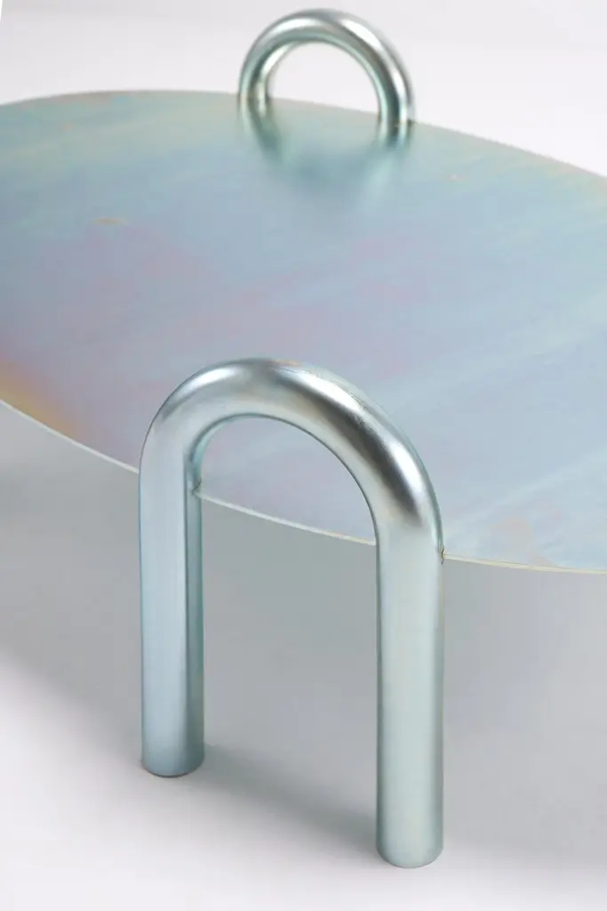 A common item in steel houses, the 180º curve is the starting point for the development of the collection. Using this element of industrial origin and organic format, we seek to create affable pieces, which transmit softness incorporated into the rawness of the material. In this version, we further reinforce its origin traces through white and yellow zinc plating, bringing to light this very common finish in the industry, but little appreciated outside of it.